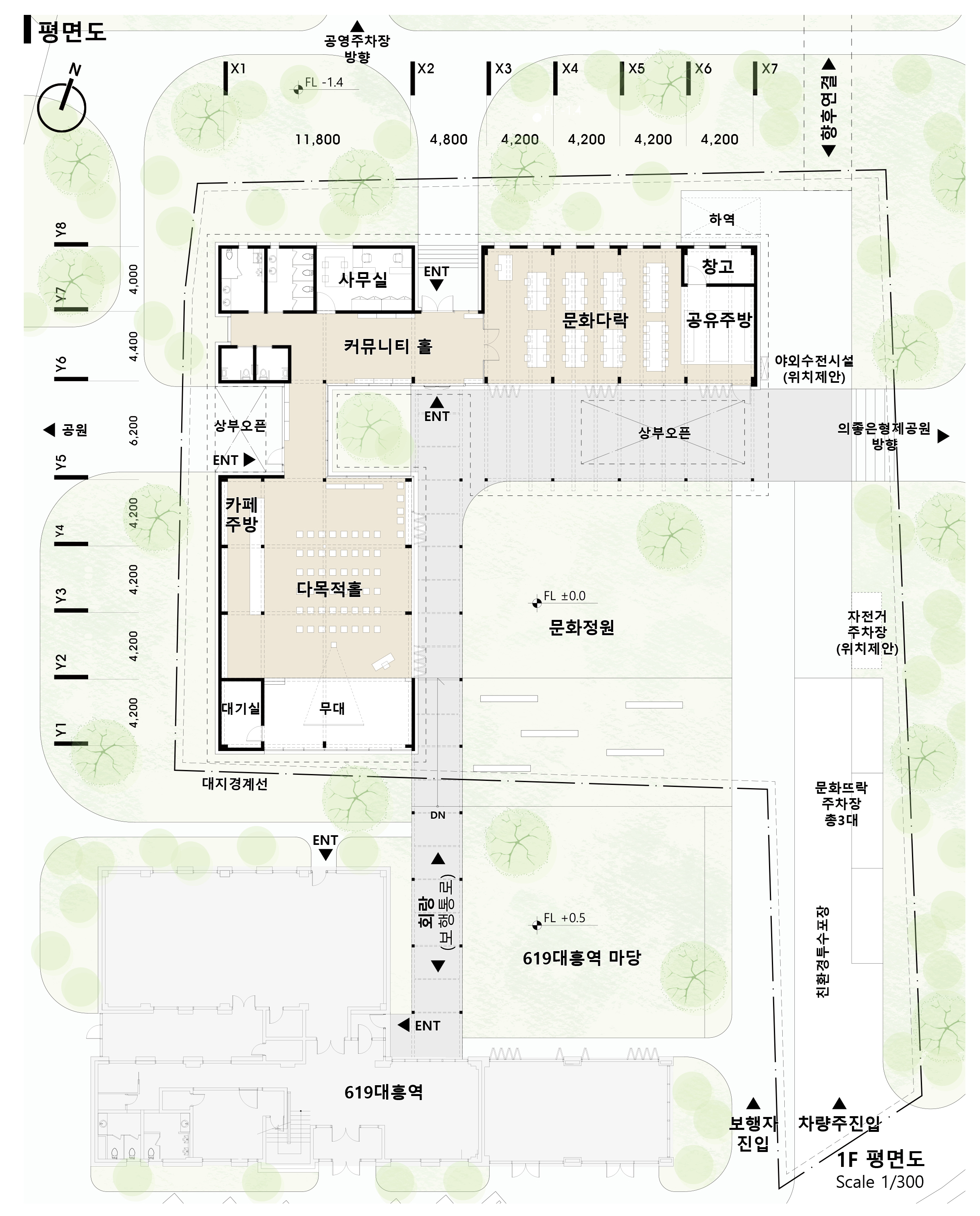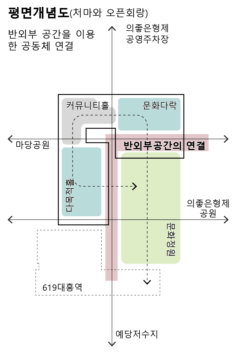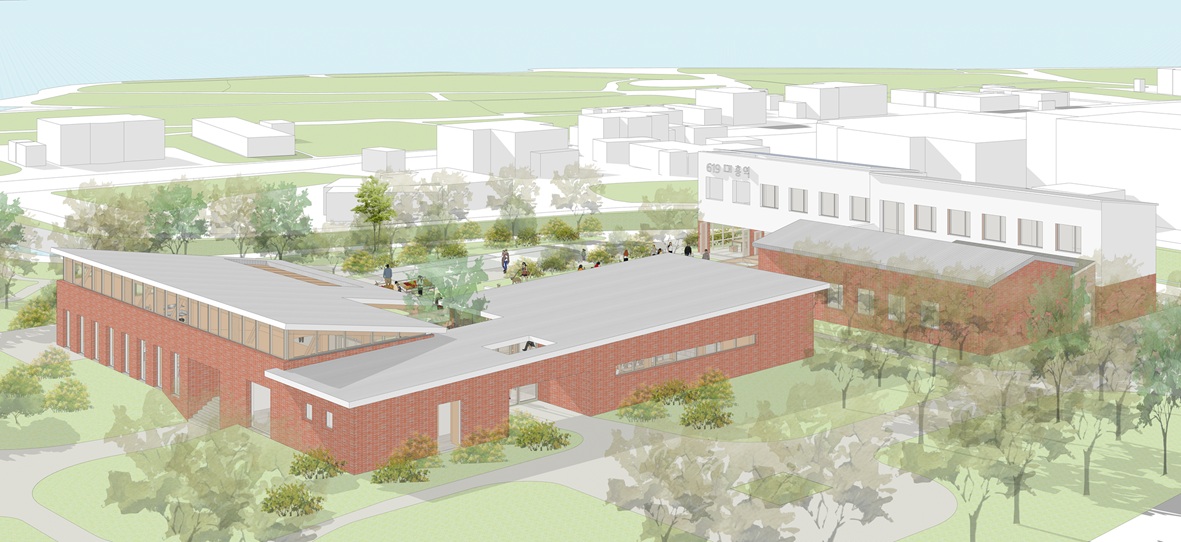 대흥면 문화뜨락 계획의 핵심은 “공원 속의 건축, 경계를 지우는 건축”에 있다. 문화뜨락은 기존 공원의 흐름을 이어가며, 건축과 공원이 유기적으로 연결되는 열린 플랫폼을 지향한다. 따라서 건축은 공원을 가르는 장벽이 아니라 공원을 연결하는 시각적·공간적 통로로 작동하며, 지역 주민과 방문자가 자연스럽게 교류할 수 있는 열린 매개체가 된다.
