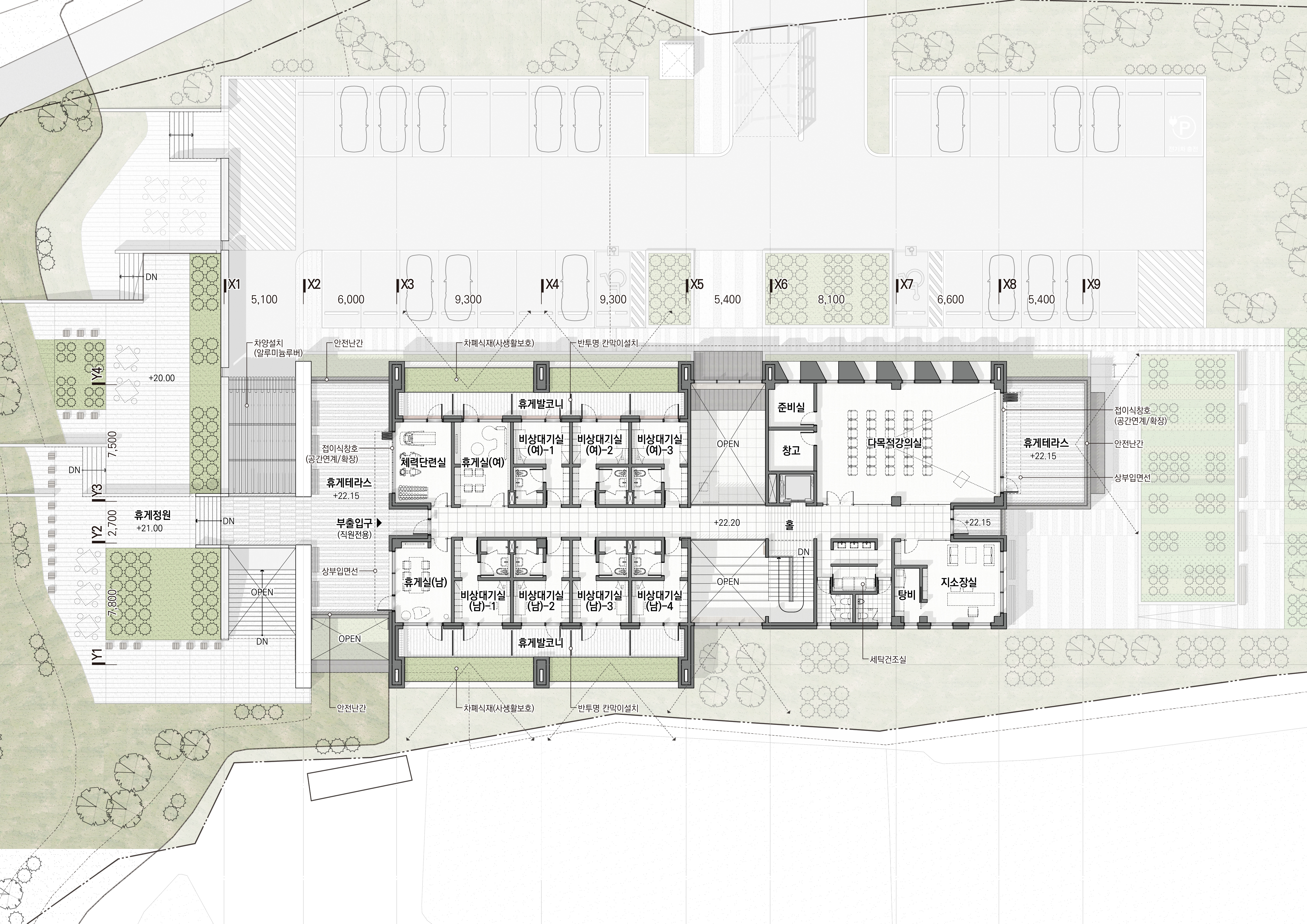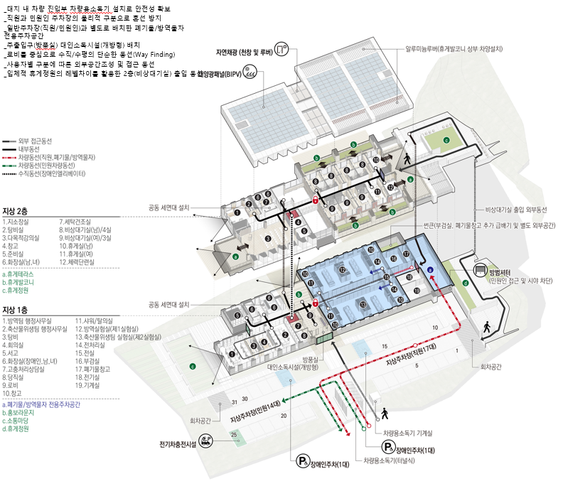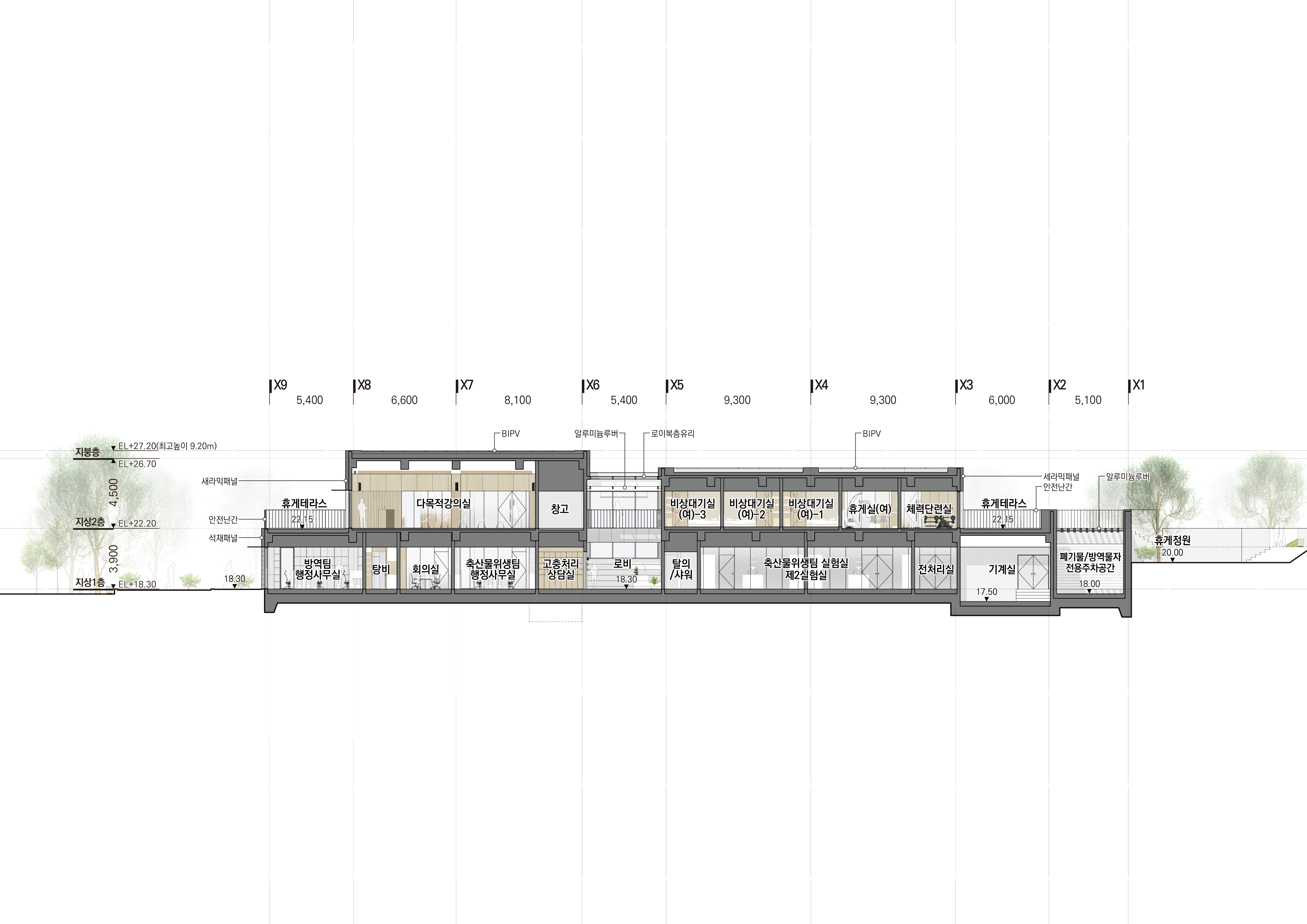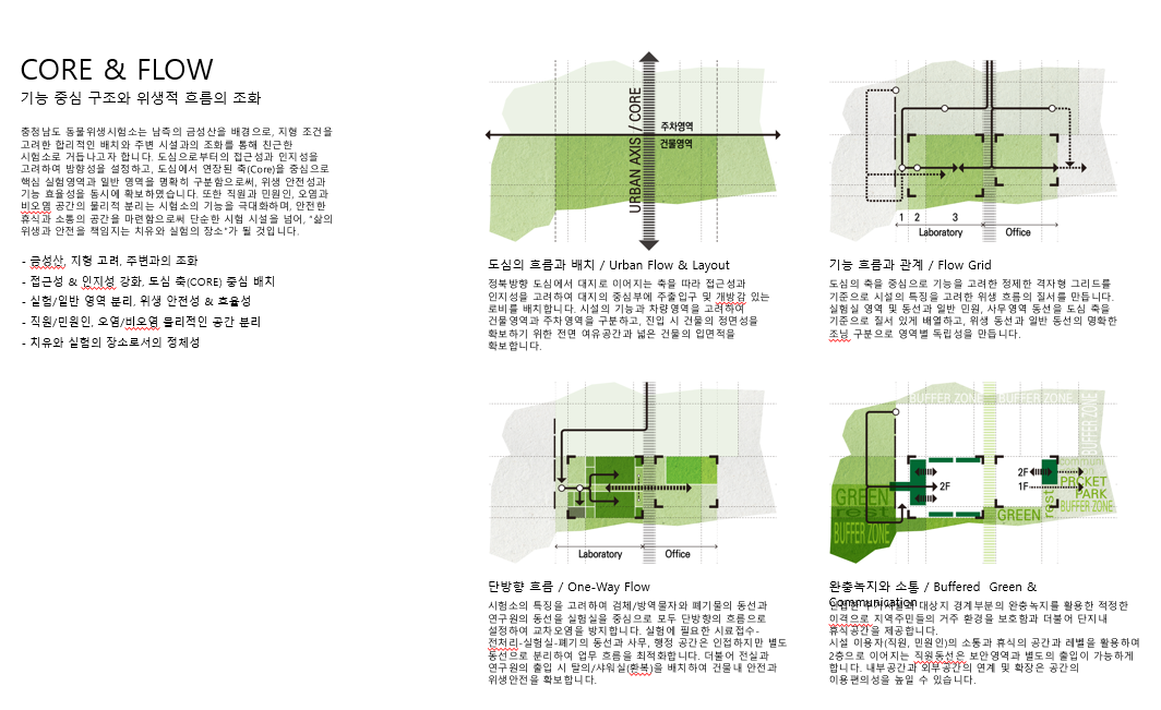 충청남도 동물위생시험소는 남측의 금성산을 배경으로, 지형 조건을 고려한 합리적인 배치와 주변 시설과의 조화를 통해 친근한 시험소로 거듭나고자 합니다. 도심으로부터의 접근성과 인지성을 고려하여 방향성을 설정하고, 도심에서 연장된 축(Core)을 중심으로 핵심 실험영역과 일반 영역을 명확히 구분함으로써, 위생 안전성과 기능 효율성을 동시에 확보하였습니다. 또한 직원과 민원인, 염과 비오염 공간의 물리적 분리는 시험소의 기능을 극대화하며, 안전한 휴식과 소통의 공간을 마련함으로써 단순한 시험 시설을 넘어, “삶의 위생과 안전을 책임지는 치유와 실험의 장소”가 될 것입니다.