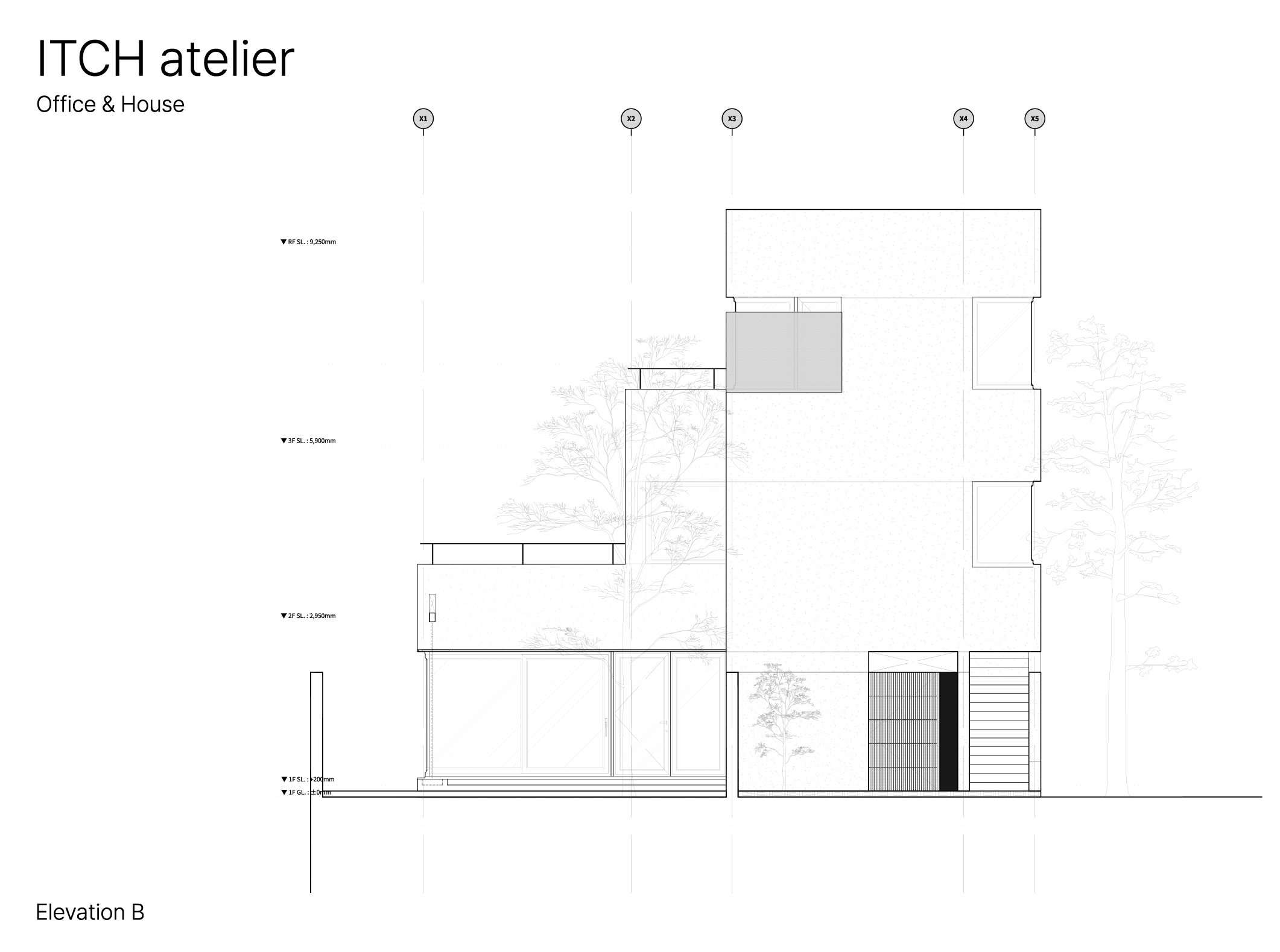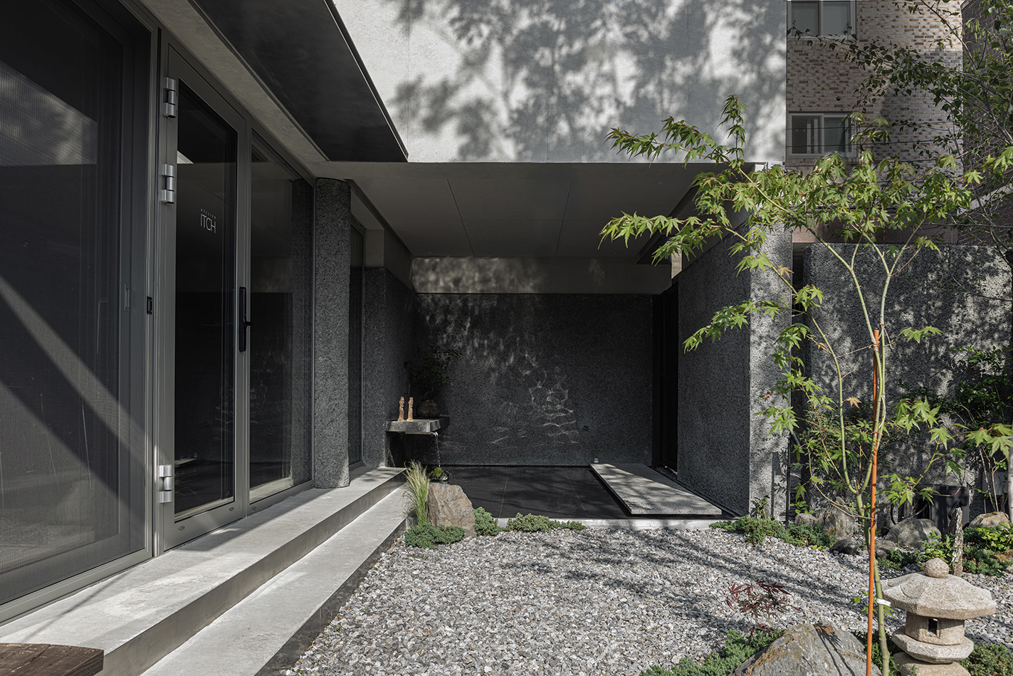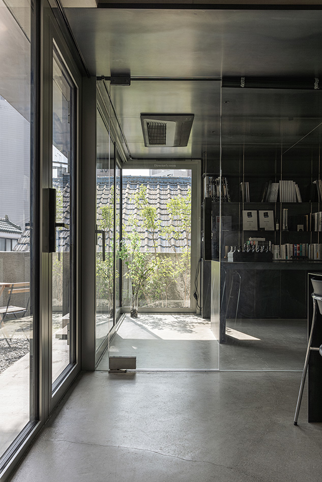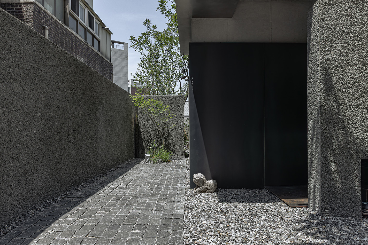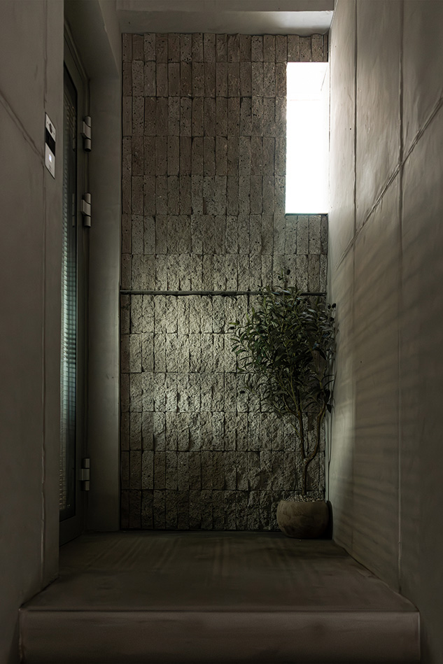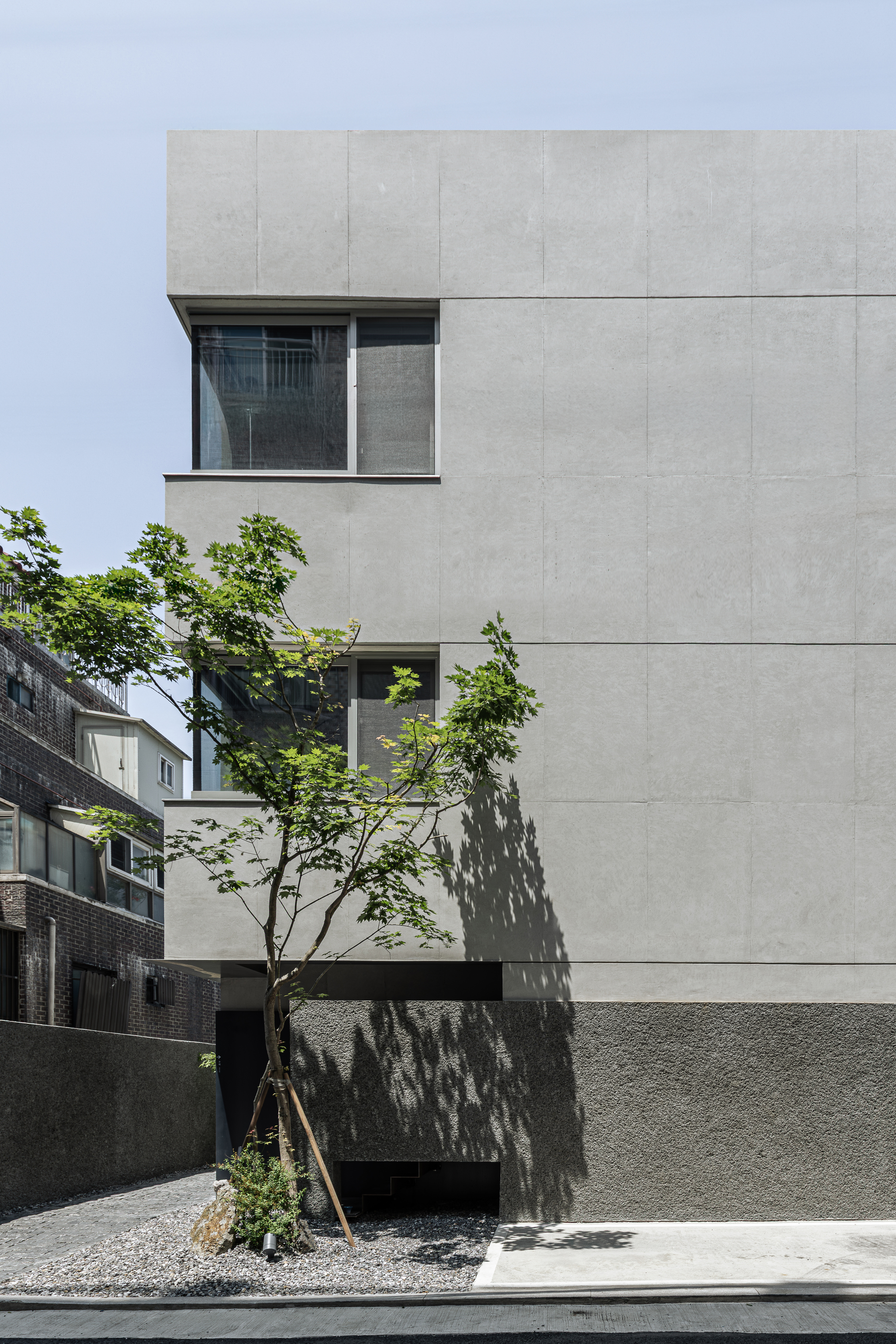 건물의 소재는 본연의 색과 성질이 강하지 않은 소재들로 구성했다. 노출 콘크리트는 자칫 차가울 수 있으나 세월의 흐름이 자연스레 묻어나는 소재이자 자연의 빛을 가장 자연스레 담을 수 있는 순수한 소재라고 생각했다. 건물의 하부에는 같은 시멘트 소재이지만 거친 자갈을 섞어 뜯어내듯 거친 표면으로 마감한 '각기오도시'라는 미장 마감을 사용해, 노출콘크리트와 같은 소재이나 빛의 형태감을 다르게 담아내고자 했다. 노출 콘크리트의 부드러운 면과는 대비되지만 동일 소재로서 연결되고, 모든 면이 빛을 담지만 재질감의 차이로 빛과 그림자가 담기는 방식이 달라 자연의 빛이 만들어내는 표현을 더욱 극대화하고자 했다. 더불어 사무실과 주택으로 들어가는 각 입구에 구로철판을 사용했는데 짙은 먹색과 특유의 금속 결이 콘크리트와 조화되고, 비가 닿고 시간이 지남에 따라 자연스럽게 색이 변하는 성질을 통해 '자연을 담는 공간'을 표현하고자 했다.
