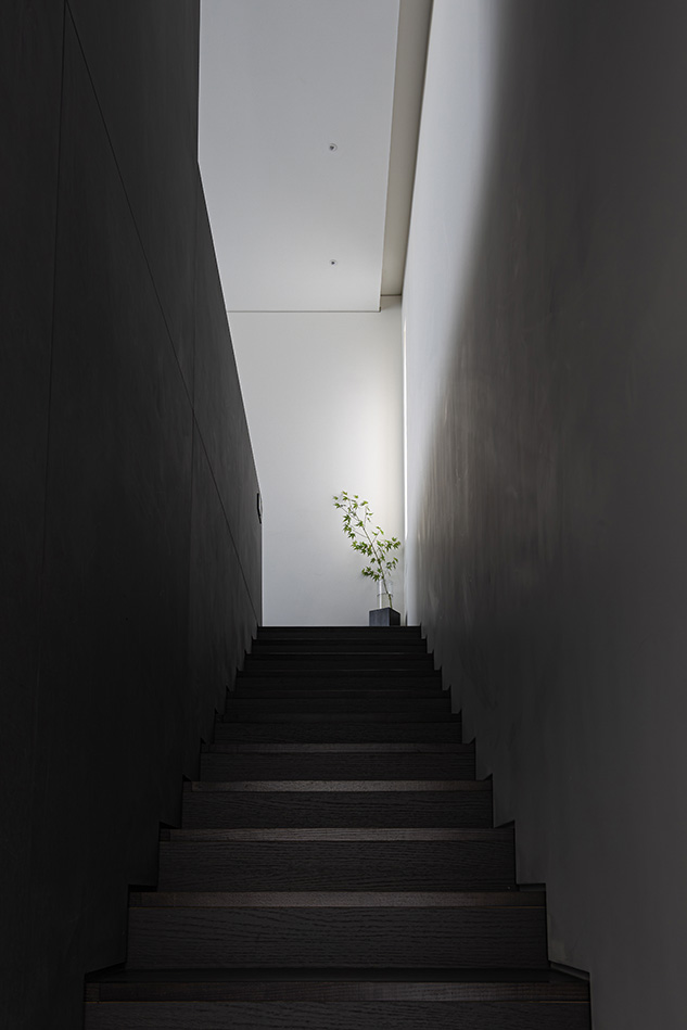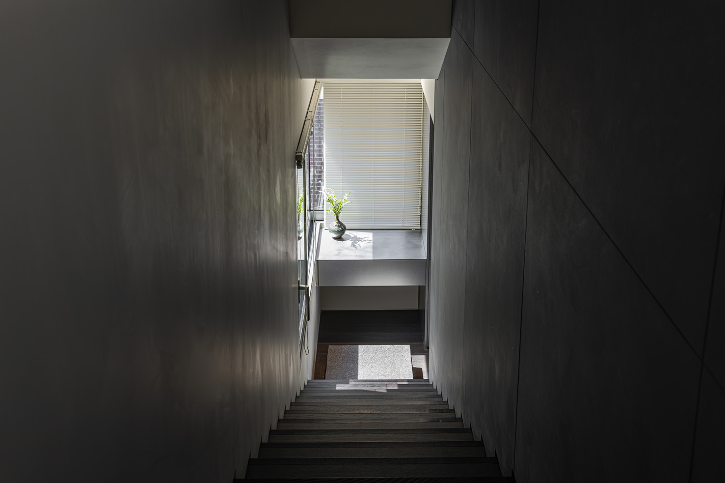 2층과 3층은 직접 거주하는 공간으로 계획되었다. 외부 소재와 마찬가지로 소재가 가지고 있는 색이나 힘이 강하지 않은, 자연의 색을 공간에 담을 수 있는 채도가 높지 않은 소재를 주로 사용했다. 흑색의 MDF와 석재 느낌의 타일, 스텐 그리고 백색의 도장으로 무채색의 공간을 구성했다. 대신 빛과 자연으로 닿을 수 있는 부분을 적극적으로 열어 정원의 나무와 서향의 빛을 공간 안으로 끌어들였다. 2층으로 들어서면 현관이 긴 복도로 전이공간의 개념으로 형성되고, 상하부장으로 나뉘어지는 수납장으로 거실공간과 분리된다. 시선보다 낮은 높이의 공간을 열어 거실 공간과 기능적으로 분리하되 공간감은 열리도록 했다. 현관을 지나 돌면 서향으로 크게 열린 창과 함께 주방과 거실 공간을 마주한다. 서향으로 열려있는 창 앞으로 주방 공간을 거실과 테라스로 열리듯 구성했다. 상부장과 후드를 없애 군더더기를 줄이고, 창 밖 풍경과 마주할 수 있도록 했다. 주방을 지나 3층으로 올라가는 계단을 향하면, 백련산의 뷰를 담는 코너창과 창 아래 작은 선반 공간을 마주한다. 백련산과 지나가는 사람들을 지켜보는 고양이를 위한 공간이다. 건물 전면에 있는 단풍나무가 보이는 창이기도 하다.