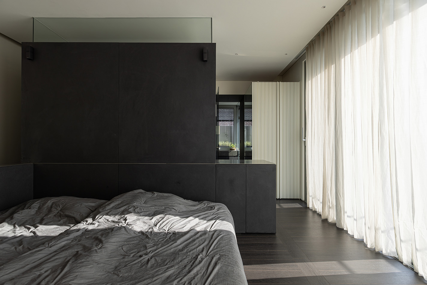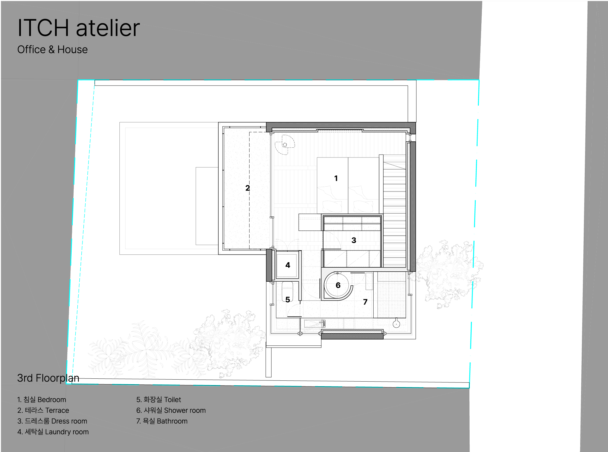 3층은 침실과 드레스룸, 욕실로 구성되는 공간이다. 침실은 서향의 빛과 풍경을 가장 잘 담을 수 있는 공간으로, 넓은 창과 함께 테라스를 두어 여유로운 흐름을 느낄 수 있도록 했다. 드레스룸을 구성하는 벽체는 천장과 30cm 정도의 여유 폭을 두어 벽으로 막히는 것이 아니라 뒷공간이 연장되어 보여 공간의 확장성이 느껴질 수 있도록 했다. 30cm의 여유폭을 둔 벽체의 끝 라인은 욕실로 들어가는 출입구의 천장과 높이가 맞고, 침실의 야외 테라스로 가는 창, 세탁실의 문과 높이를 모두 맞추었다.