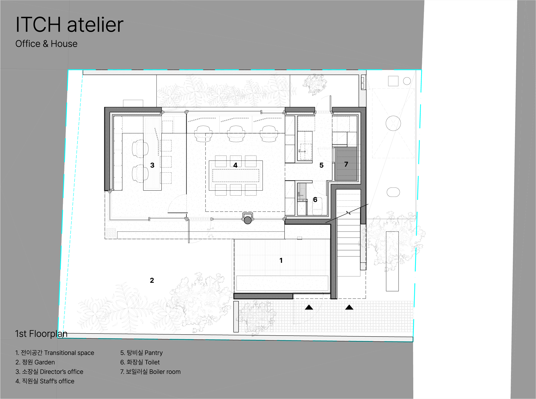 1층 공간은 전이공간과 정원을 바라보는 남쪽면 전체를 길게 창으로 열고 서향의 빛을 받는 끝 쪽은 ㄱ자 코너창으로 열어두었다. 남쪽의 정원과 함께 서향의 빛까지 극적으로 받아들이기 위함이다. 가로로 긴 공간의 형태감에 남향의 ㄱ자 창이 길게 열려 가로로 긴 공간의 흐름이 만들어지고, 공간 내부를 구성하는 직원실 책상이 소장실까지 연결되는 흐름, 그 흐름을 따라 북향에 길게 형성된 가로로 긴 창을 통해 가로로 긴 흐름을 만들어 공간의 통일감 있는 흐름을 만들고자 했다. 북쪽에 배치된 정원은 직원실 책상에 앉아서 바라볼 수 있는 정원으로, 화단의 높이를 책상 높이까지 지대를 땅와 좀 더 가까운 소통을 할 수 있는 창으로 계획했다.