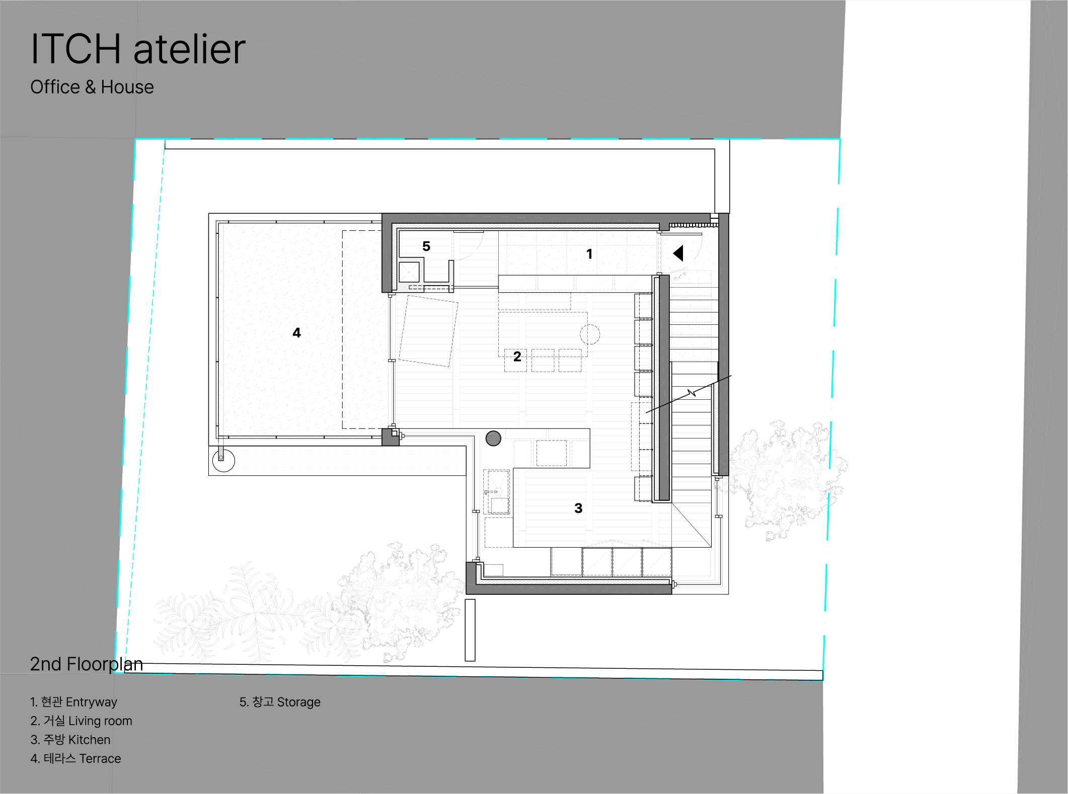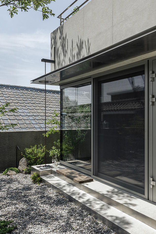 건물의 출입구는 담장과 바닥 사고석을 따라 깊숙히 안쪽으로 들어와 마주할 수 있도록 배치했다. 담장을 따라 긴 통로 끝에는 안쪽 마당이 들여다 보이는 담장, 그리고 담장을 배경으로 하는 바이텍스 나무가 자리하고 있다. 대문의 간살은 빗각으로 내부 사무실 공간이 들여다 보이지는 않지만 내부 전이공간의 물소리를 어렴풋이 들을 수 있다. 대문을 열면 정원으로 들어서기 전 전이공간이 나타나는데, 지붕이 덮히는 공간을 물에 떠있는 디딤돌을 지나 들어올 수 있는 전이공간으로 두었다. 서향의 빛이 정원으로 들고, 마당에 있는 9미터 높이의 회화나무 그림자가 건물 전체를 뒤덮는 시간이면 전이공간에는 나무 그림자가 들고 그 빛으로 인해 생긴 물의 일렁임이 전이공간 전체에 맺힌다. 물이 흐르는 소리, 물이 빛을 받아 반짝이는 일렁임, 백련산에서 내려오는 숲의 향, 서향빛의 따스함 등 자연을 오감으로 느끼며 자연을 더욱 풍성하게 받아들일 수 있도록 한 공간이다. 전이공간을 지나면 비로소 서쪽으로 넓게 열리는 정원공간을 마주하게 된다. 정원의 끝, 사무실 창과 연결되는 처마 끝에는 2층 테라스에서 연결되는 우수관을 처마와 연결하여 비가 오는 날의 빗물의 흐름과 소리 또한 정원의 한 풍경이 될 수 있도록 했다.