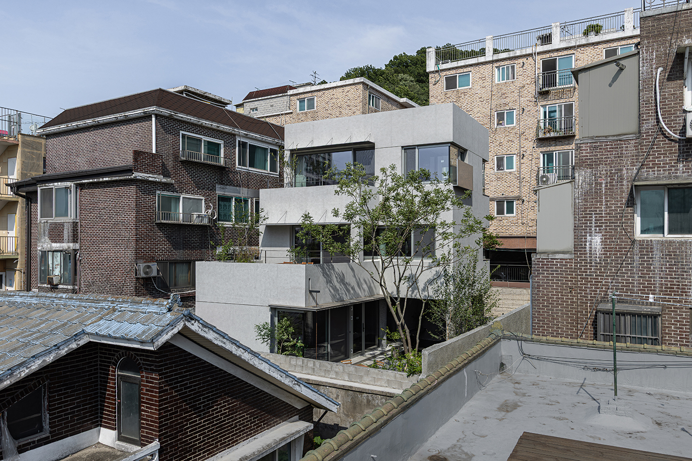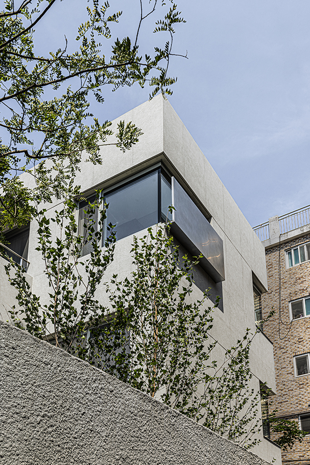 건물의 형태는 단아함에 대한 우리의 생각을 디테일과 선정리로 표현하고자 했다. 노출콘크리트를 시공할 때 거푸집은 합판을 사용하는데, 콘크리트를 보다 부드러운 텍스쳐로 표현하기 위해 코팅 테고합판을 사용하였다. 합판이 이어지는 부분으로 인해 콘크리트에 메지 라인이 만들어지게 되는데, 외피의 면을 따라 선이 맞고, 외부와 면하는 창문의 높이, 테라스 난간의 높이까지 모두 같은 메지 라인으로 맞춰지도록 했다. 창문 상부에는 보다 깊은 메지라인을 인위적으로 넣어 이러한 선 정리의 간결함을 더욱 부각시키고자 했다. 외부의 창은 내부 공간의 싱크대, 세면대의 하부장 등 가구의 높이와 맞춰져 있어 군더더기로 보일 면을 최소화했다. 건물의 첫인상인 앞면은 단단한 덩어리인 듯 단정하게 정리하고, 건물의 뒷면은 산세가 담긴 토지의 지형을 담았다. 건물 정면의 창은 자연을 담을 수 있는 최소한의 창만을 열어두었다. 백련산이 보이는 부분을 코너창으로 열고, 건물 전면 7m 높이의 단풍나무로 창 밖의 뷰를 조성했다. 3층 가장 끝부분 작은 창은 남향의 빛이 잠깐 드는 오전 시간의 빛을 들이기 위한 작은 창이다.