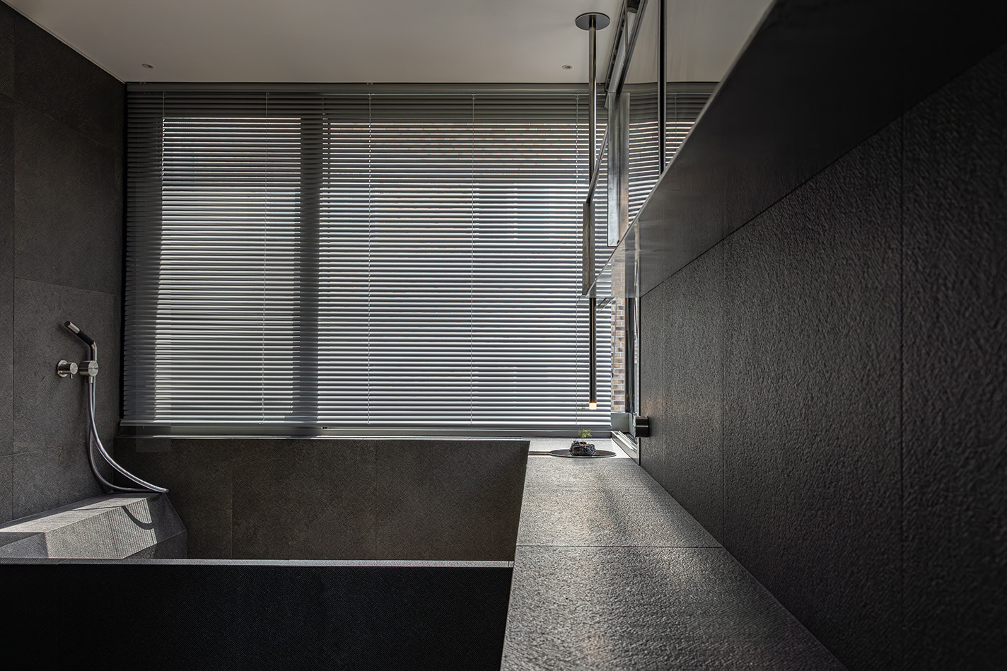 욕실은 동향과 서향의 창을 가로로 길게 이어주는 세면대의 가로로 긴 흐름을 기준으로 욕조공간-샤워실-출입구-화장실로 이어진다. 좁은 공간이지만 세면대 양쪽으로 트여있는 창으로 개방감을 주면서도, 백련산이 보이는 큰 창이 있는 욕조는 비일상의 경험을 선사한다. 물이 솟아오르는 듯한 토수구와 그 뒤로 보이는 백련산의 풍경을 바라보며 하는 입욕의 공간은 샤워시간을 중요하게 생각하는 거주자에게 영감과 환기를 줄 수 있는 공간이길 바랬다. 밖으로 열리듯 설계된 욕조공간과 반대로 매일 사용하는 샤워실은 한 사람 들어갈 수 있는 정도의 크기로 원형으로 구성하여 몸을 감싸는 듯한 아늑함을 느낄 수 있도록 했다.