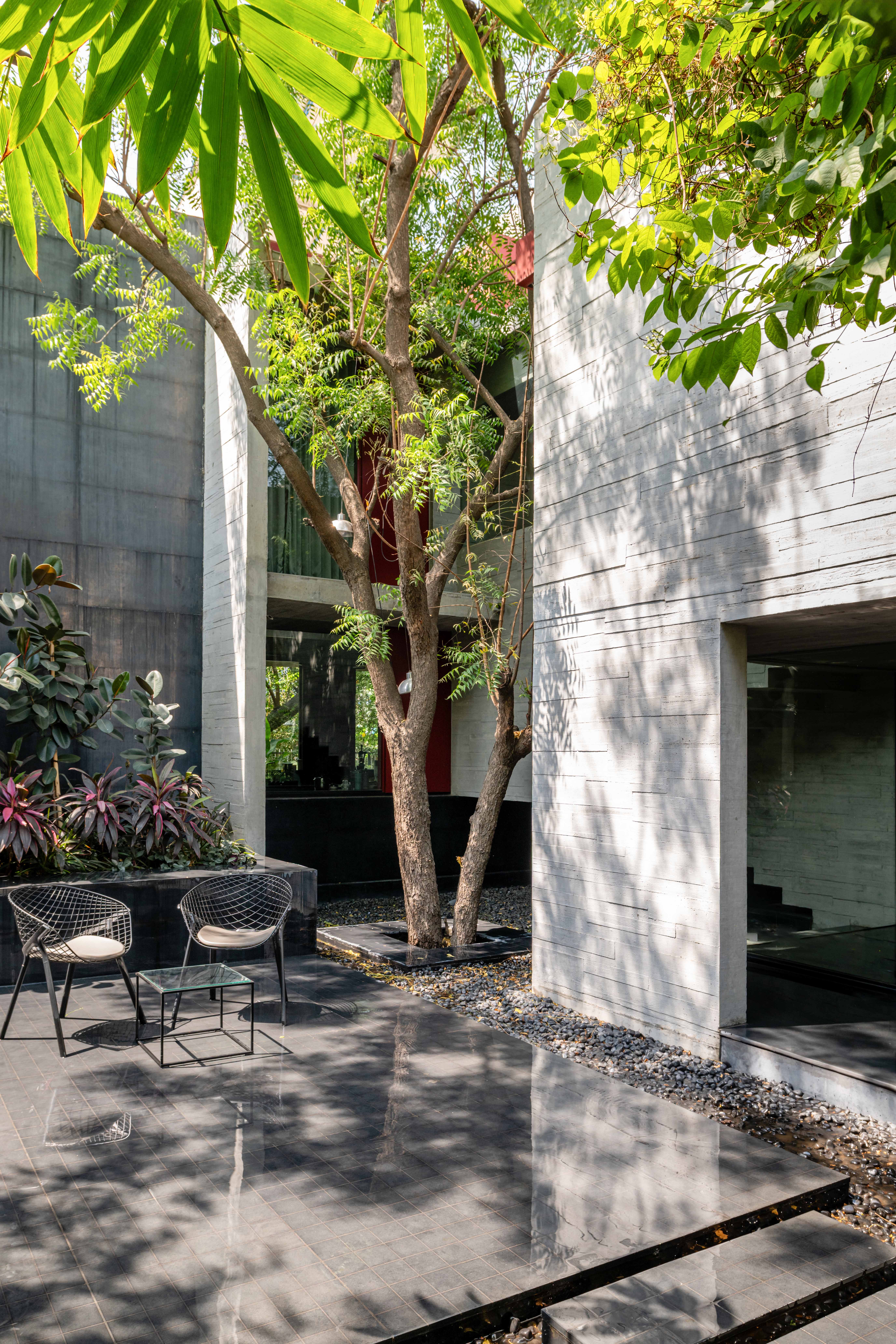 대부분의 경우 건축가가 설계에 착수하기도 전에 대지의 나무와 식생은 잘려나가지만, 이번 프로젝트의 클라이언트는 1000㎡ 대지에 있던 23그루의 님 나무를 모두 보존하기를 원했다.
