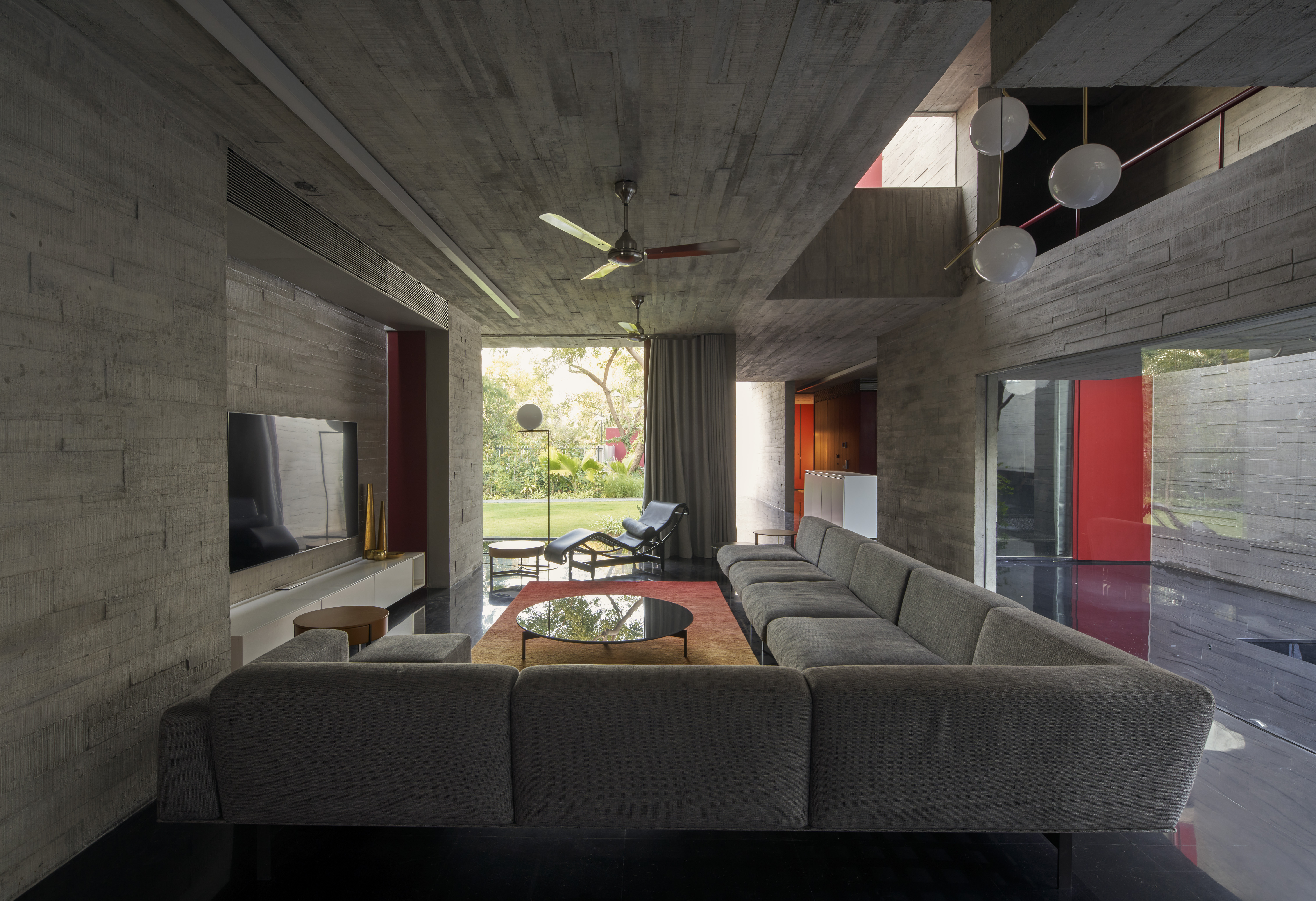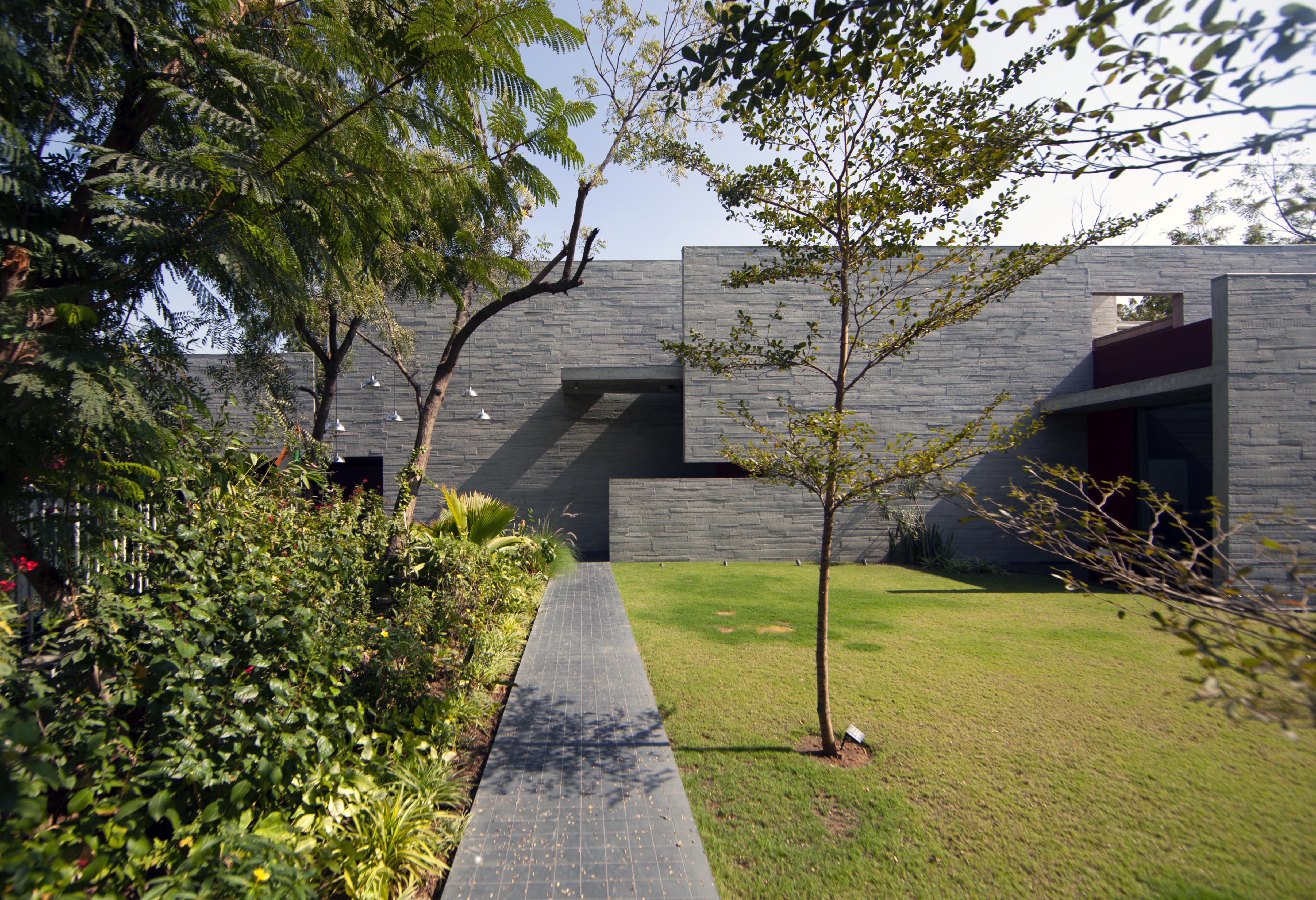 건물은 거친 목재 거푸집으로 제작된 콘크리트로 이루어졌으며, 이는 현재 건축가의 지적 재산권으로 등록되었다. 일반적인 노출 콘크리트에서 보이는 수직·수평의 연속적인 이음매가 없어, 표면은 햇빛의 변화에 따라 다양한 질감을 드러낸다. 바닥은 차가운 어두운 쿠다파(Kudapah) 사암으로 마감되었고, 문과 패널 같은 가변적 요소는 테라코타 색조로 제작되었다. 그중 맞물려 회전하는 상·하부 패널로 구성된 맞춤형 정문은 즐거움을 주는 요소이다.