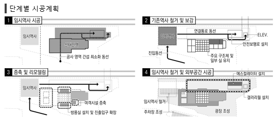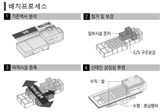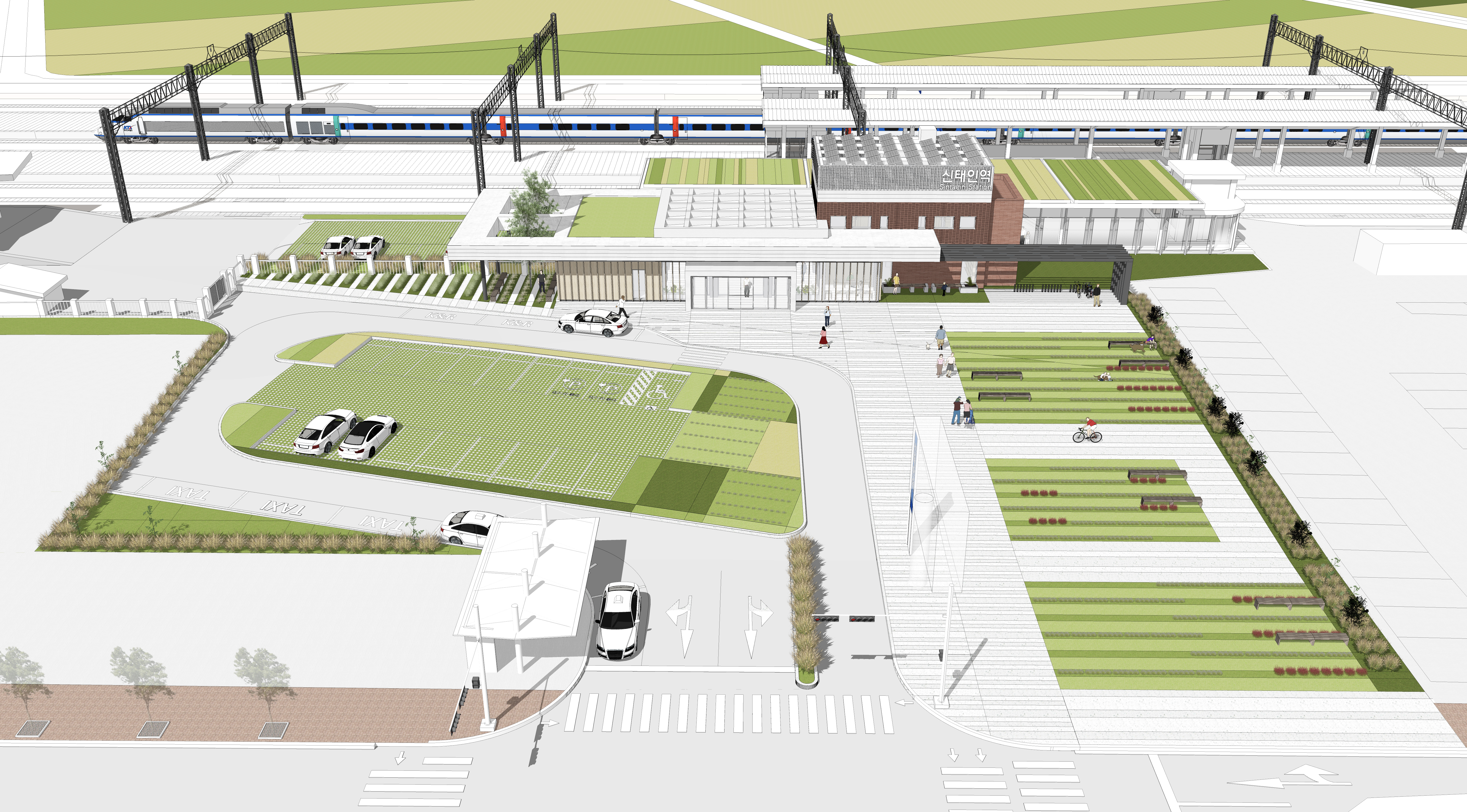 수평/적층이라는 두 개념을 통해 이곳의 과거와 현재, 그리고 미래를 연결하는 새로운 조형과 공간 디자인을 제안합니다. 지붕 구조를 포함한 여러 겹의 수평적인 요소는 넓고 평탄한 호남평야의 지형적 특성을 상징합니다. 이를 통해 신태인 지역의 정체성을 건축 형태로 시각화 하고자 했습니다. 과거의 농업 유산 / 곡물창고의 기억 / 전쟁과 피란의 흔적 / 오늘날 주민들의 일상의 의미를 지니는 조형 구성의 물리적 구조는 단순한 역사적 복원이 아닌, ‘기억의 재해석’을 통한 감성적 회복을 의미합니다. 콘코스와 역사 전면부는 열린 광장으로 확장되며 주민들의 감정을 어루만지고, 공감할 수 있는 공간으로 자리 잡을 것입니다. 이 공간은 과거 사람들이 모이던 마을의 중심지 역할을 현대적으로 되살리며, 단순한 미관을 넘어서 정체성과 공공성, 그리고 감정의 기억을 담은 진정성 있는 공간이 되길 기대합니다.