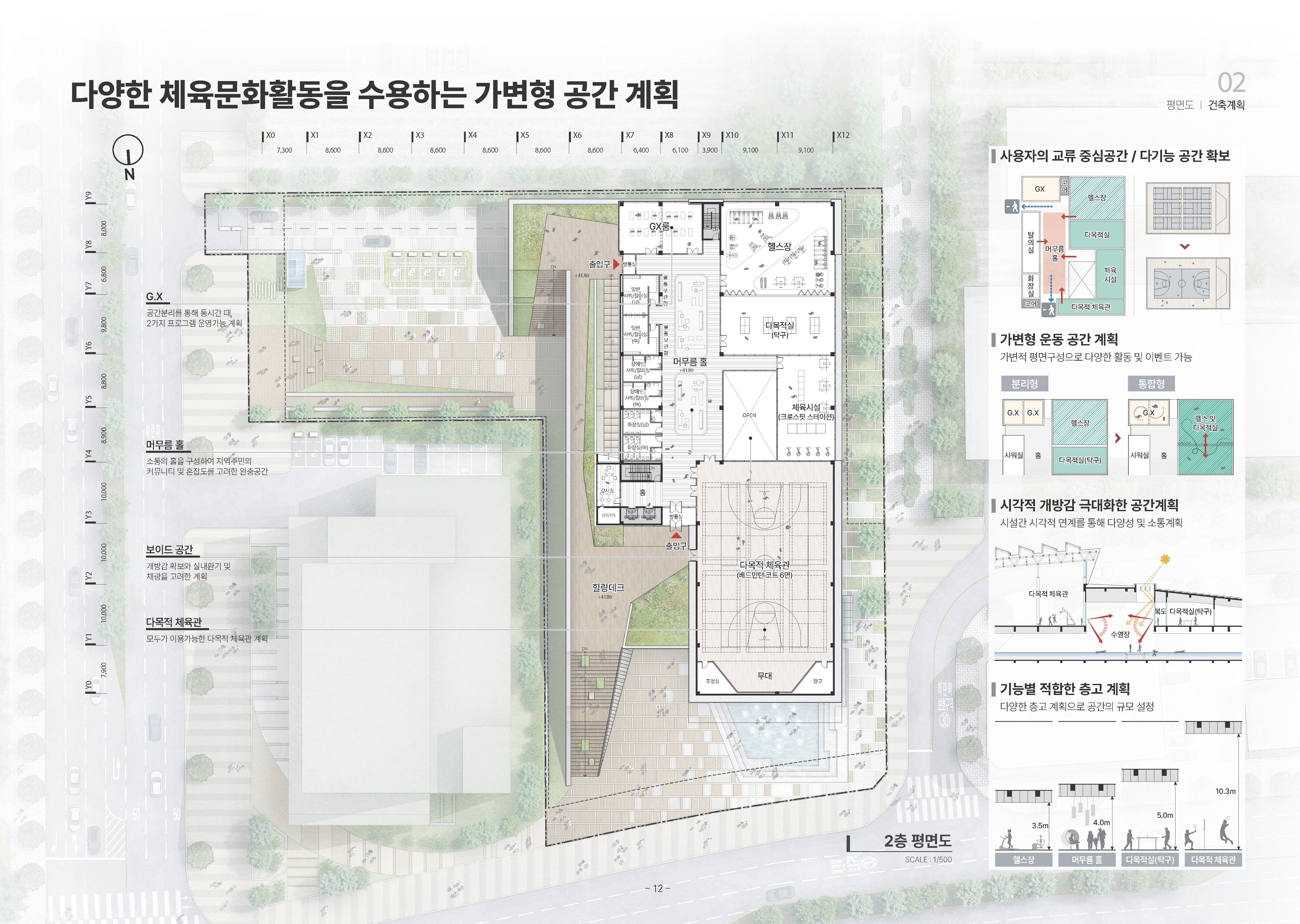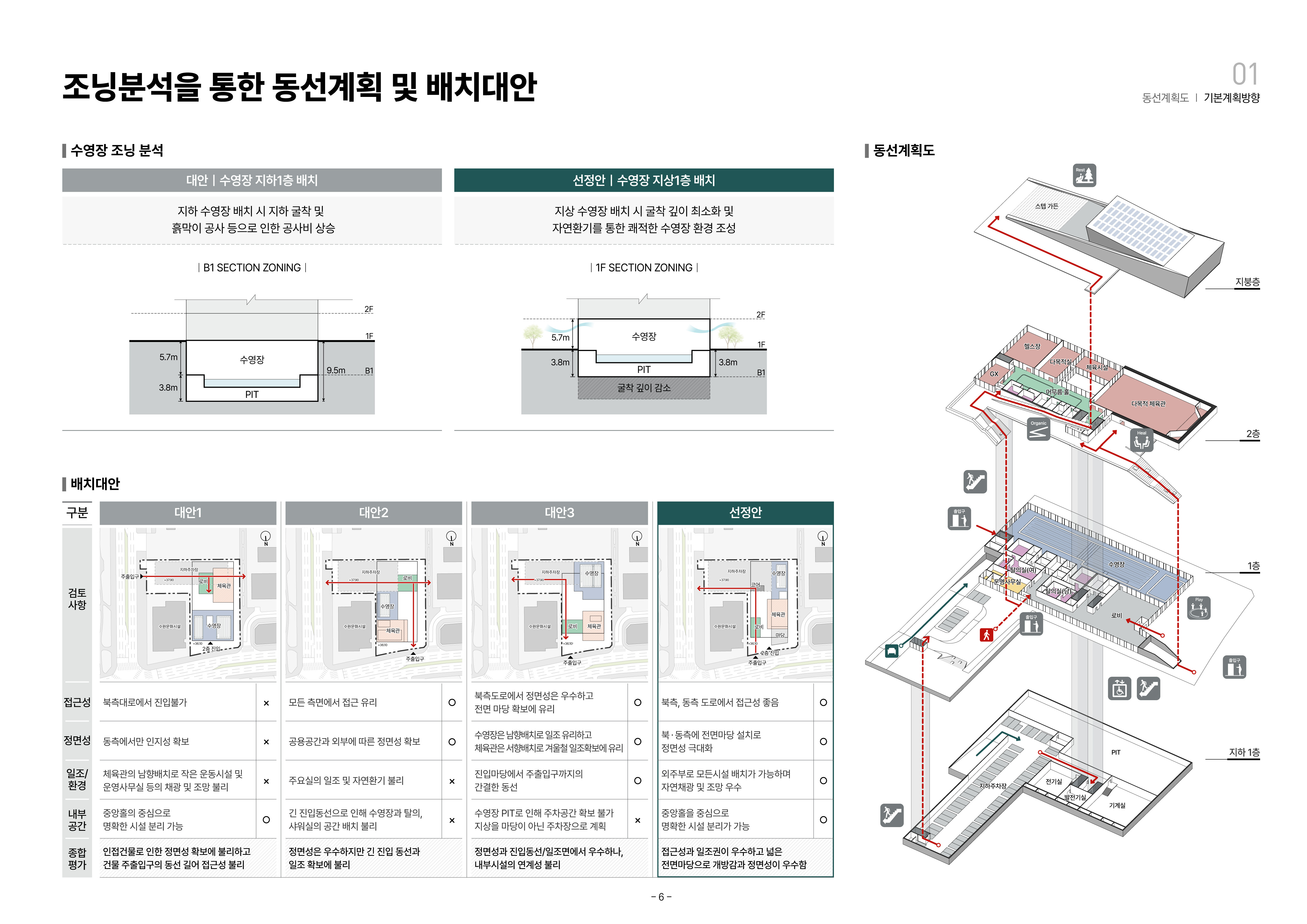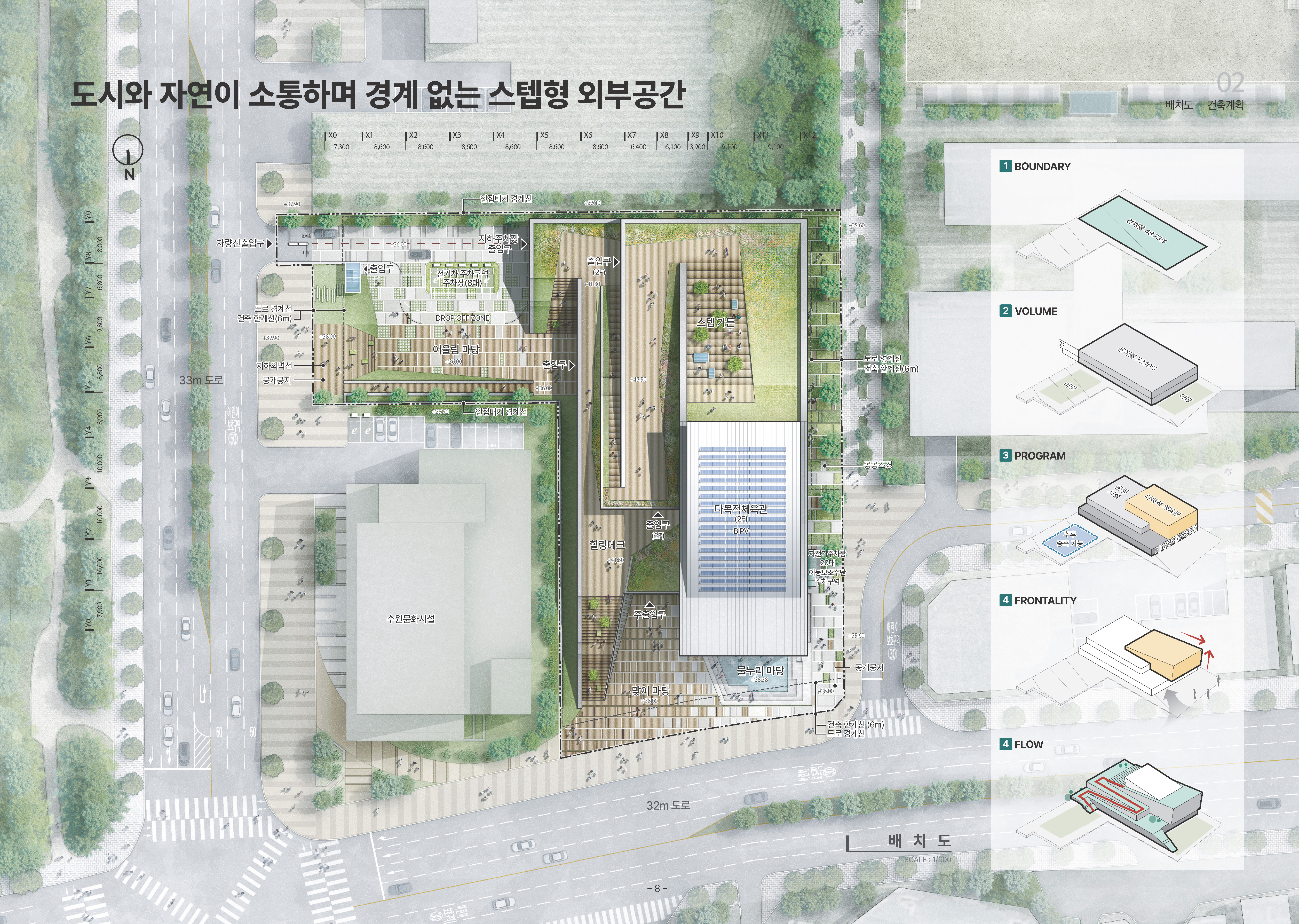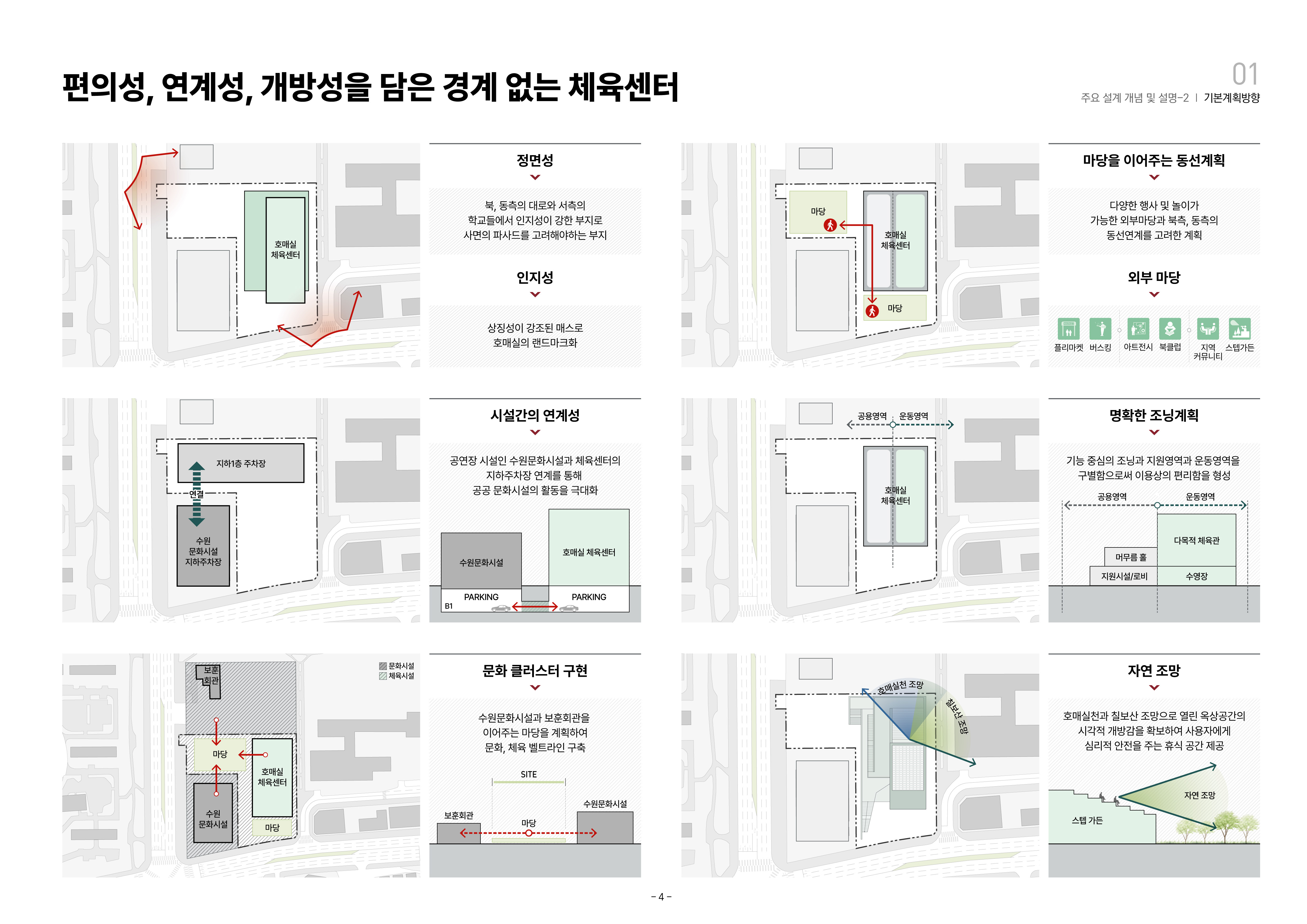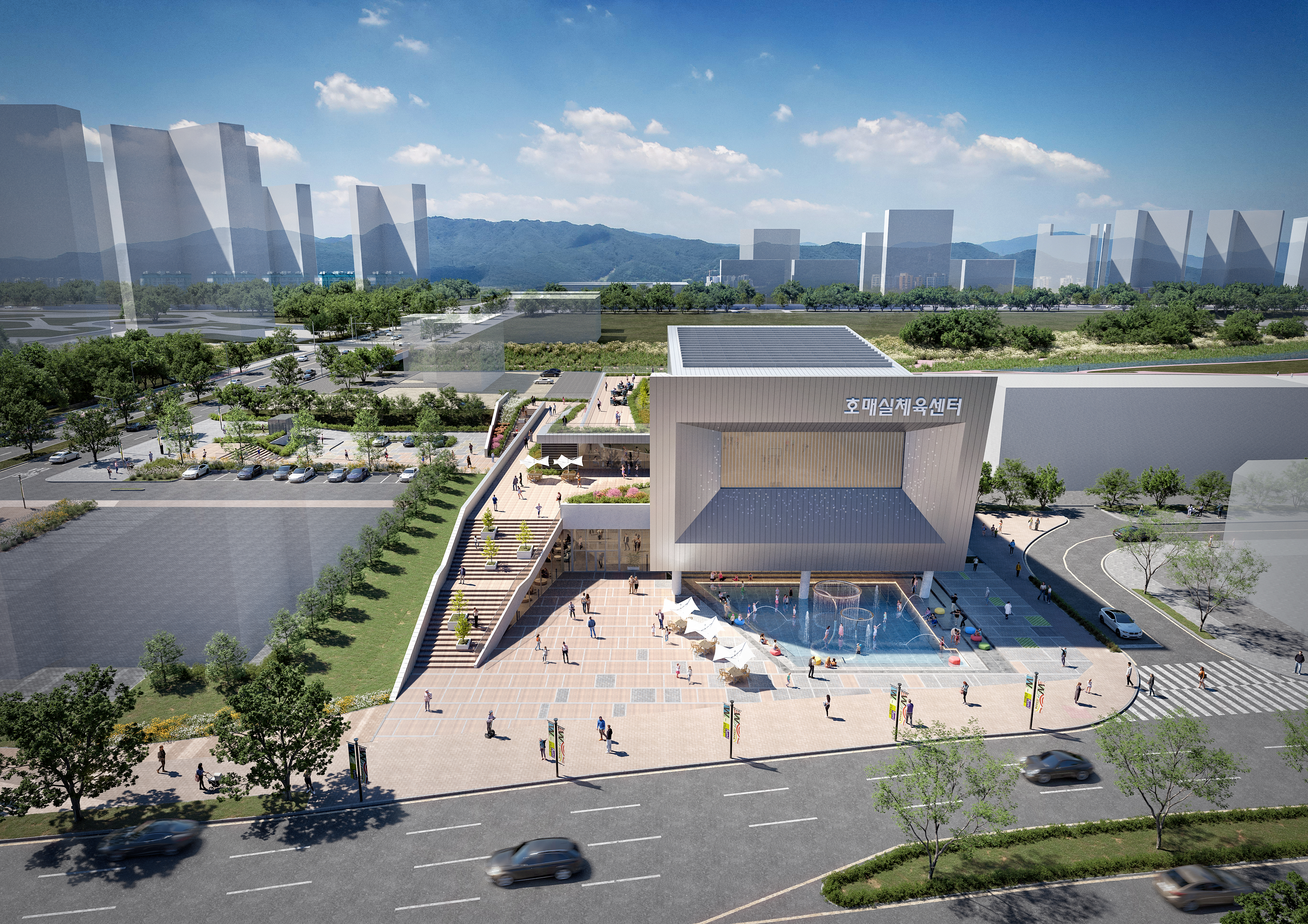이 프로젝트는 단순한 체육시설이 아닌, 누구나 자연스럽게 소통하고 휴식하며 놀이를 즐길 수 있는 경계 없는 공공건축물을 지향한다. 설계의 주안점은 다방향에서의 인지성과 접근성, 인근 문화시설과의 연계성, 남북 공공축의 중심으로서의 문화 클러스터 구현, 그리고 시민 모두에게 열린 다목적 마당과 향후 증축까지 고려한 명확한 조닝 계획이며 칠보산과 호매실천을 담아내는 입체적 데크와 옥상 스텝가든은 자연과 도시를 잇는 특별한 경험을 제공하고자 한다. 지상 1층에 수영장에 배치된 수영장은 가변형 시스템을 도입하여 25m 레인과 50m 레인으로 변환이 가능하며, 생활체육부터 수구, 아쿠아로빅 등 다양한 프로그램들로 활용할 수 있는 수영장을 적용했다. 2층 체육관 및 운동시설은 독립적이고 가변적인 공간 구성을 하였다. 이를 통해 다양한 체육ㆍ문화 활동의 지역소통 플랫폼을 제안한다.