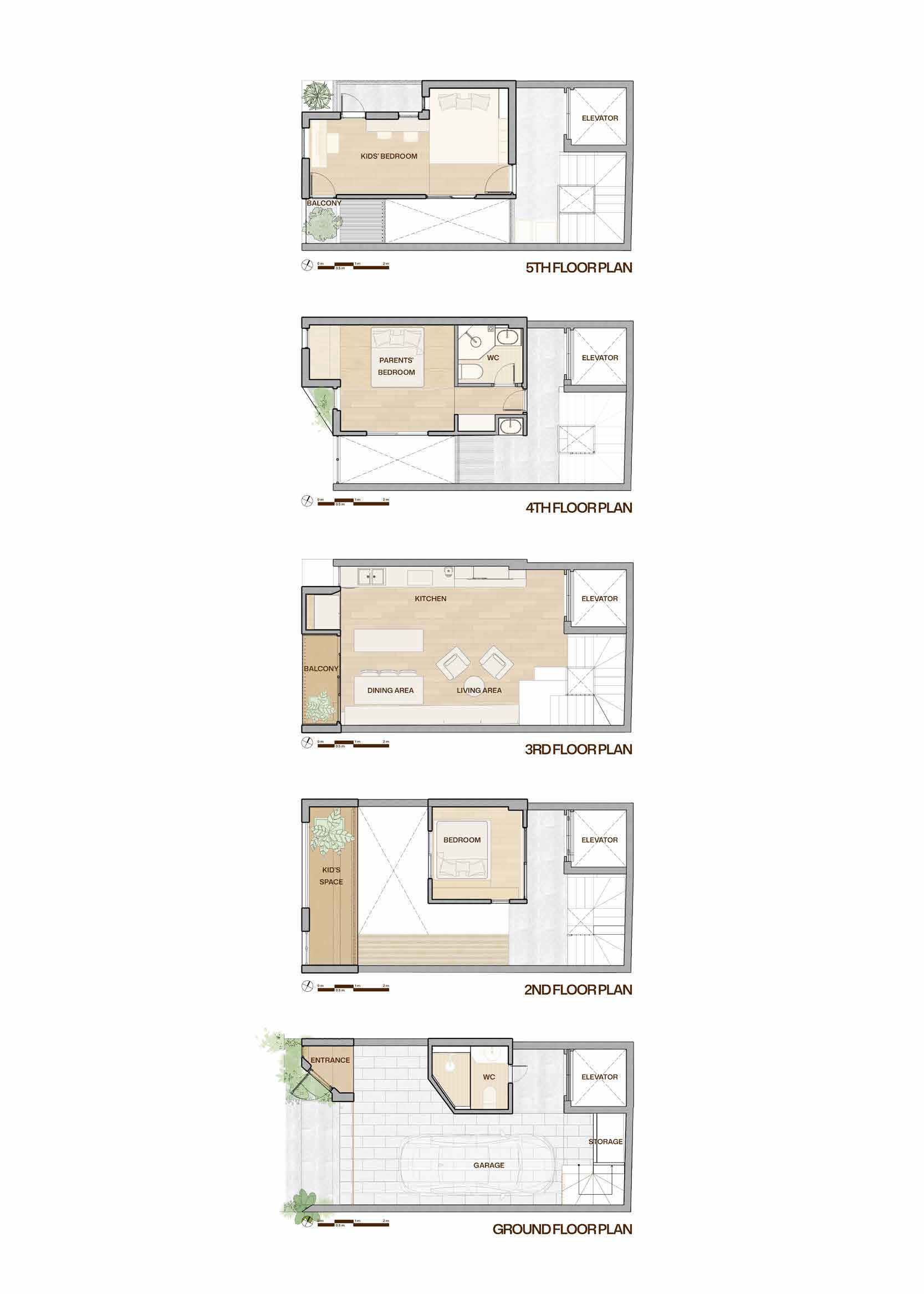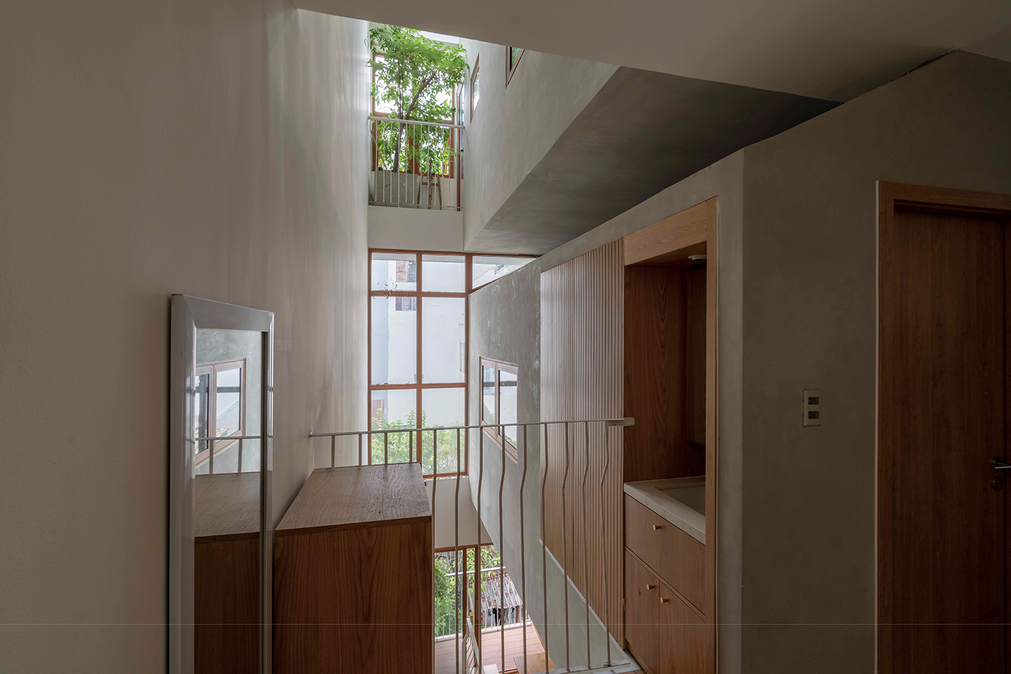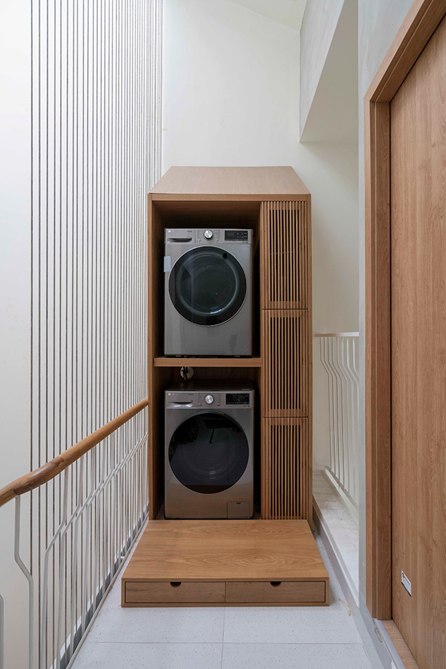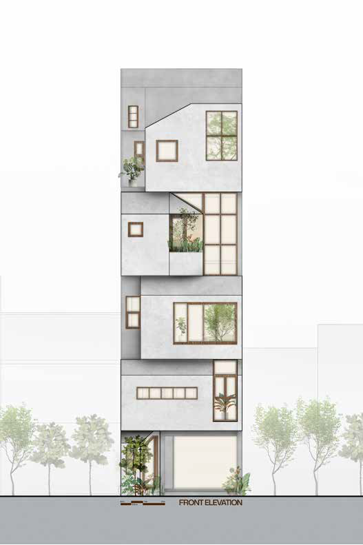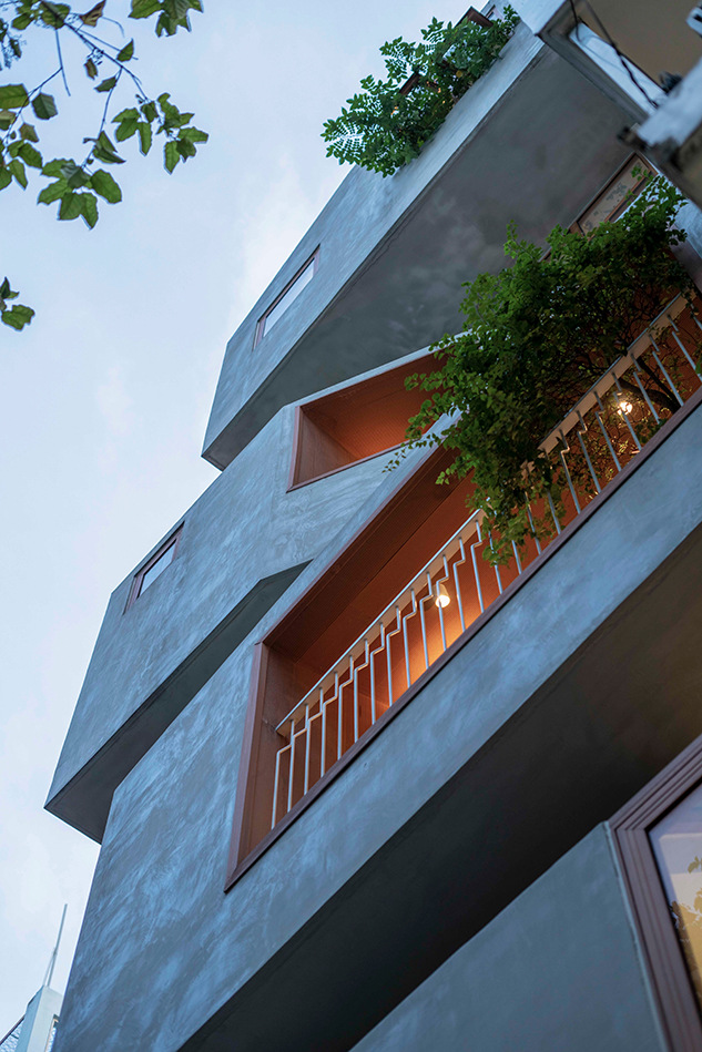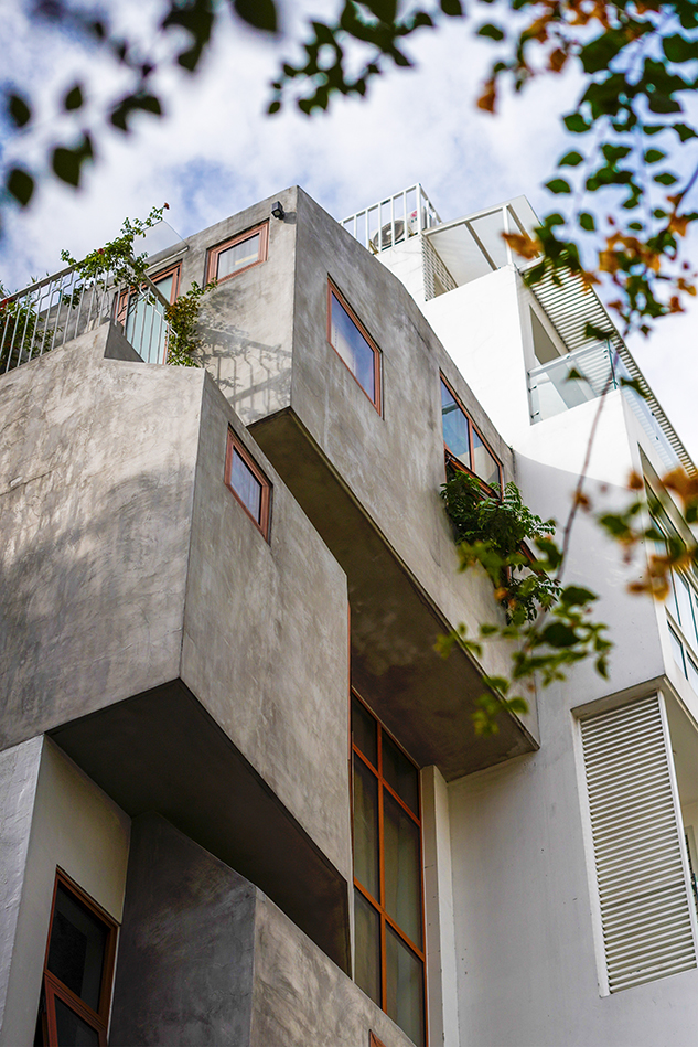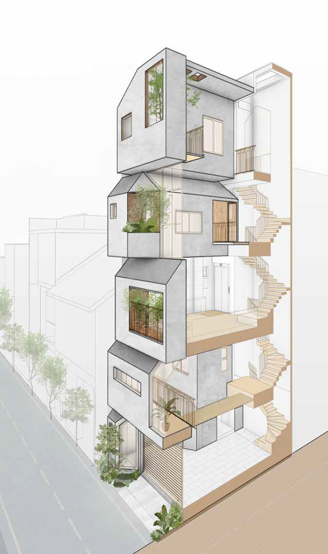 호치민에서 타운하우스는 여전히 가장 흔한 주거 유형이며, 그 건축적 표현은 다양하다. 이러한 유형을 설계하는 일은 창의적 시도이자 구조적 도전이다. 티티의 하우스는 단순한 박스형 매스를 적층하고, 경사지붕을 얹어 어린 시절 상상 속 작은 집을 연상시키는 형태로 외관을 완성했다. 이는 부모가 자녀들에게 주고 싶었던 ‘개별적인 작은 보금자리’라는 감정을 익숙한 건축 유형 속에 담아낸 방식이다. 각각의 박스는 아이들이 자유롭게 탐험하고 창의적으로 쓸 수 있는 개인의 공간이 되지만, 문을 열면 부모의 웃음과 부름이 들려온다. 가족의 따뜻한 존재감이 집 구석구석에 스며 있다.