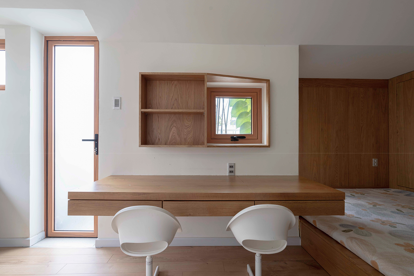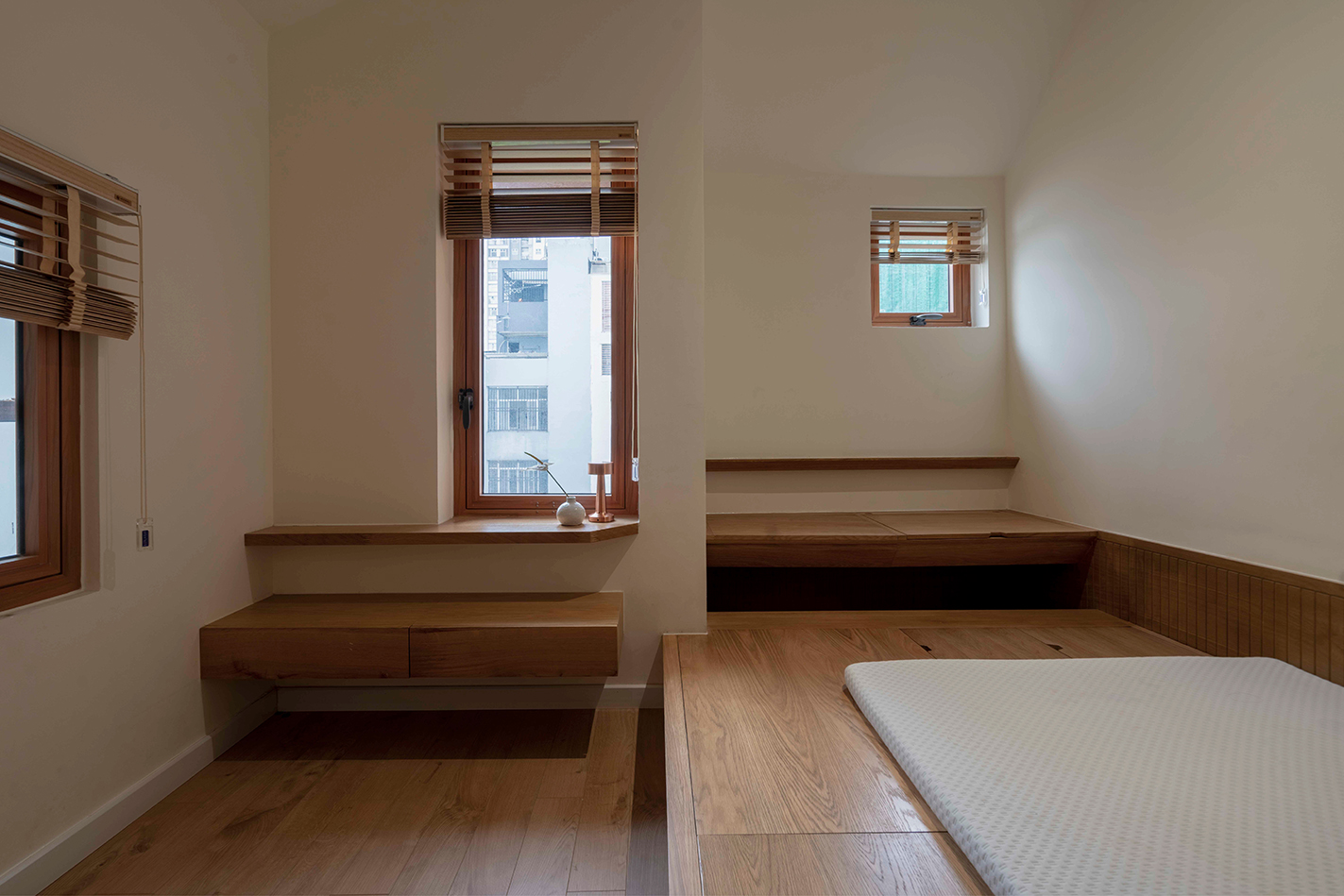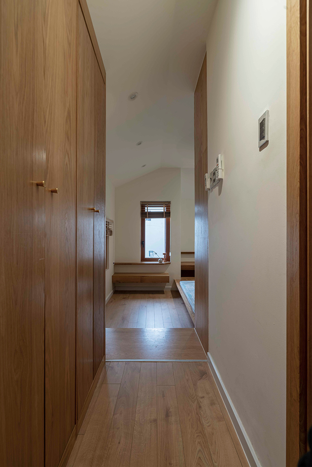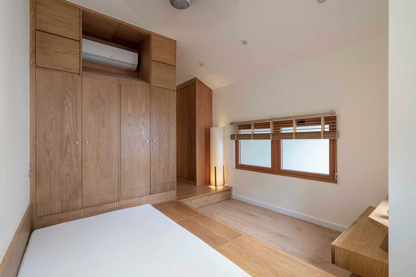 재료는 폐쇄감을 피하기 위해 신중하게 선택되었다. 흰 벽과 회색 천장은 중립적 배경을 만들고, 목재 디테일과 녹색 식재는 부드럽고 평온한 분위기를 더한다. 침대 하부 수납과 같은 통합형 가구는 공간을 과밀하게 하지 않으면서도 다양한 기능을 담아낸다. 가구의 형태는 건물의 경사지붕 실루엣을 반영하여, 내부 디자인과 건축적 외형 사이의 연속성을 만들어낸다.