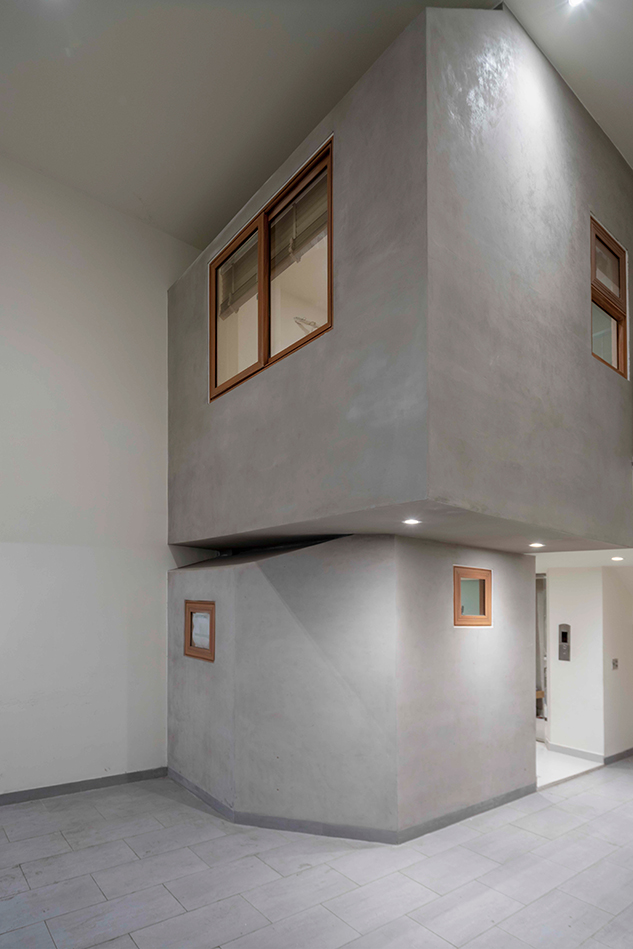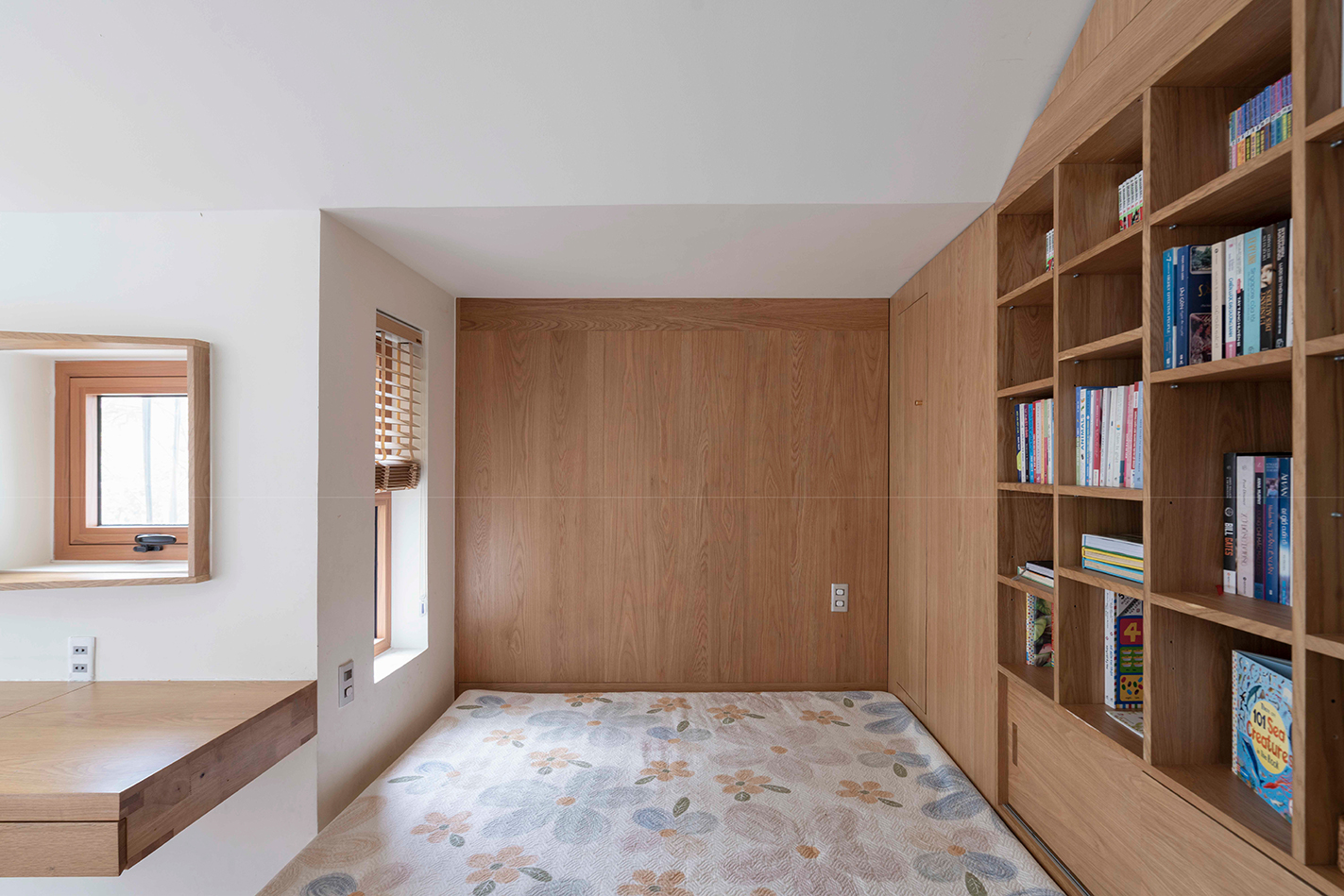 이를 위해 개방형 공간 구성, 절제된 재료 팔레트, 통합형 가구 솔루션이 도입되었다. 모든 면적을 극대화하기보다는 중앙에 천창을 설치해 답답한 협소주택의 느낌을 완화했다. 더운 날씨에는 굴뚝 효과가 발생해 뜨거운 공기가 상승하며 개방된 창을 통해 빠져나가 하부 공간을 시원하게 유지한다. 그러나 이 천창은 단순한 환기 장치에 그치지 않고 가족을 연결하는 매개가 된다. 거실에서 들려오는 티티의 피아노 소리는 집 전체로 퍼지고, 주방에서 풍기는 음식 냄새는 위층으로 스며든다. 소리와 향이라는 무형의 요소가 공간의 확장으로 작동하는 것이다.