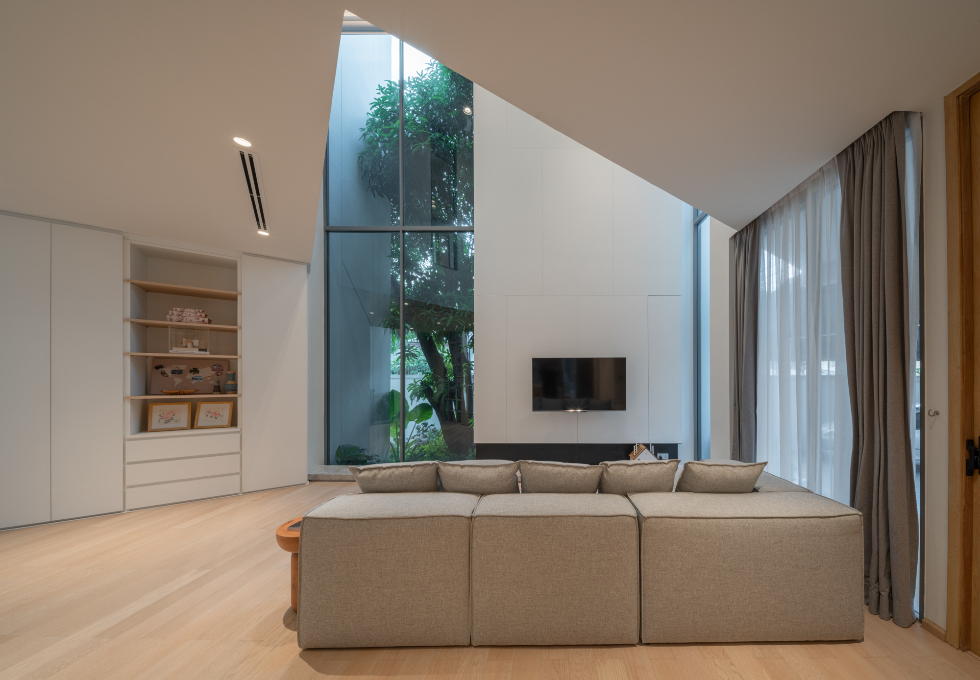 외관은 수직으로 기울어진 평면들이 조합된 형태로, 프라이버시를 확보하면서 실제 건물을 외부로부터 은폐한다. 개구부는 나무의 뷰를 특정 실로 연결하기 위해 선택적으로 배치되었다. 수직 면의 상단은 지붕 슬래브 위로 돌출되어 옥상 테라스의 난간 역할을 겸한다. 외장은 패턴이 새겨진 흰색 질감 페인트로 마감되어 독특한 입면을 만들었으며, 내부는 목재 톤과 대비되어 따뜻하고 아늑한 분위기를 자아낸다.