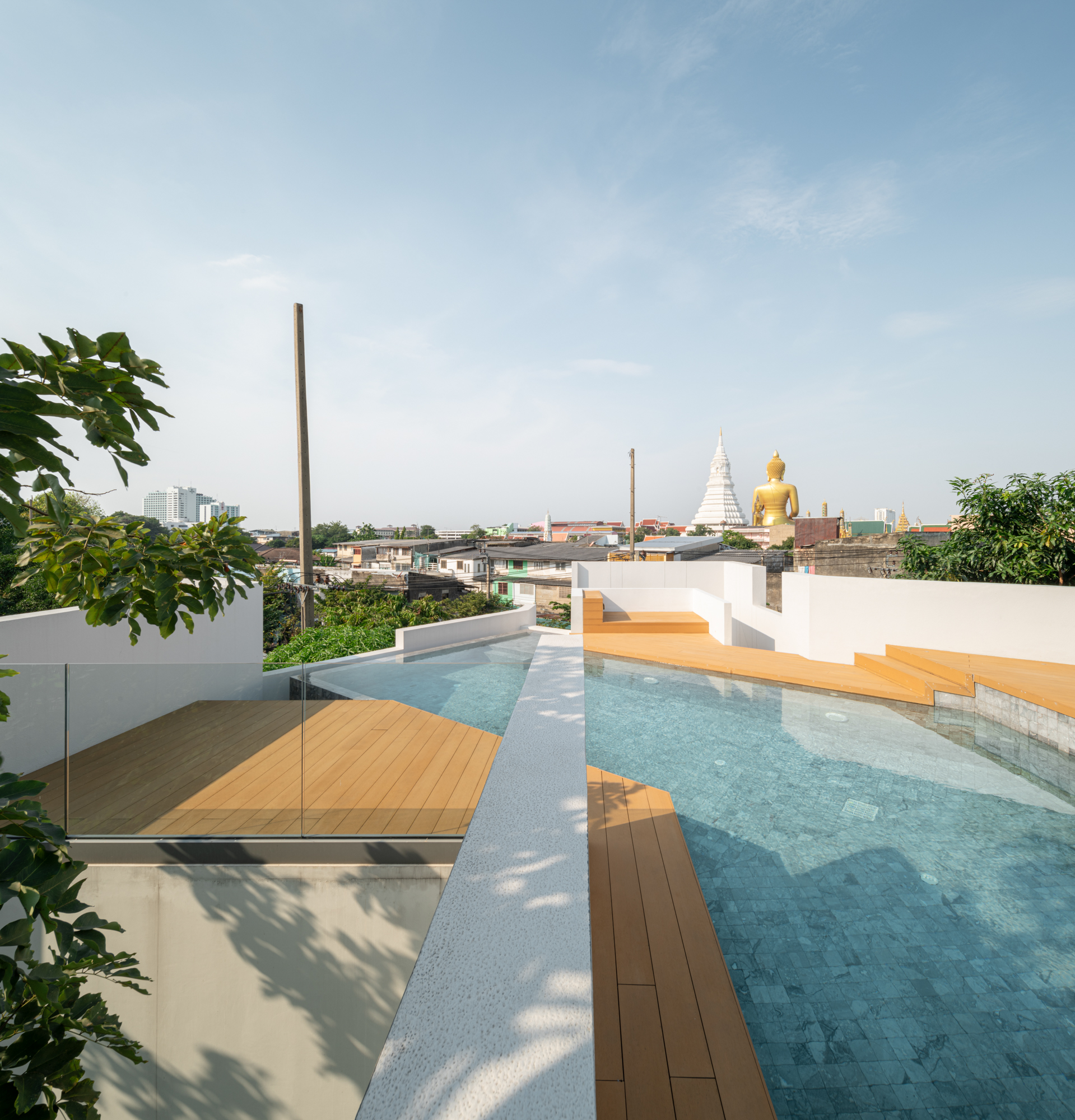 결국 M 하우스는 나무 사이에 숨은 작은 주택이지만, 주변 녹지를 향한 전망, 넓은 테라스, 옥상 수영장까지 갖춘 풍부한 생활 공간을 품고 있다.