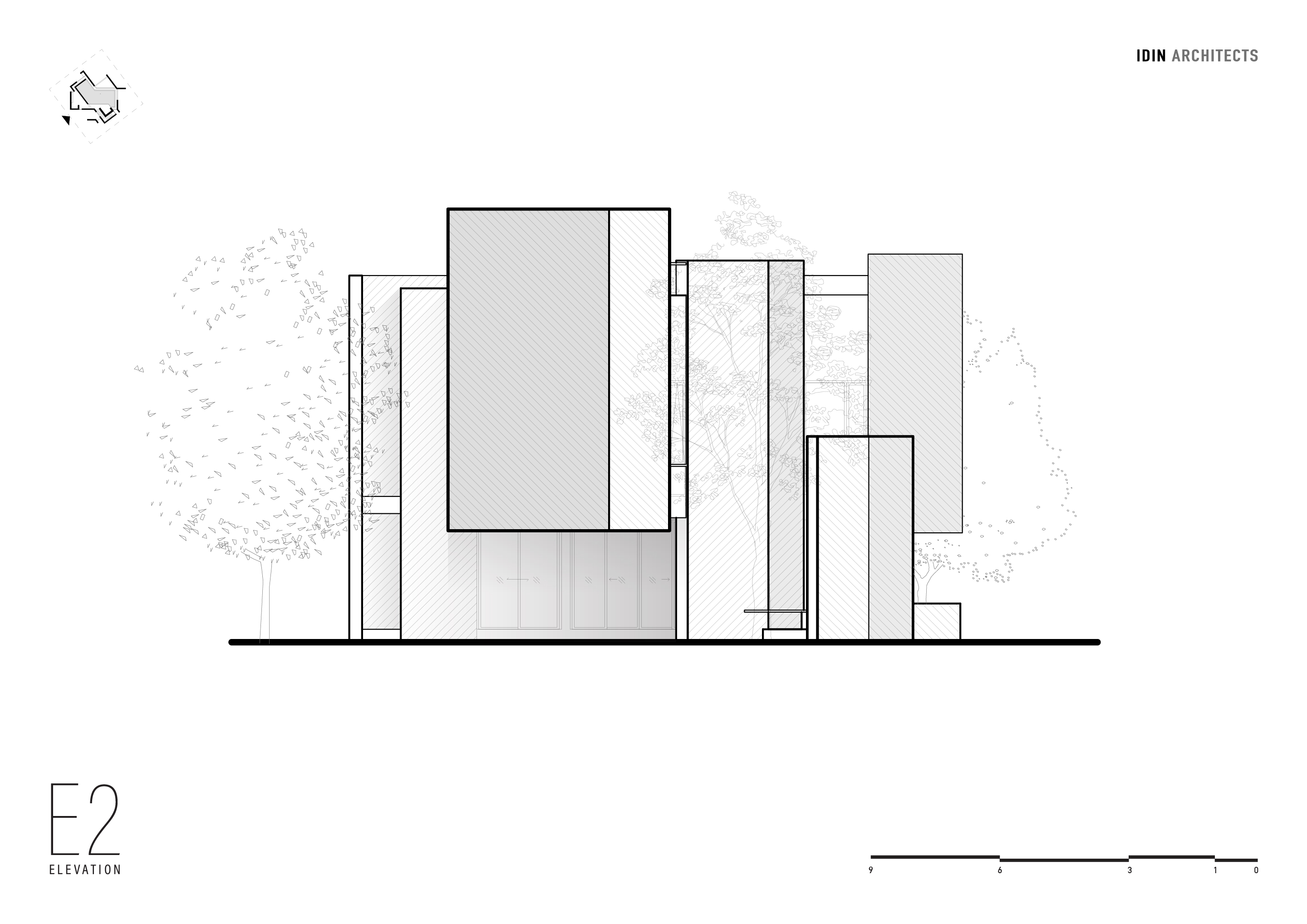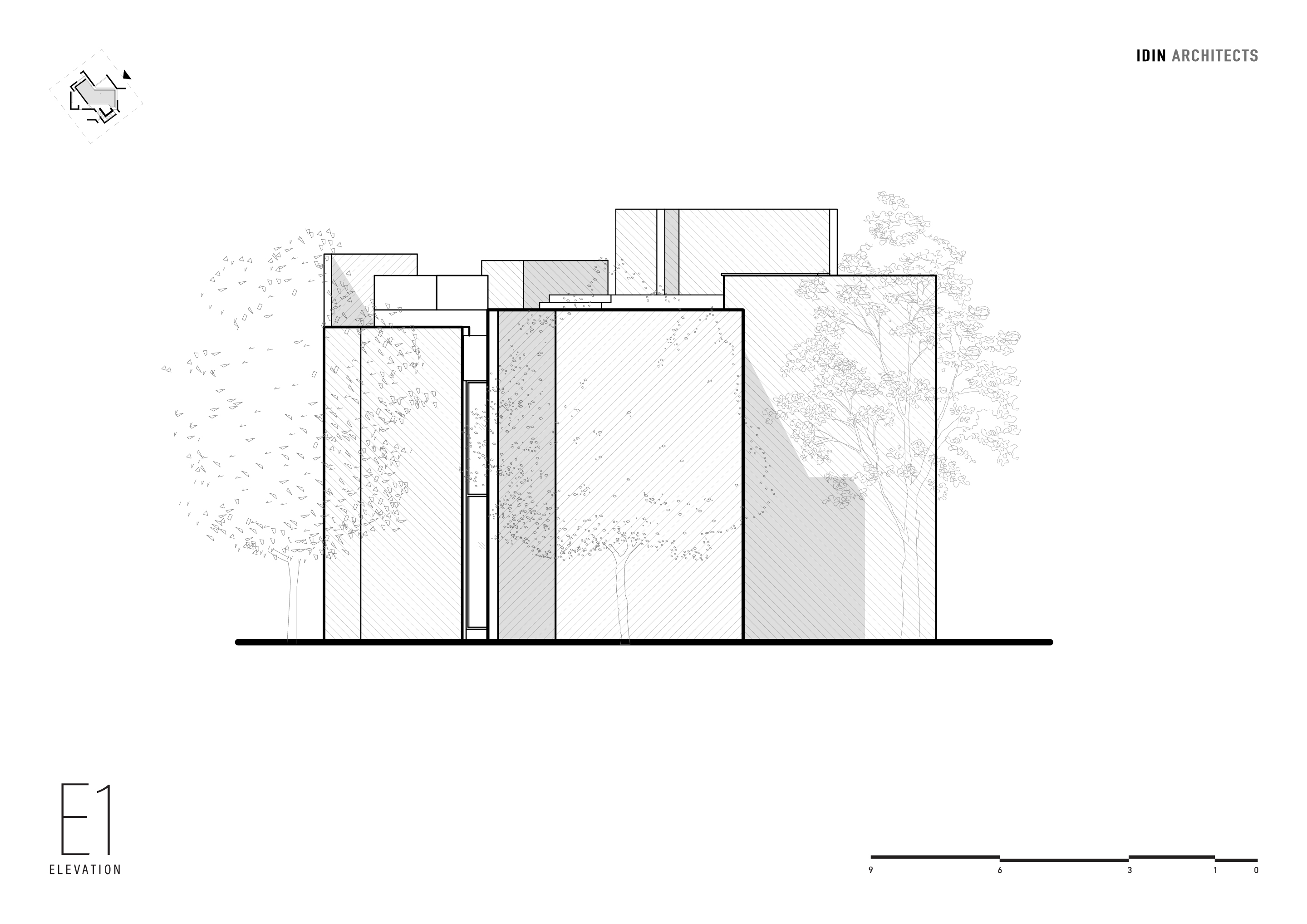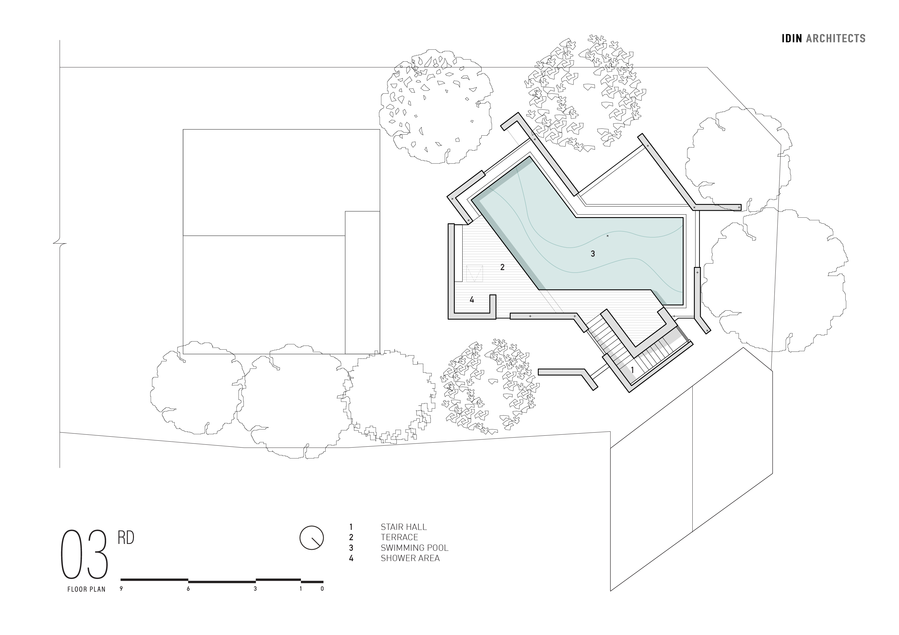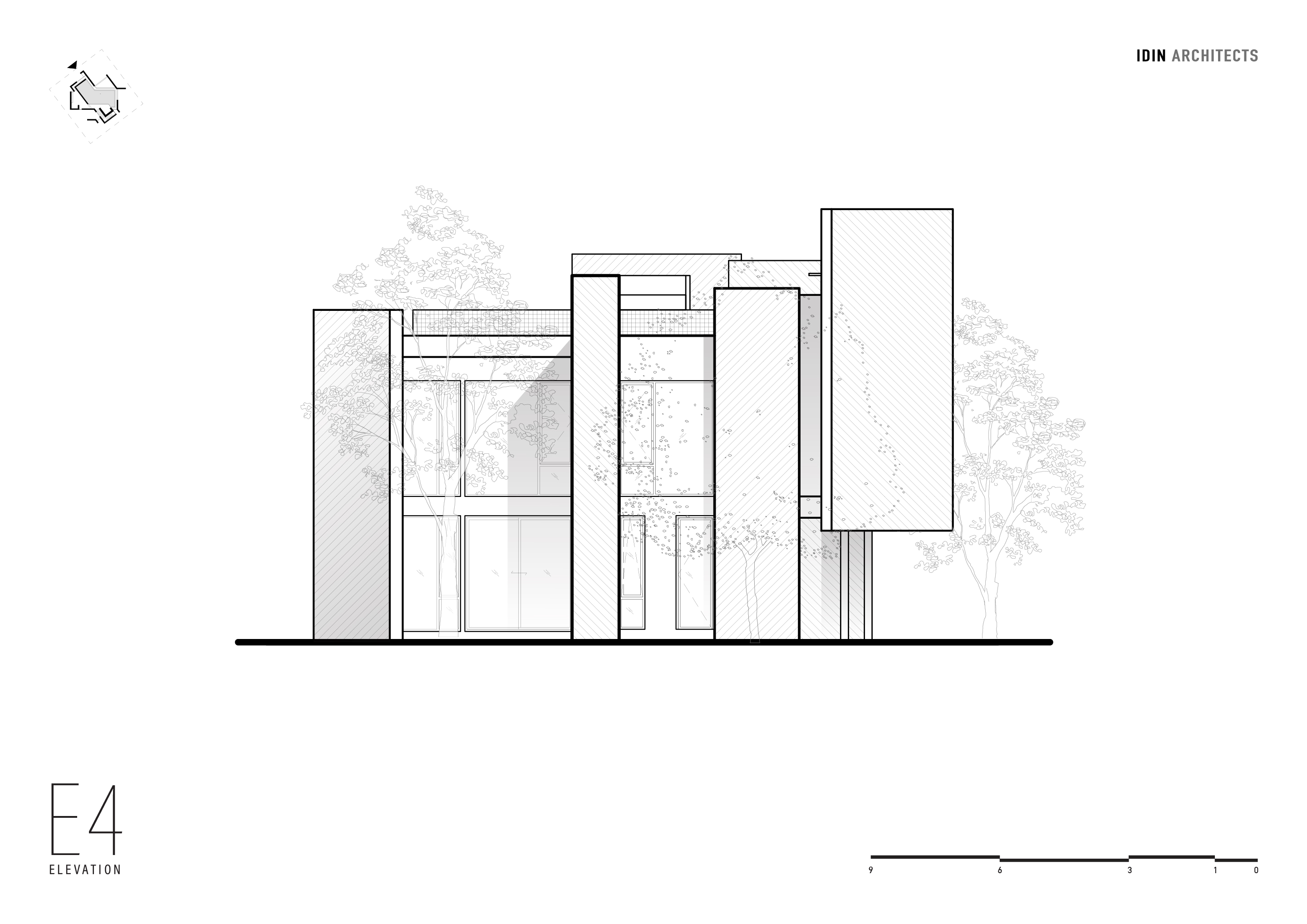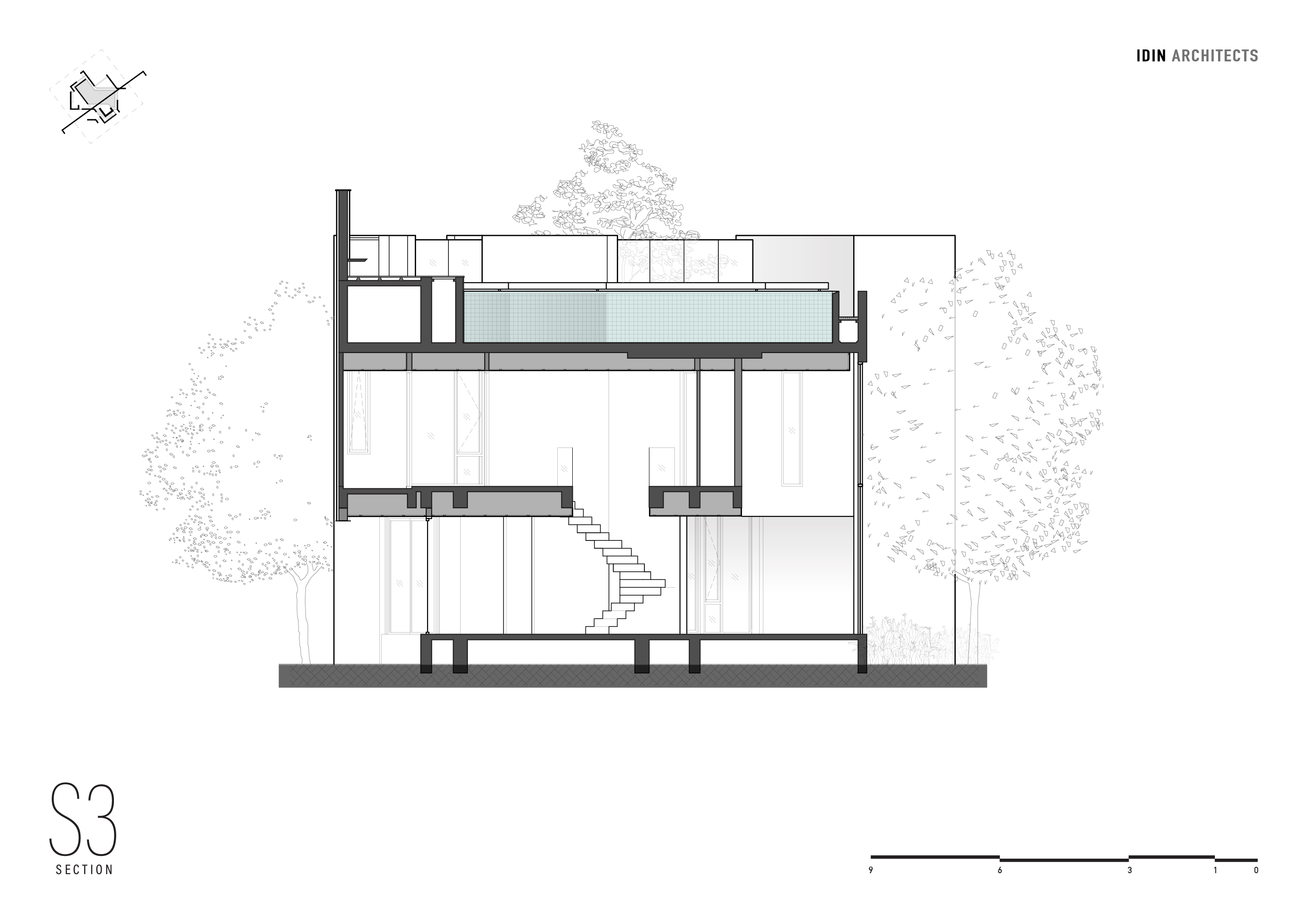 건축주는 외부로부터 사적인 공간을 지켜달라는 요구를 제시했다. 이에 건축가는 기존 차고의 입구 구조물을 남겨 외부 시선을 차단하고, 건물 높이를 기존 나무의 높이와 맞추어 나무 캐노피 뒤로 주택 전체가 가려지도록 했다. 제한된 대지 여건으로 수영장은 옥상에 두었으며, 이는 treetop에 둘러싸인 여가 공간을 제공한다. 옥상 수영장은 하루 종일 햇볕을 받아 물의 온도를 유지하고, 동시에 그 수량은 2층 침실의 열 차단막 역할을 한다.