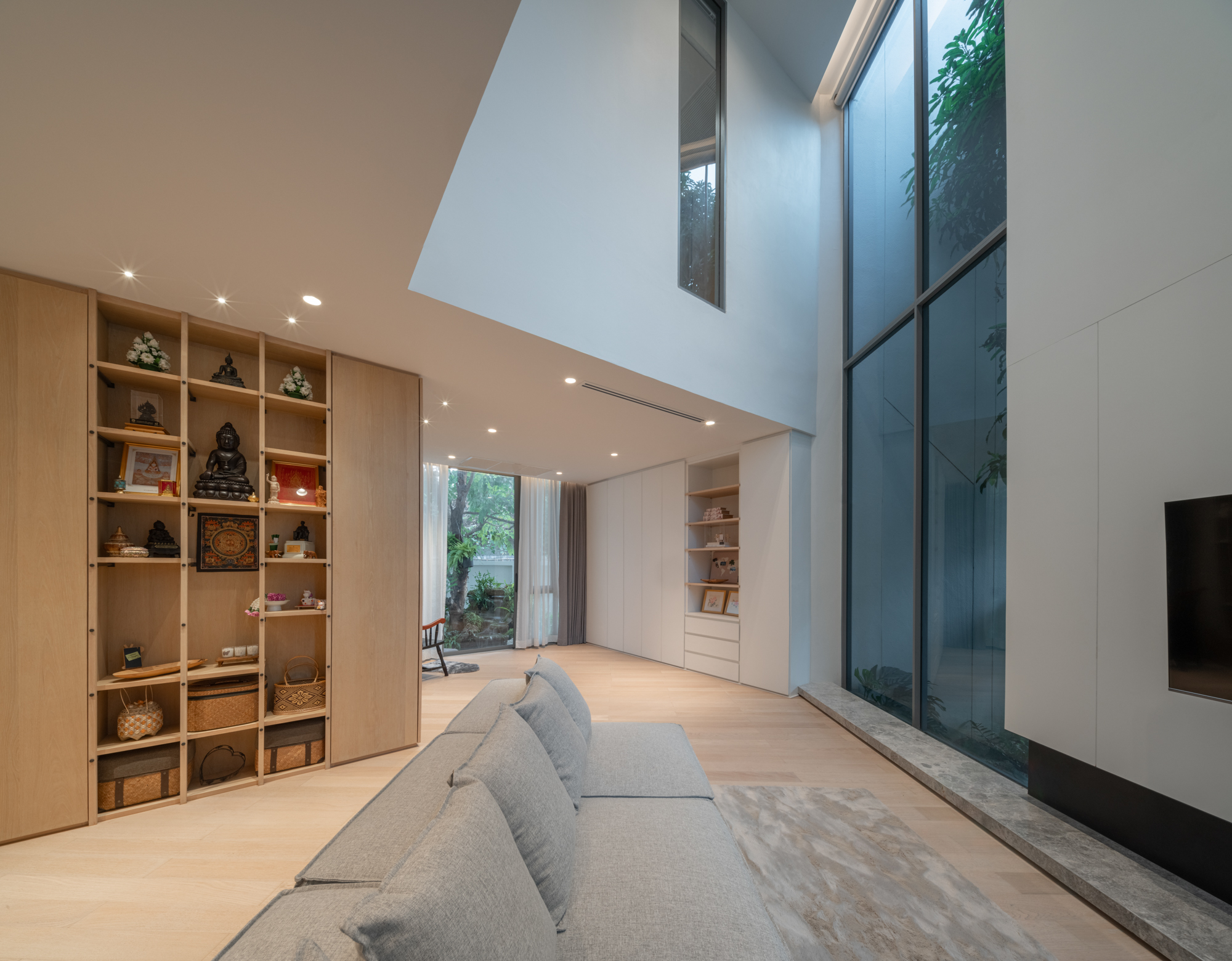 새 주택은 1층 테라스를 통해 기존 주택과 연결된다. 이 층에는 거실, 다이닝, 팬트리, 파우더룸이 배치되었다. 2층에는 안방, 게스트룸, 홈 오피스가 중앙 계단 홀을 중심으로 연결되며, 동선을 최소화하도록 계획되었다. 주요 공간은 나무 사이의 모서리에 배치되었고, 메인 거실은 복층 공간으로 계획되어 1층과 2층을 시각적으로 연결한다.