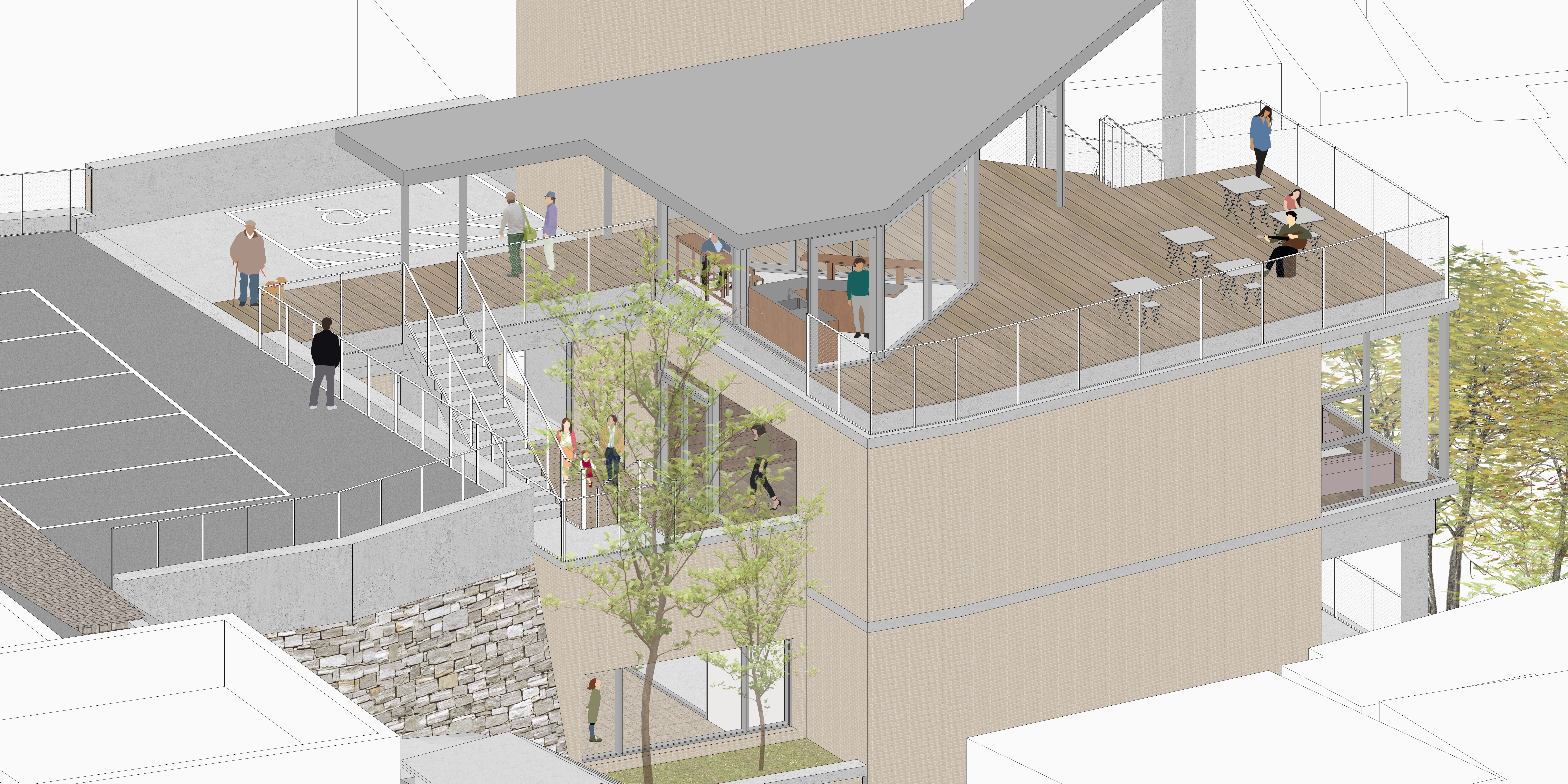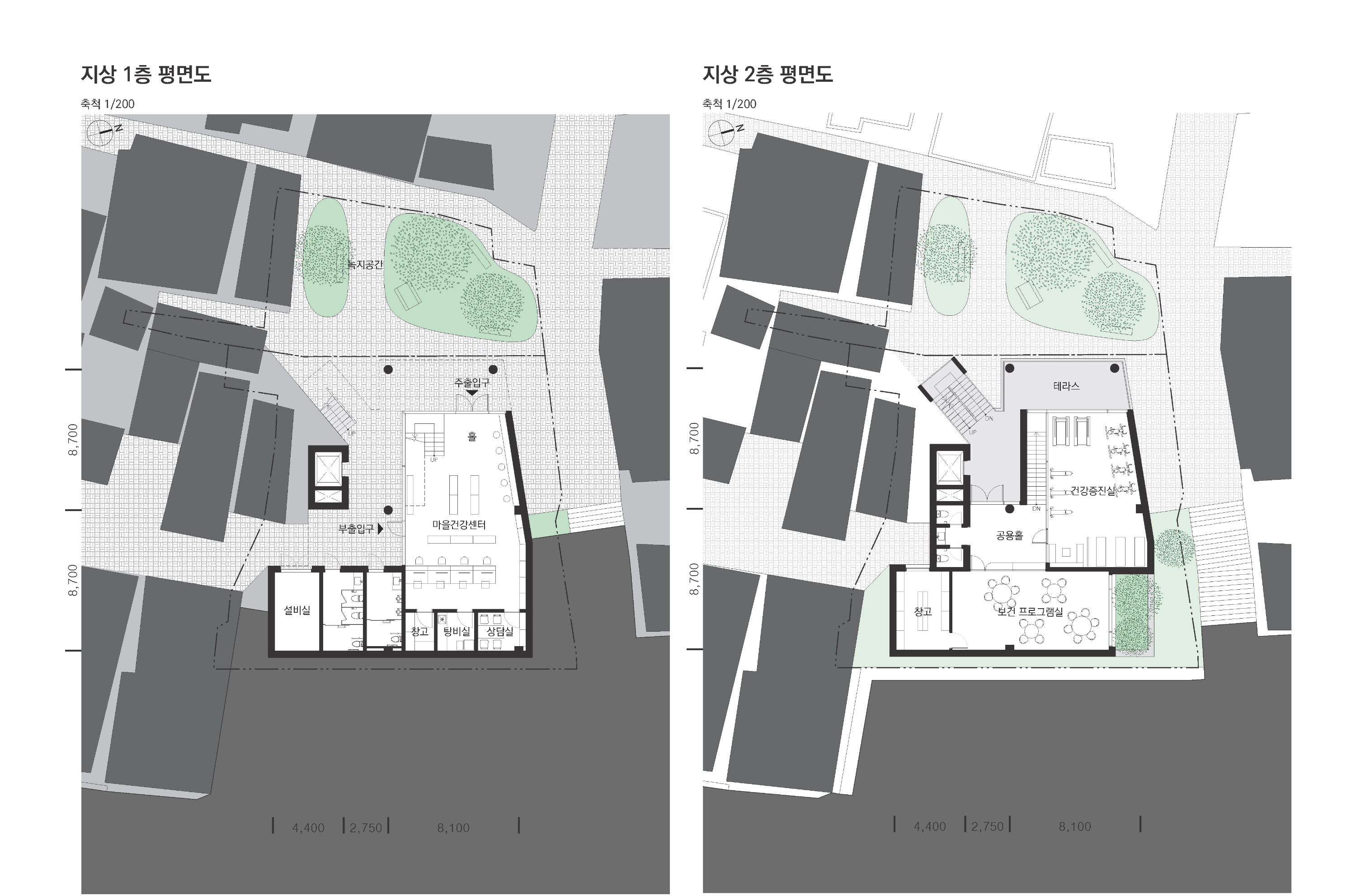 대상지는 상부 도로와 하부 마을이라는 두 개의 생활권에 동시에 접하고 있다. 본 계획은 이 조건을 활용해 건축이 양방향으로 열리는 구조를 제안한다. 상층부(3,4층)의 커뮤니티 공간과 카페는 도로와 주차장에 맞닿아 도시적 흐름을 받아들이고, 저층부(1,2층)의 건강센터와 건강증진실은 반대편 마을을 향해 열려 주민들의 생활과 밀착된다. 이러한 양방향 개방은 이용자 접근성을 높이는 동시에 건축이 단일한 정면성을 넘어, 상부와 하부 모두의 마을을 향한 열린 태도를 지니게 한다. 결과적으로 이 시설은 마을 속에서 누구나 쉽게 접근하고 머물 수 있는 공공의 거점으로 작동한다.