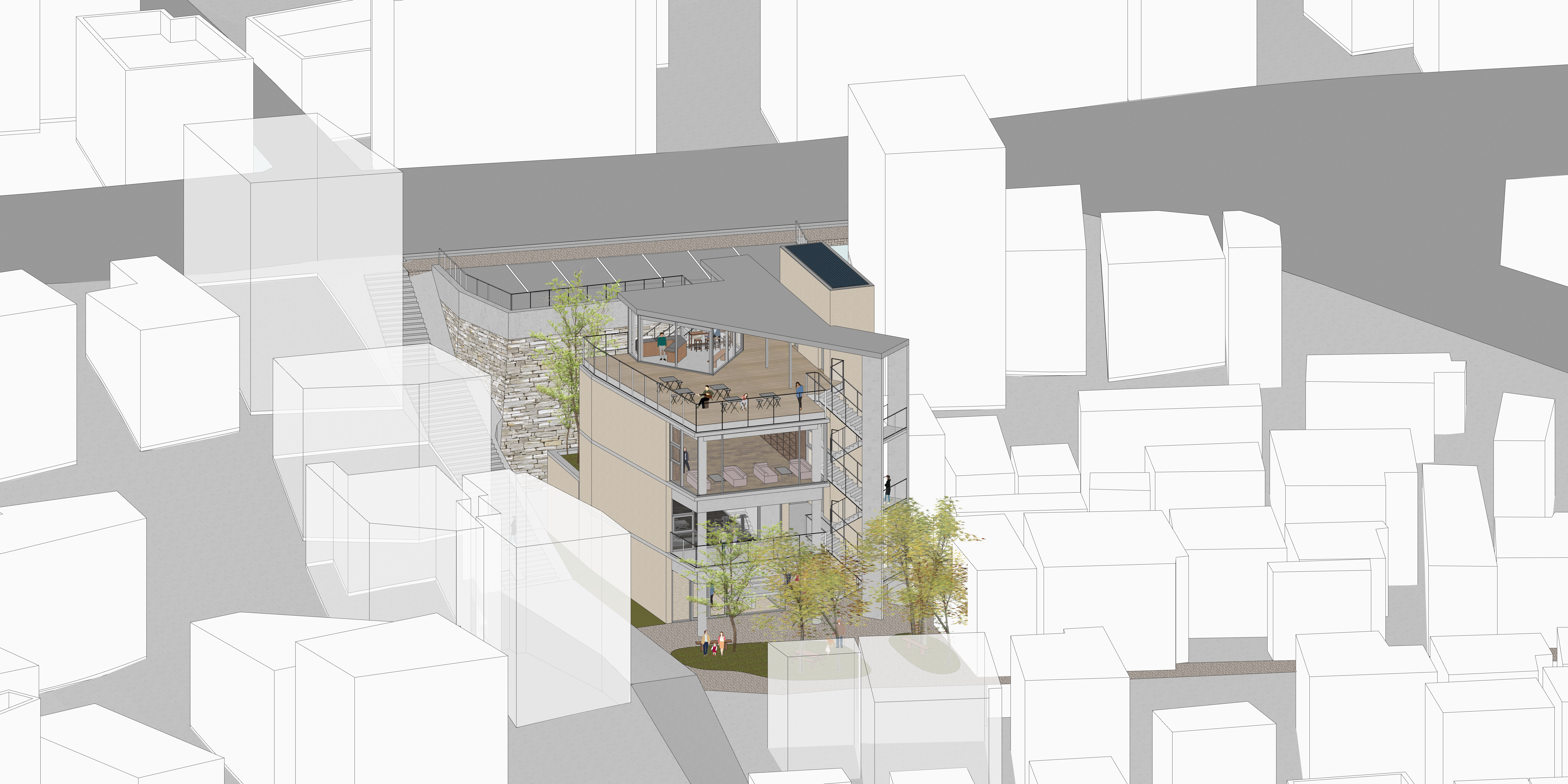 본 계획은 시설의 이용 여부와 관계없이 누구나 자유롭게 이용할 수 있는 수직동선을 제안하여, 건축을 마을의 연결 경로로 확장한다. 엘리베이터와 외부계단은 옥상 전망데크에서 하부의 녹지공간을 연결하는 수직 동선의 역할을 한다. 이 경로는 단순한 시설 출입 동선을 넘어, 주민들이 일상 속에서 자연스럽게 오르내리며 경관을 체험하고 마을을 가로지르는 길이 된다. 이를 통해 이 건축은 상·하부 마을의 단절을 해소하는 공공적 인프라로 기능하며, 단차라는 대지의 한계를 마을을 잇는 기회로 전환한다. 결국 이 시설은 마을의 흐름 속에서 언제나 열려 있는 길이자 생활의 축이 된다.