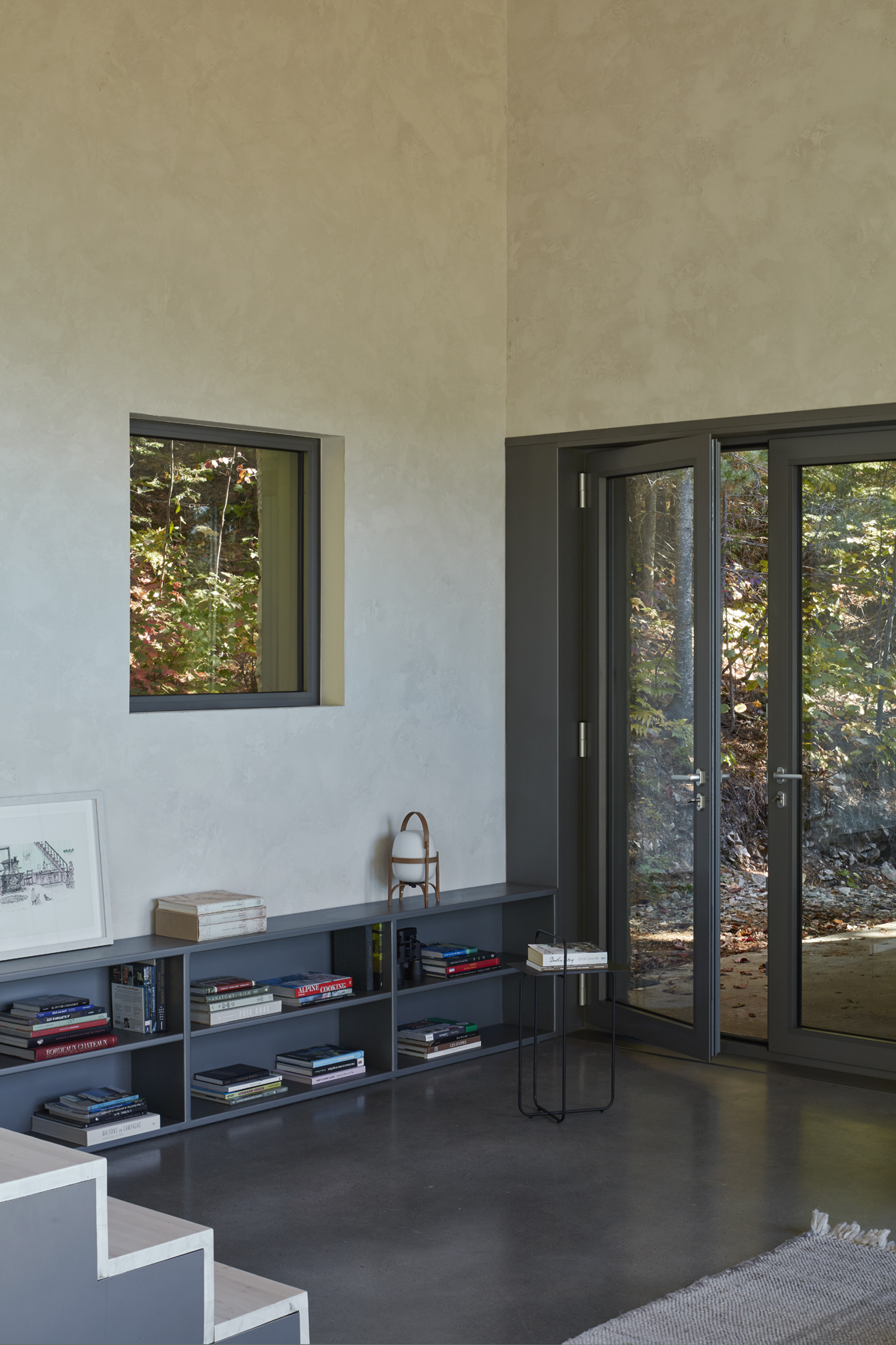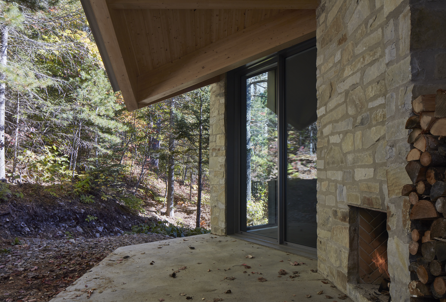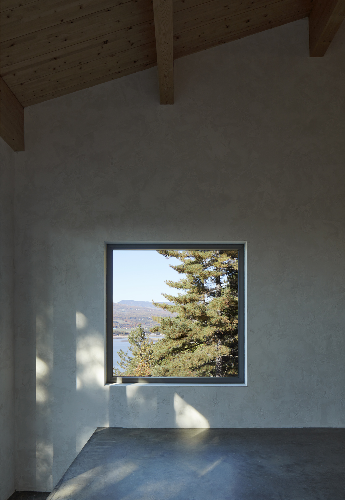 주요 진입부는 부지 상단에 위치하며, 세인트 로렌스 강으로 열리는 로지아가 배치되었다. 이는 건물을 관통해 강변 테라스로 나갈 수 있는 통로 역할을 하며, 진입 자체가 하나의 여정이 된다. 계단과 외부 테라스를 따라 내려가면, 마지막에는 절벽과 수백 년 된 소나무로 둘러싸인 자연적 대지에 도달한다. 이는 부지에 원래 존재하던 경로의 끝이자, 건축이 차지할 수 있는 한계 지점이다.