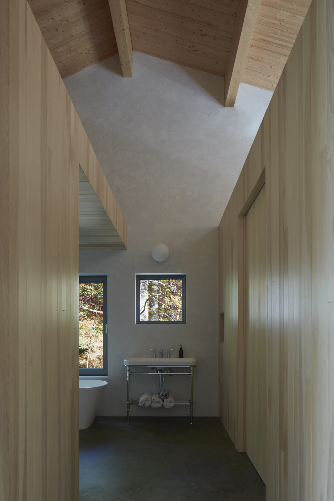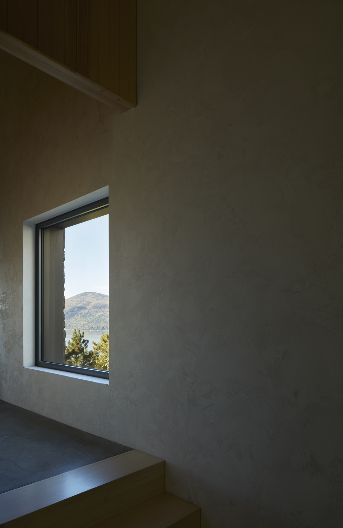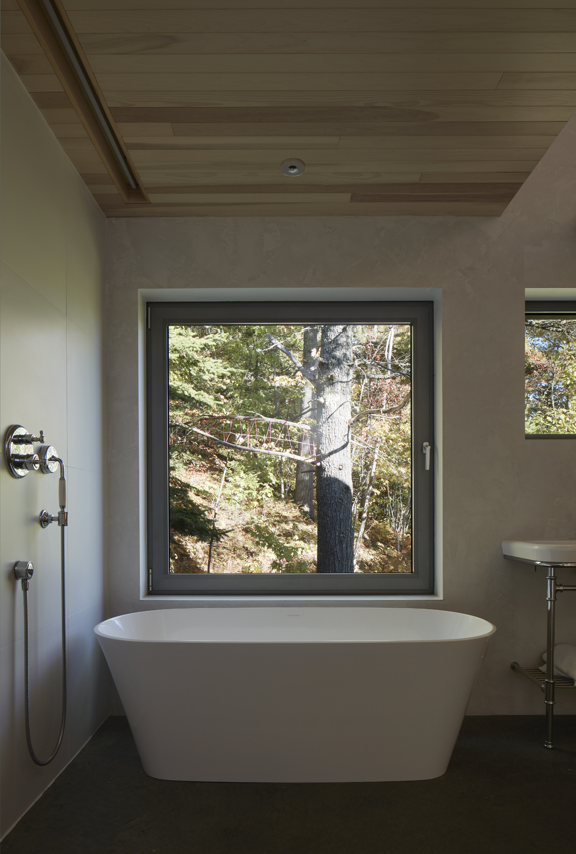 주요 진입부는 부지 상단에 위치하며, 세인트 로렌스 강으로 열리는 로지아가 배치되었다. 이는 건물을 관통해 강변 테라스로 나갈 수 있는 통로 역할을 하며, 진입 자체가 하나의 여정이 된다. 계단과 외부 테라스를 따라 내려가면, 마지막에는 절벽과 수백 년 된 소나무로 둘러싸인 자연적 대지에 도달한다. 이는 부지에 원래 존재하던 경로의 끝이자, 건축이 차지할 수 있는 한계 지점이다.