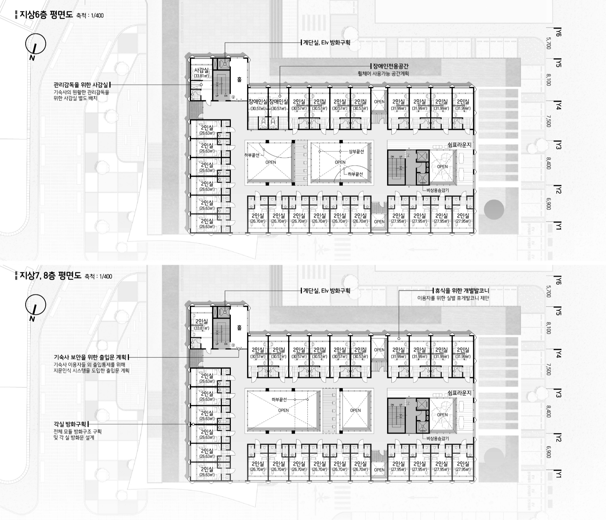 5-9층까지는 외국인기숙사를 계획하였다. 5층은 평생교육시설과 기숙사 사이의 완충공간으로, 기숙사 생활에 필요한 편의시설을 배치하고 공용공간과 연계해 교류가 활발한 환경을 조성하였다. 6-8층은 주로 2인실로 구성되며, 2인실에는 개별 발코니, 가벽, 분리형 화장실을 두어 프라이버시를 보장하였다. 또한 6층에는 관리를 위한 사감실과 약자를 배려한 장애인실을 계획하였다. 9층에는 기혼자실과 1인실을 배치하였으며, 기혼자실은 가족이 함께 거주할 수 있도록 다인용 모듈과 개별 취사공간을 마련해 편의성을 높였다. 기숙사 공용공간에 상부천창을 설치해 휴식, 자연채광 및 환기를 통한 쾌적성을 확보하였다.