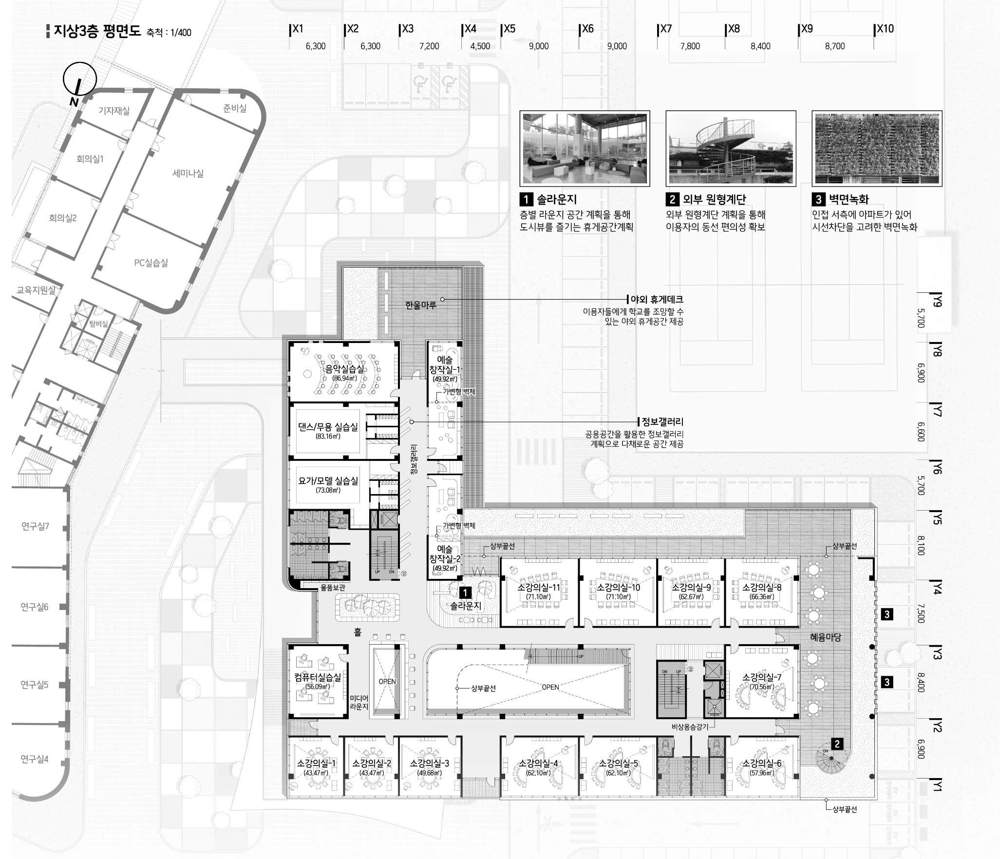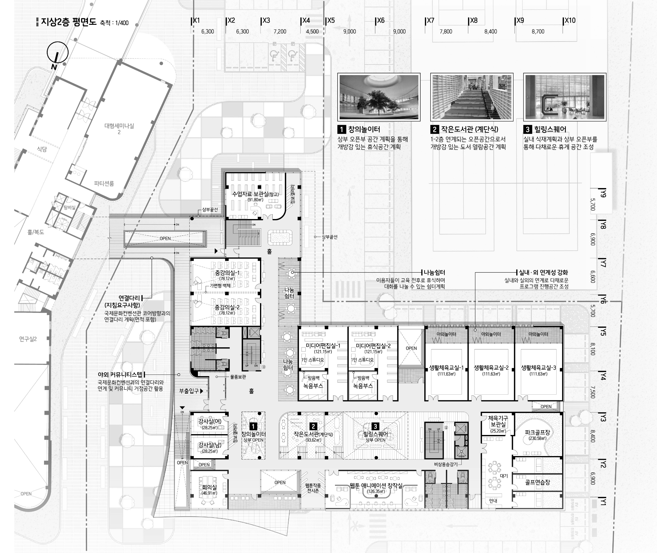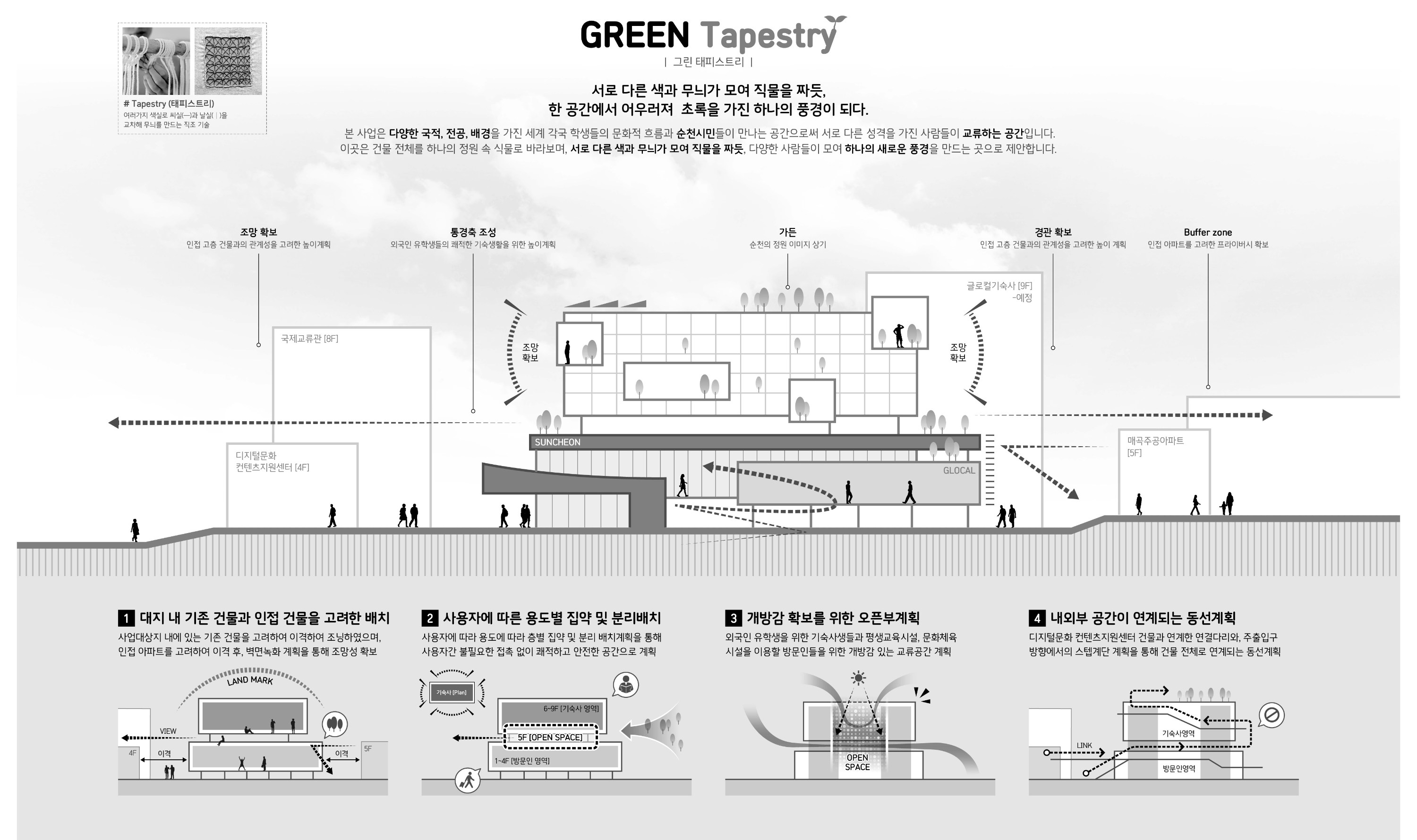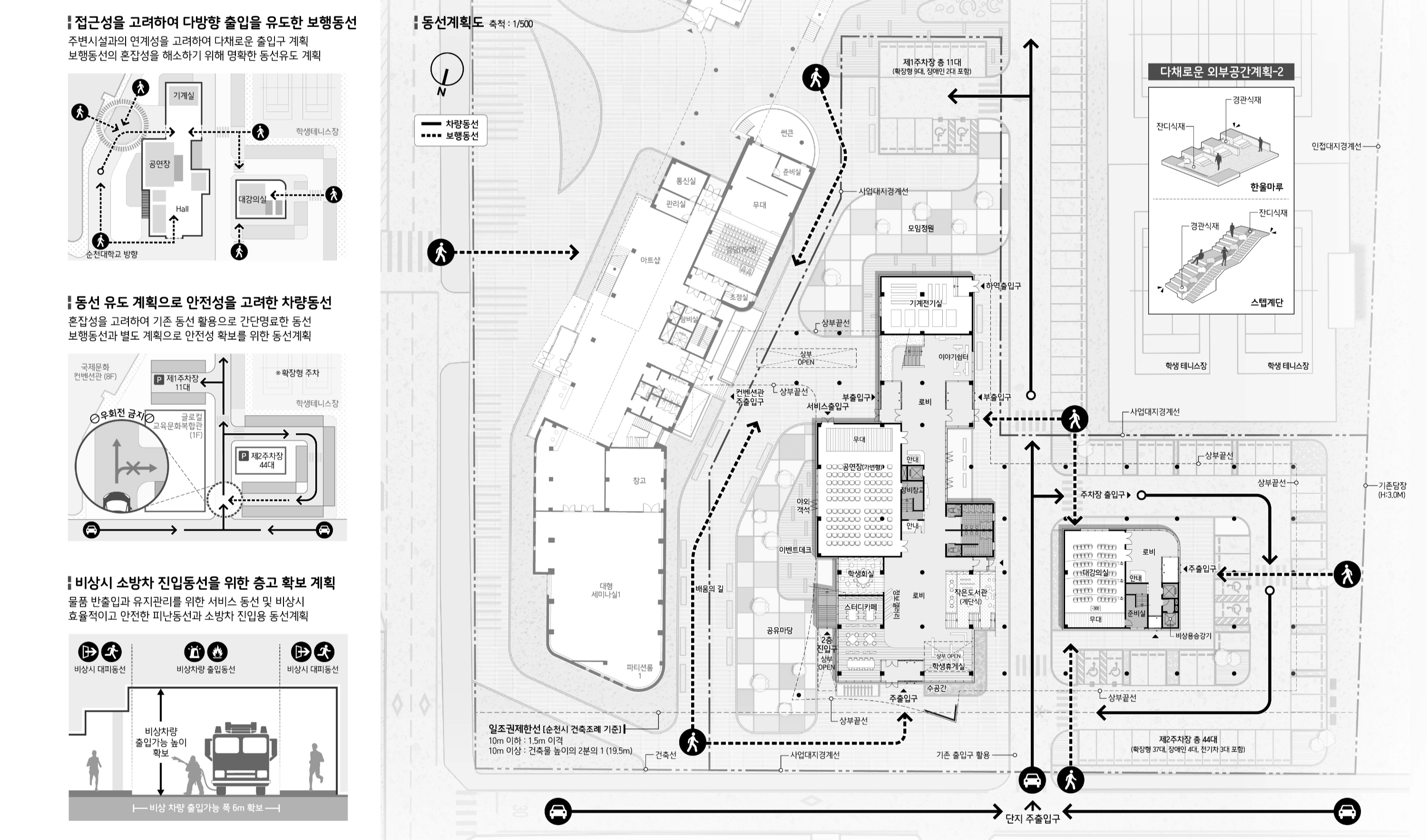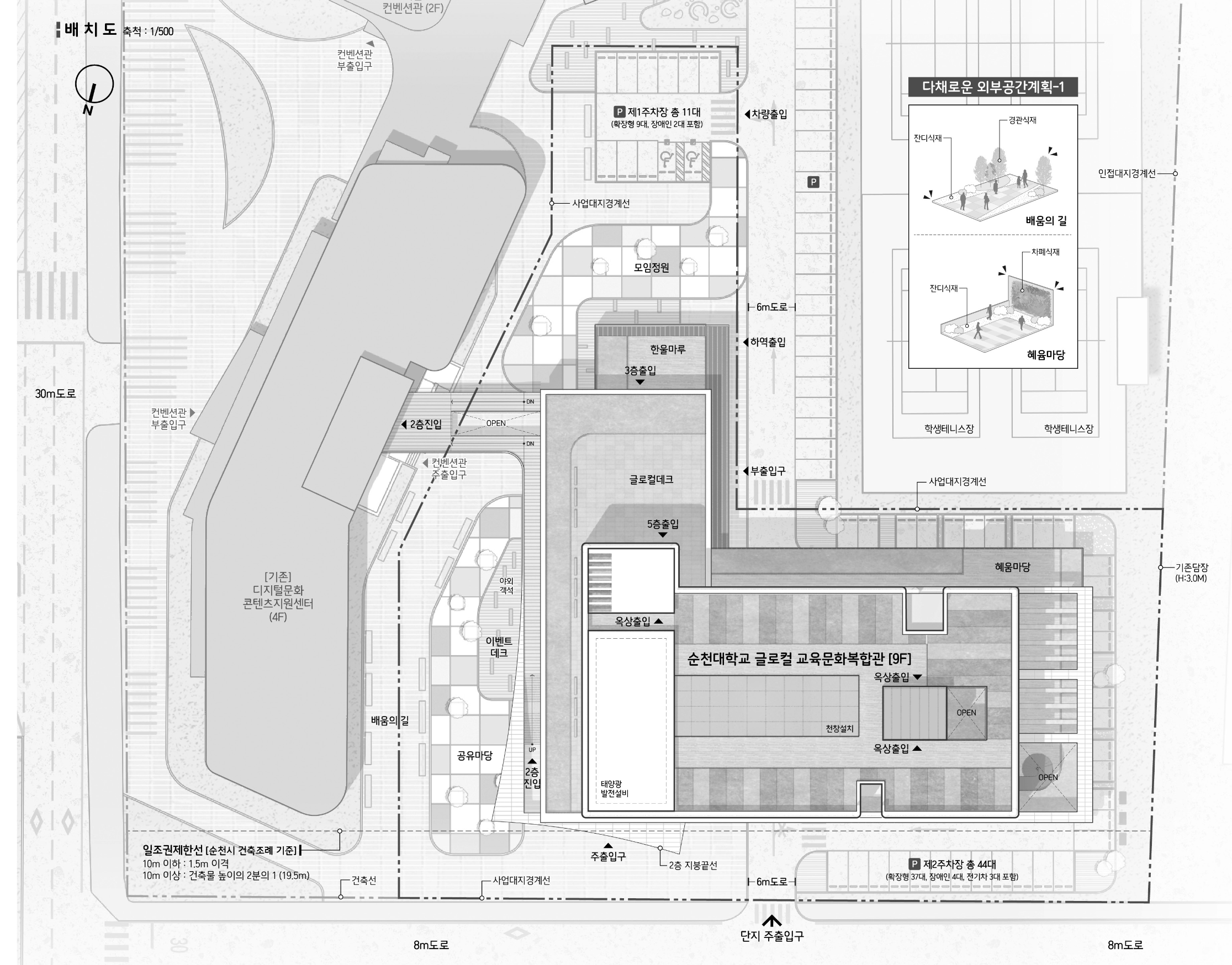 기존 건축물과의 연계성과 접근성을 고려해 다방면에서 접근가능한 출입구를 계획하고, 관계성을 반영한 완충공간을 마련하여 순천대학교 방향에서의 이용동선을 유도하였다. 또한 동선을 체계적으로 분리해 차량 혼잡을 최소화하고 보행의 안전성을 확보했으며, 비상 시 원활한 소방차 진입을 위해 적정층고와 효율적인 피난동선을 확보하였다.
