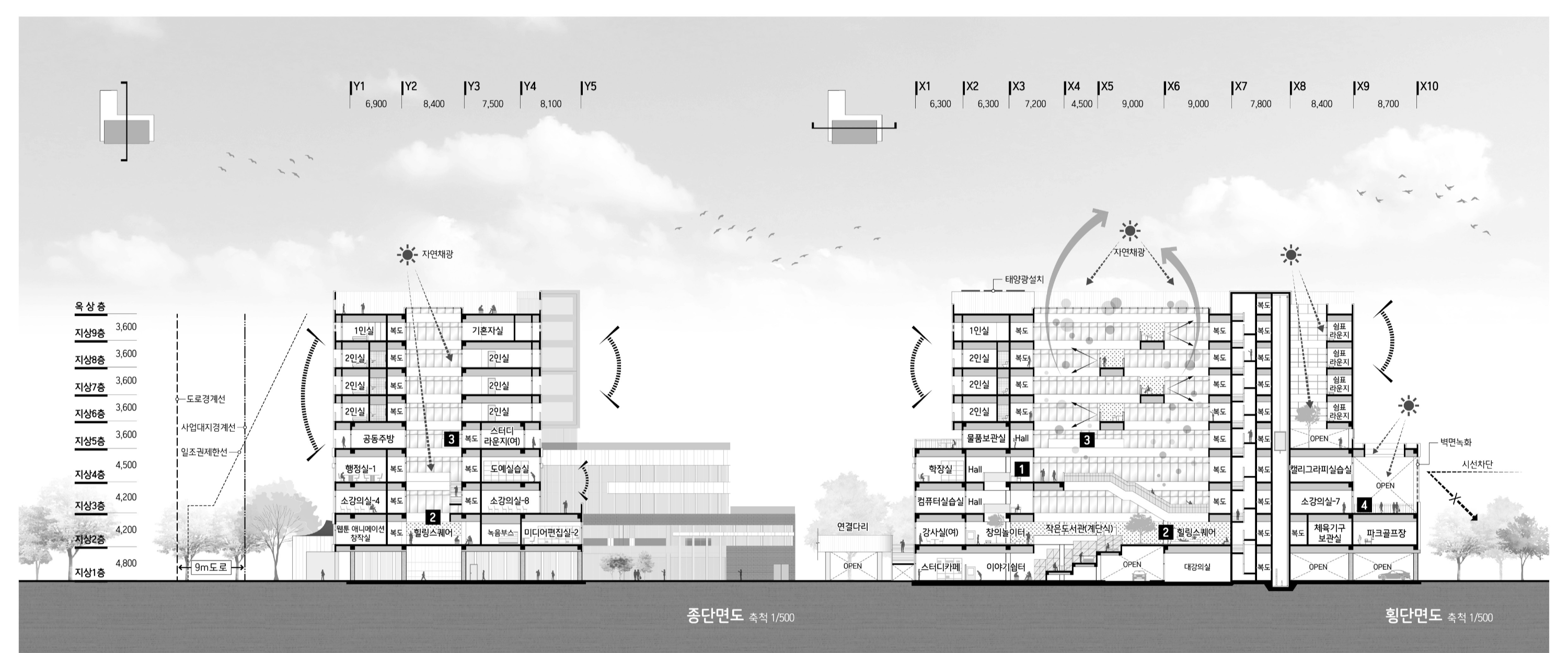 단면계획에서는 각 층에 라운지를 배치해 도시 경관을 조망할 수 있도록 하고, 상부 오픈공간을 통해 밝고 쾌적한 환경을 조성하였다. 중앙 오픈부에는 공용라운지를 두어 학생들의 여가활동 공간을 마련했으며, 프로그램의 특성에 맞는 적정층고를 적용하였다. 주변 주거단지와 관계성을 고려해 벽면녹화를 적용함으로써 시선차단과 친환경적인 이미지를 동시에 확보하였다. 각 기숙사실은 개별 발코니를 계획하여 조망확보 및 쾌적한 실내환경을 조성하였다.