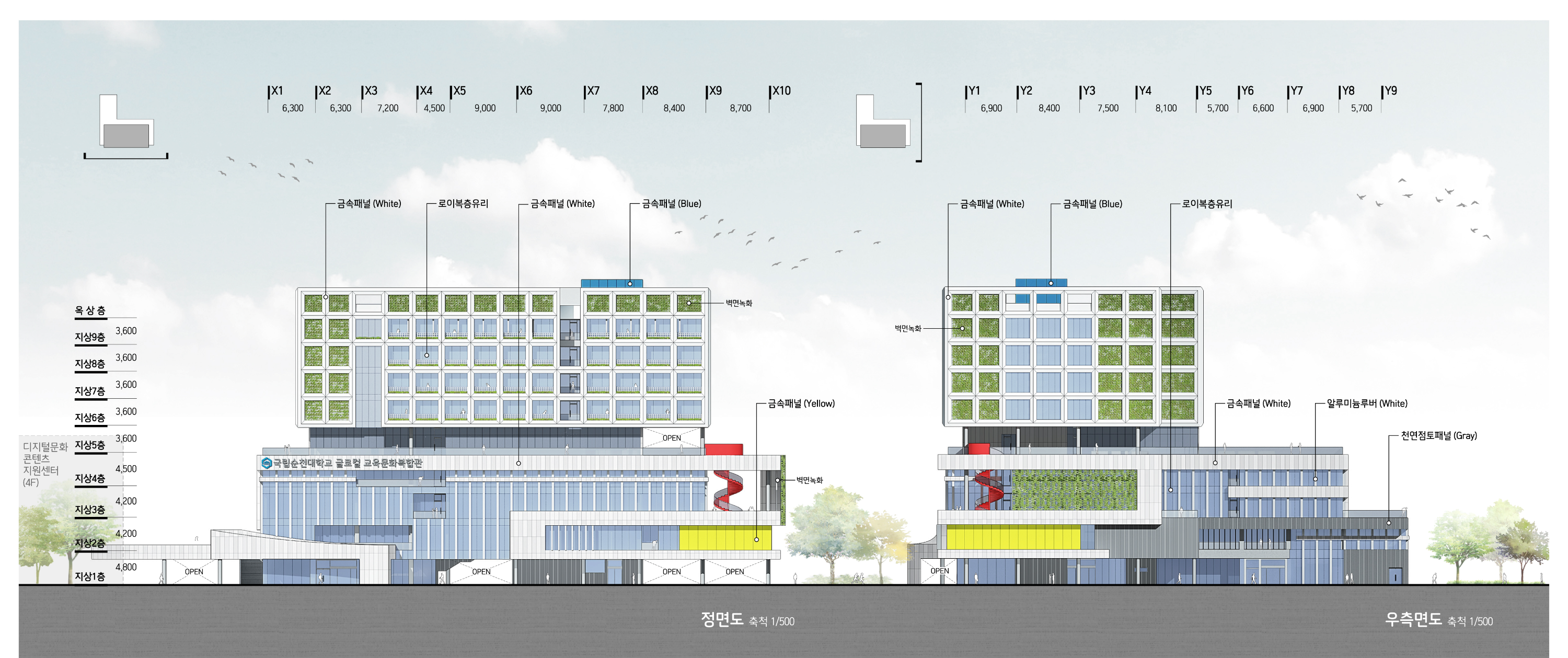 국립순천대학교 글로컬대학 사업의 의미를 담은 입면은 다양한 문화의 공존을 재해석해 디자인을 도출하였다. 교육문화복합관의 기능적 특성을 반영하여 다문화 네트워크의 다양성과 통합성, 글로컬의 목표인 확장성과 연속성을 입면에 표현하였다. 시각적 개방감을 확보해 내외부로 열린 커뮤니티를 형성하였다. 다양한 국적의 학생들을 배려해 주로 편안한 색채를 사용하면서, 강조색을 기능적으로 디자인 요소로 활용하였다.