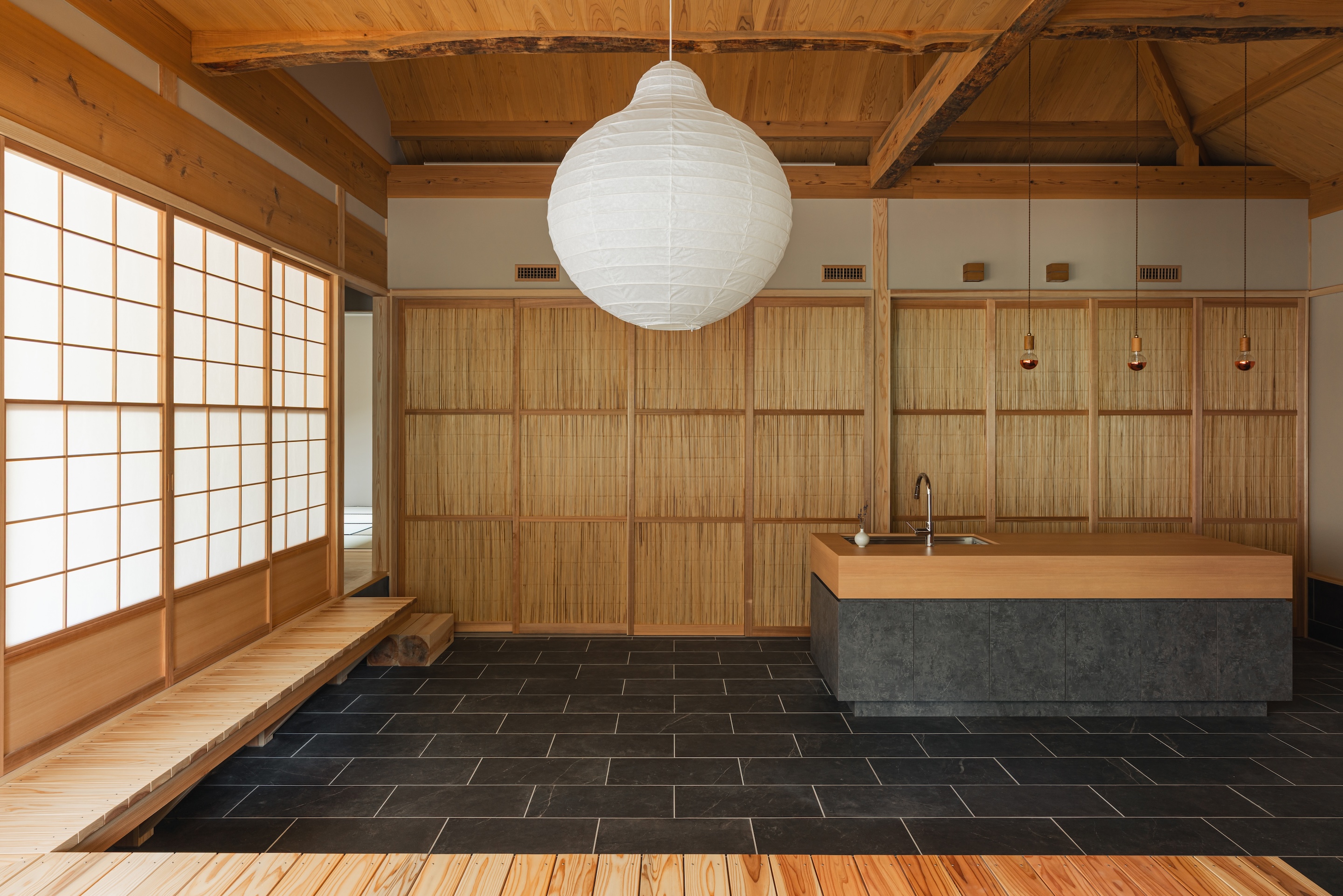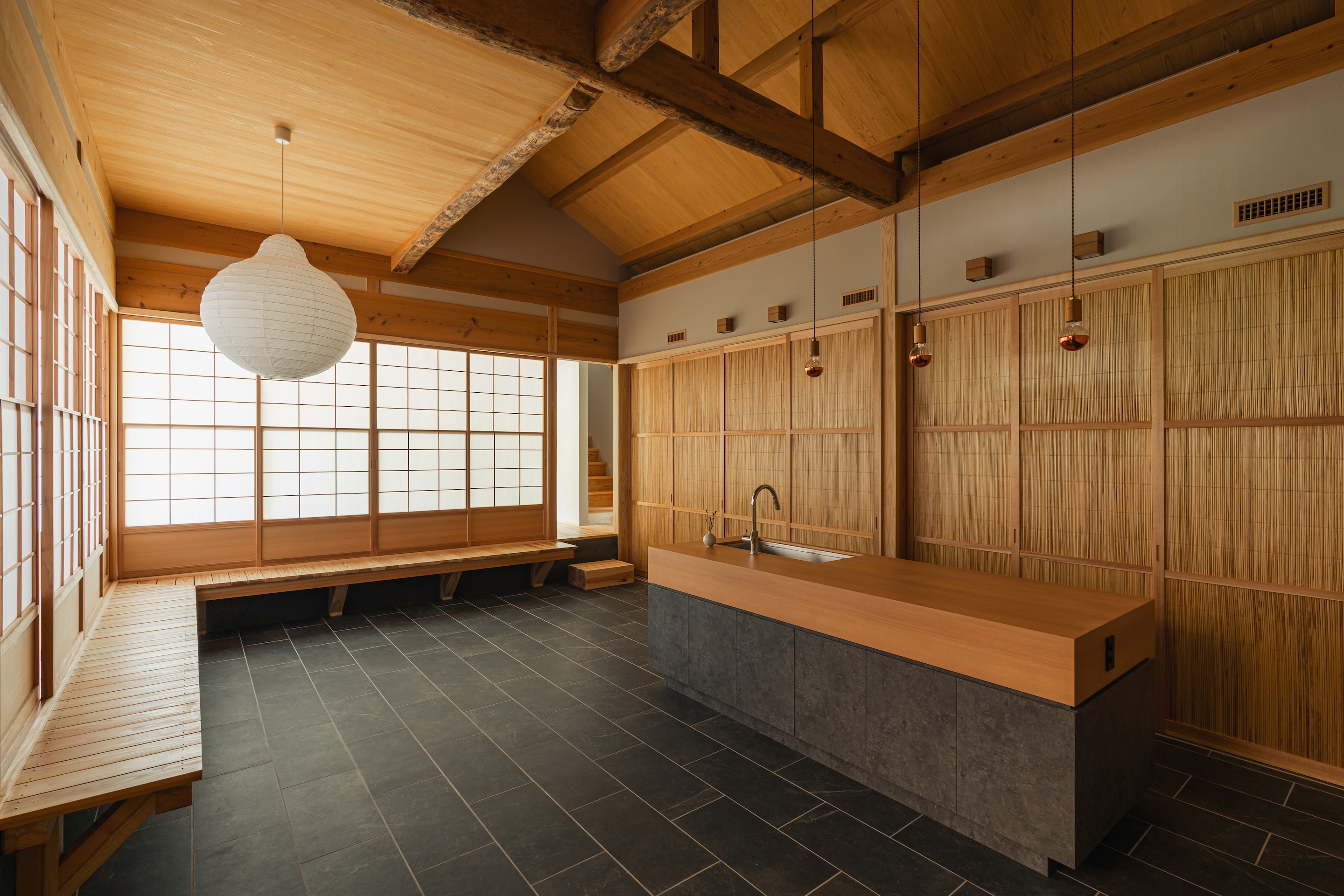 현관실을 지나면 주방과 다이닝 공간이 펼쳐진다. 이 공간은 일본 전통의 ‘도마(土間)’와 미국의 신발을 신고 생활하는 문화를 접목시켜, 건축을 통해 이국적 문화를 느낄 수 있게 한다.