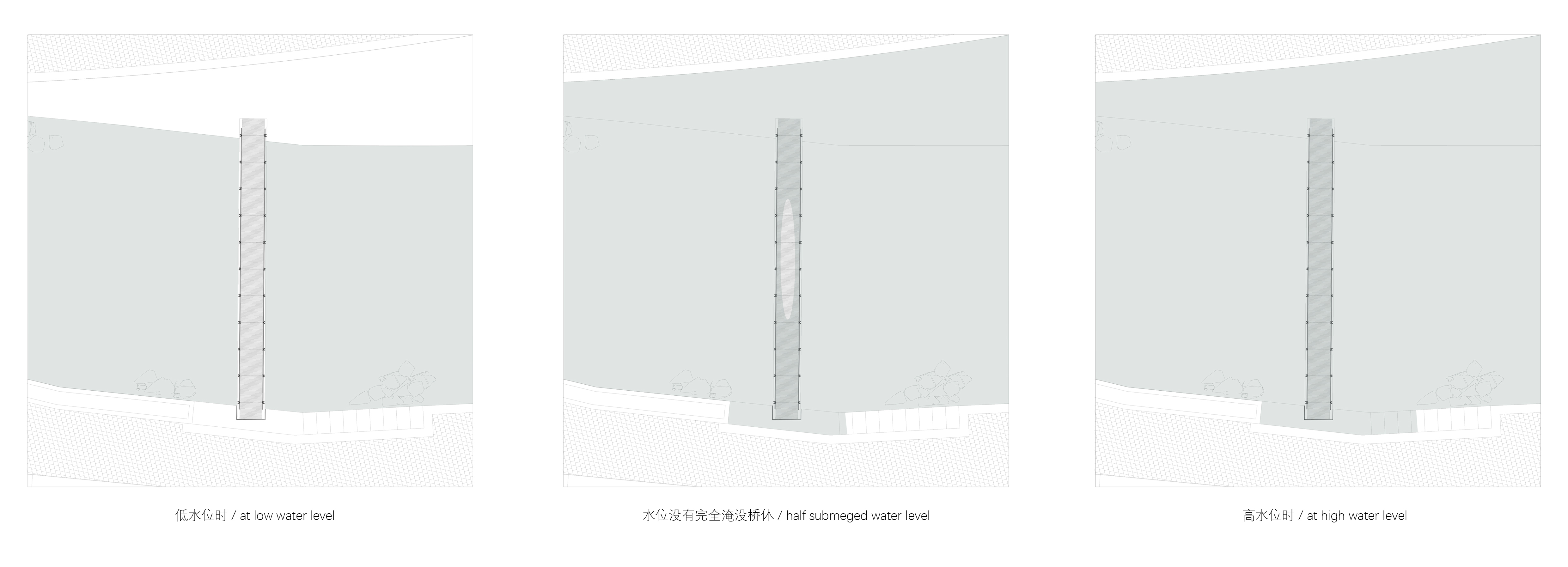 어떻게 다리를 시간과 연결할 수 있을까. 우리는 다리 아래로 흐르는 시냇물을 관찰했다. 에페메럴 브리지는 수면에 가까이 디자인 높이를 낮추어, 물의 오르내림에 따라 다리의 모습이 끊임없이 변한다. 이는 프랑스의 몽생미셸과 그 만을 떠올리게 한다. 다리는 완만한 아치를 이루고 있다. 수위가 낮을 때는 다리 전체가 드러나 자유롭게 건널 수 있다. 수위가 오르면 다리 표면이 점차 잠기고, 아치의 꼭대기만 물 위로 떠올라 작은 섬처럼 보인다. 이는 다리 본체가 수면 아래에 있음을 암시하면서, 아직 안전하게 건널 수 있음을 알려준다. 수위가 계속 오르면 다리는 완전히 물에 잠겨 사라진다.