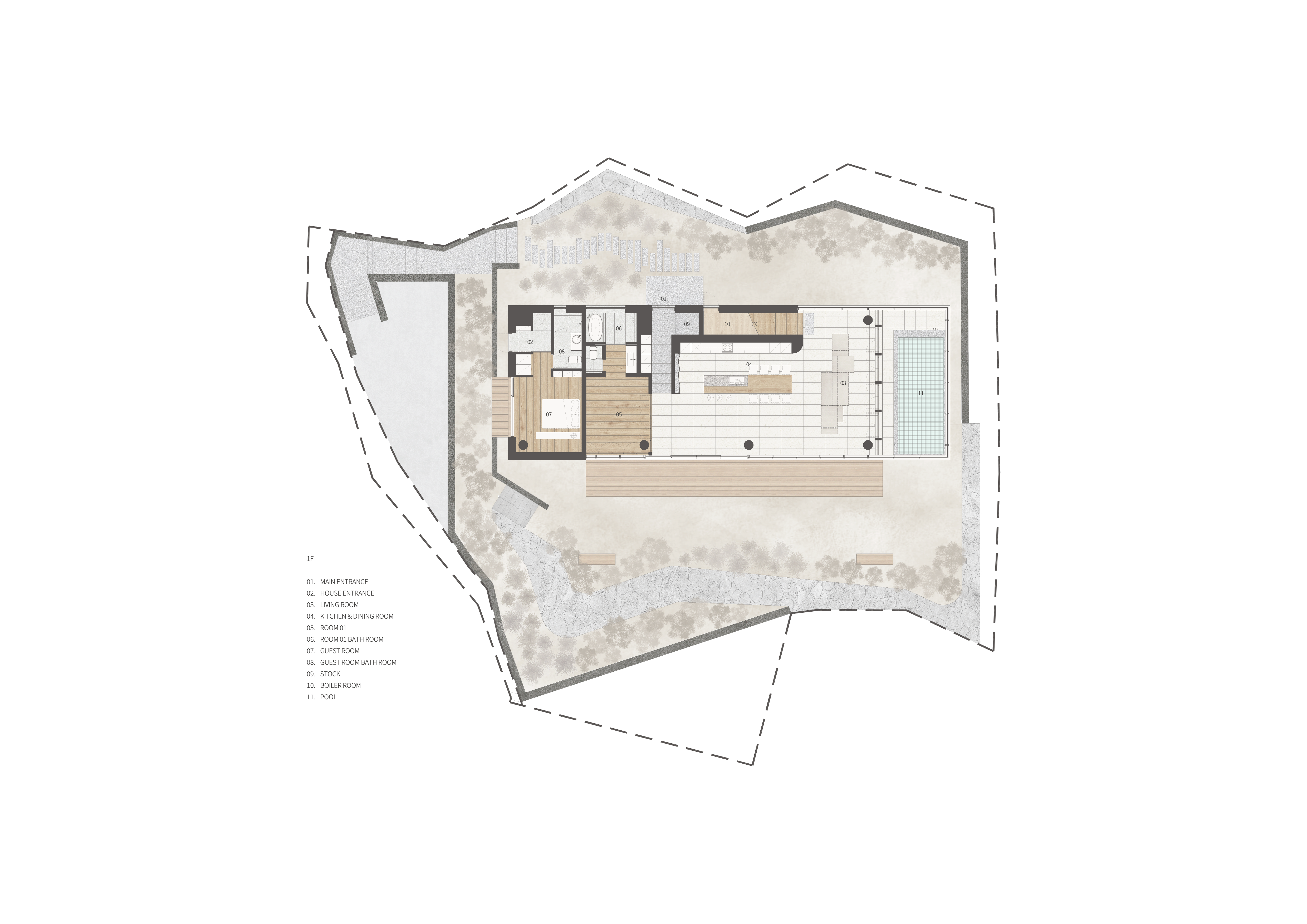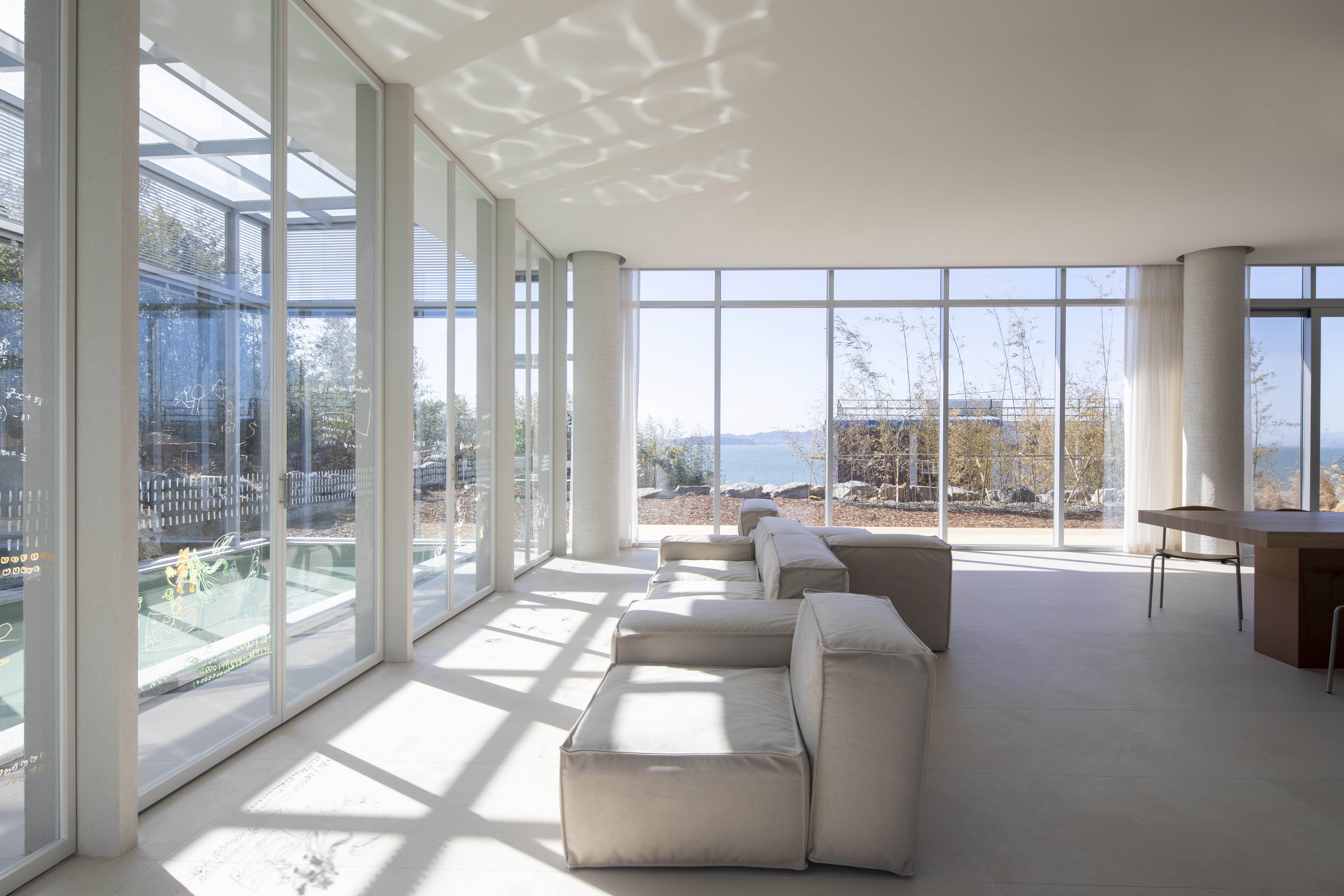 바다와 섬의 능선으로 둘러싸인 대지는, 어느 방향으로든 시선을 유영케 하는 유연한 개방감을 품고 있다. 그 안에서 우리는 예술, 휴식, 가족이라는 삶의 핵심 요소를 관통하는 여백의 조각으로서 건축을 기록하고자 했다. 대지를 감싸는 대나무 숲 사이로 내밀하게 진입하여 마침내 목격되는 공간은, 풍경 속으로 조요히 침윤되는 조각처럼 존재하며, 시선과 감정을 포용하는 여백을 구현한다. 이 여백은 시각적 언어를 통해 여유로움과 내면의 자유를 드러내며, 부드럽고 자연스러운 물성과 색은 사용자의 감각을 일깨우는 실현의 공간으로 완성된다.