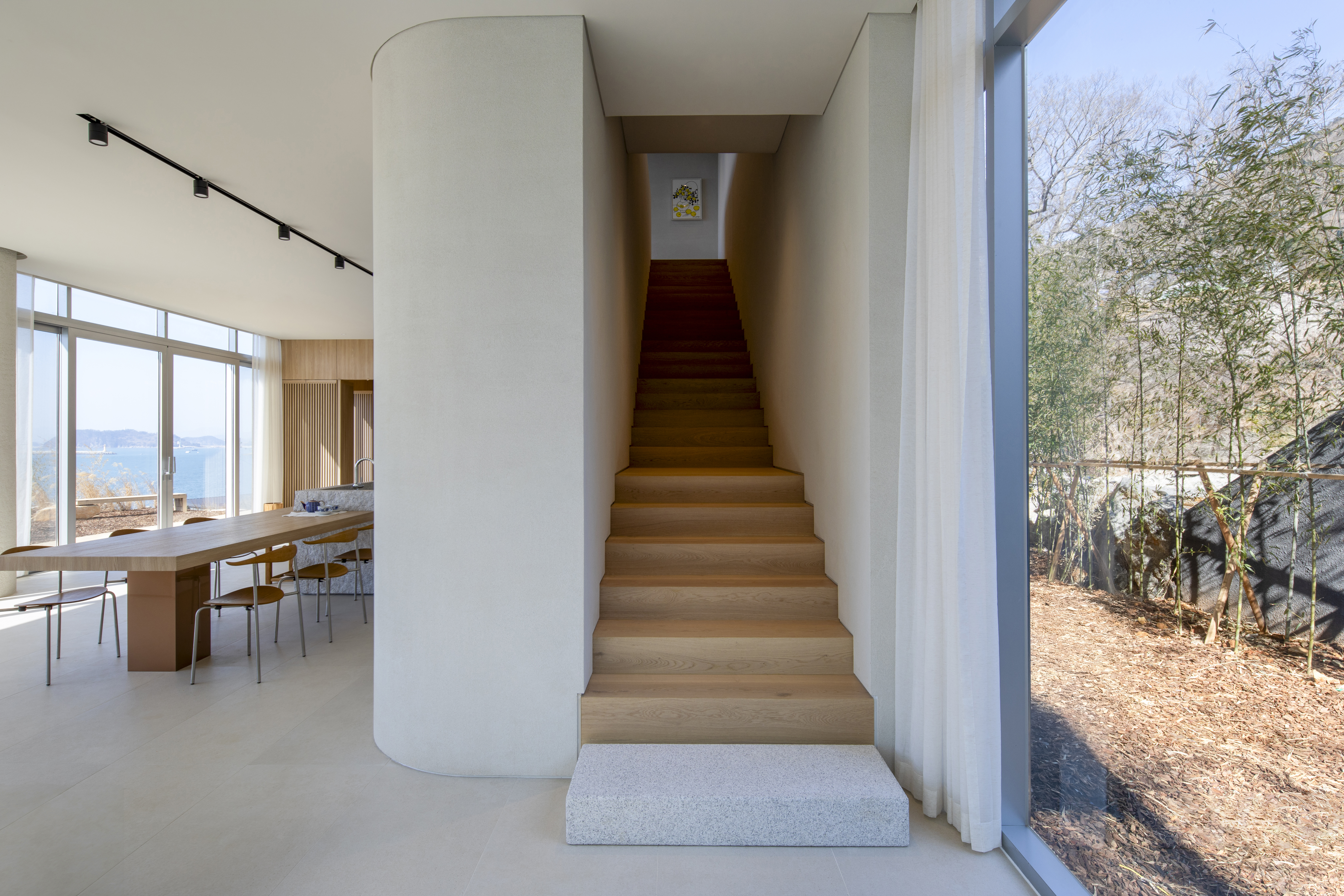 바다와 섬의 능선으로 둘러싸인 대지는, 어느 방향으로든 시선을 유영케 하는 유연한 개방감을 품고 있다. 그 안에서 우리는 예술, 휴식, 가족이라는 삶의 핵심 요소를 관통하는 여백의 조각으로서 건축을 기록하고자 했다. 대지를 감싸는 대나무 숲 사이로 내밀하게 진입하여 마침내 목격되는 공간은, 풍경 속으로 조요히 침윤되는 조각처럼 존재하며, 시선과 감정을 포용하는 여백을 구현한다. 이 여백은 시각적 언어를 통해 여유로움과 내면의 자유를 드러내며, 부드럽고 자연스러운 물성과 색은 사용자의 감각을 일깨우는 실현의 공간으로 완성된다.