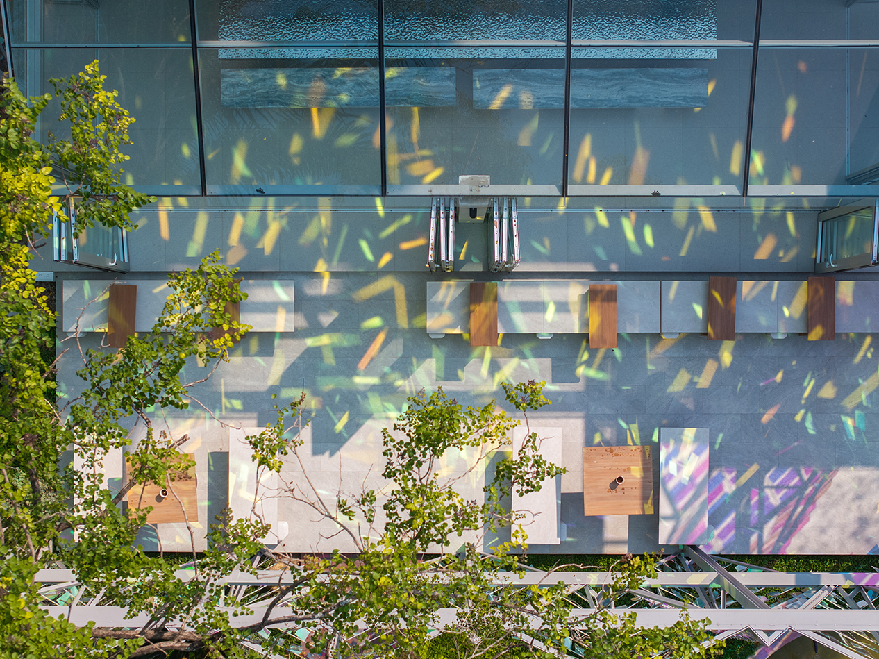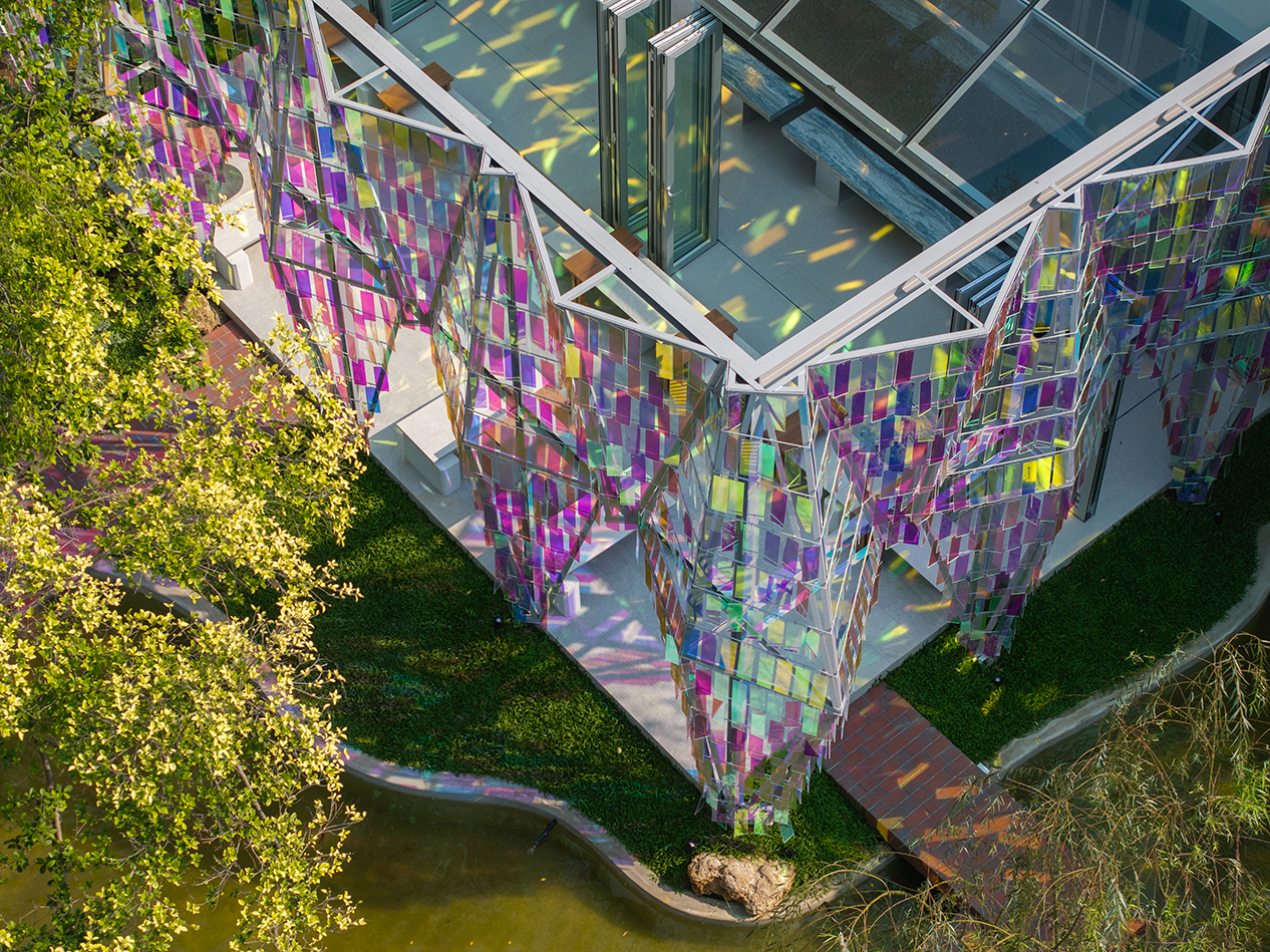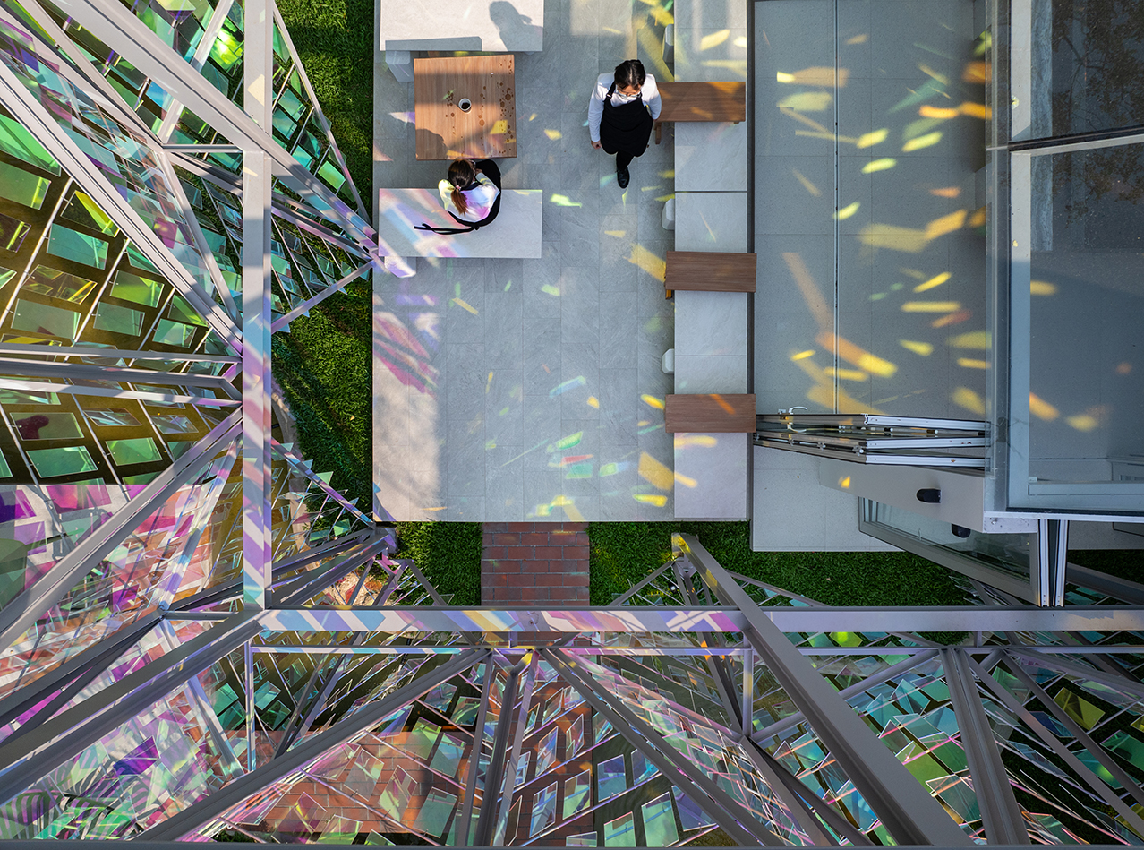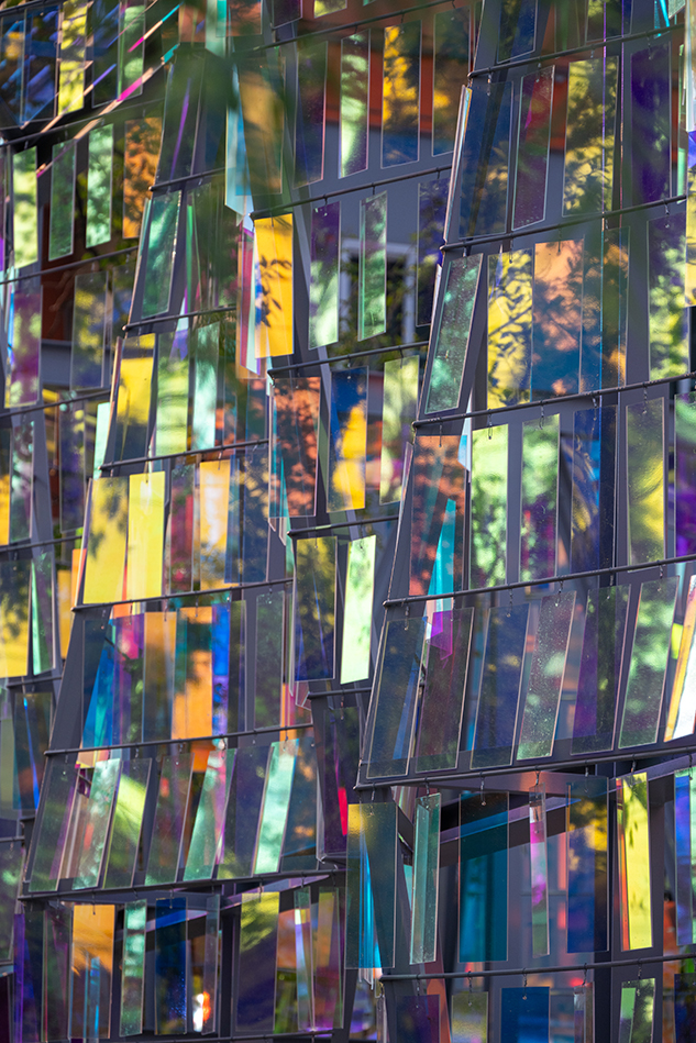 다이아몬드의 절면(facet) 형태에서 영감을 받은 새로운 확장부는 강철 구조 프레임에 이색성 필름(dichroic film)이 코팅된 아크릴 패널로 마감되었다. 이 패널은 태양의 각도와 시간에 따라 오묘하게 색이 변하며 반짝이고, 건물을 살아 있는 보석처럼 빛과 함께 춤추게 한다.