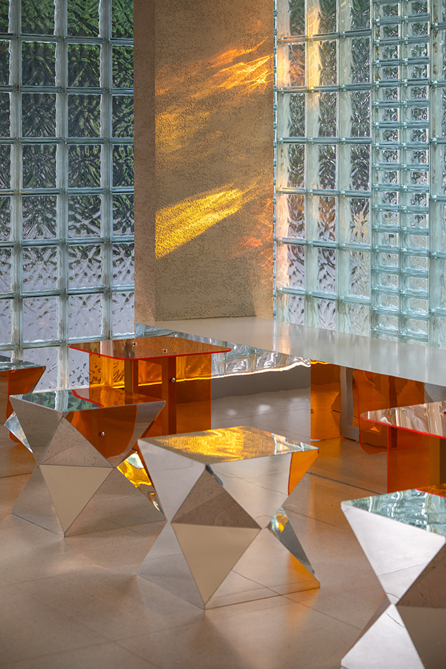 바 카운터는 날카롭게 절제된 면으로 형성되어 거울 알루미늄으로 마감되었으며, 바닥에 다이아몬드의 광채 같은 반사 효과를 만들어낸다. 천장에는 아크릴 패널이 섬세하게 매달려 있어 공기에 흔들리며 각도에 따라 빛을 받아낸다. 가구는 원석 형태에서 영감을 받아 디자인되었으며, 유광 라미네이트와 컬러 아크릴로 감싸 특정 보석의 색감을 구현하여 공간에 생동감을 불어넣는다.