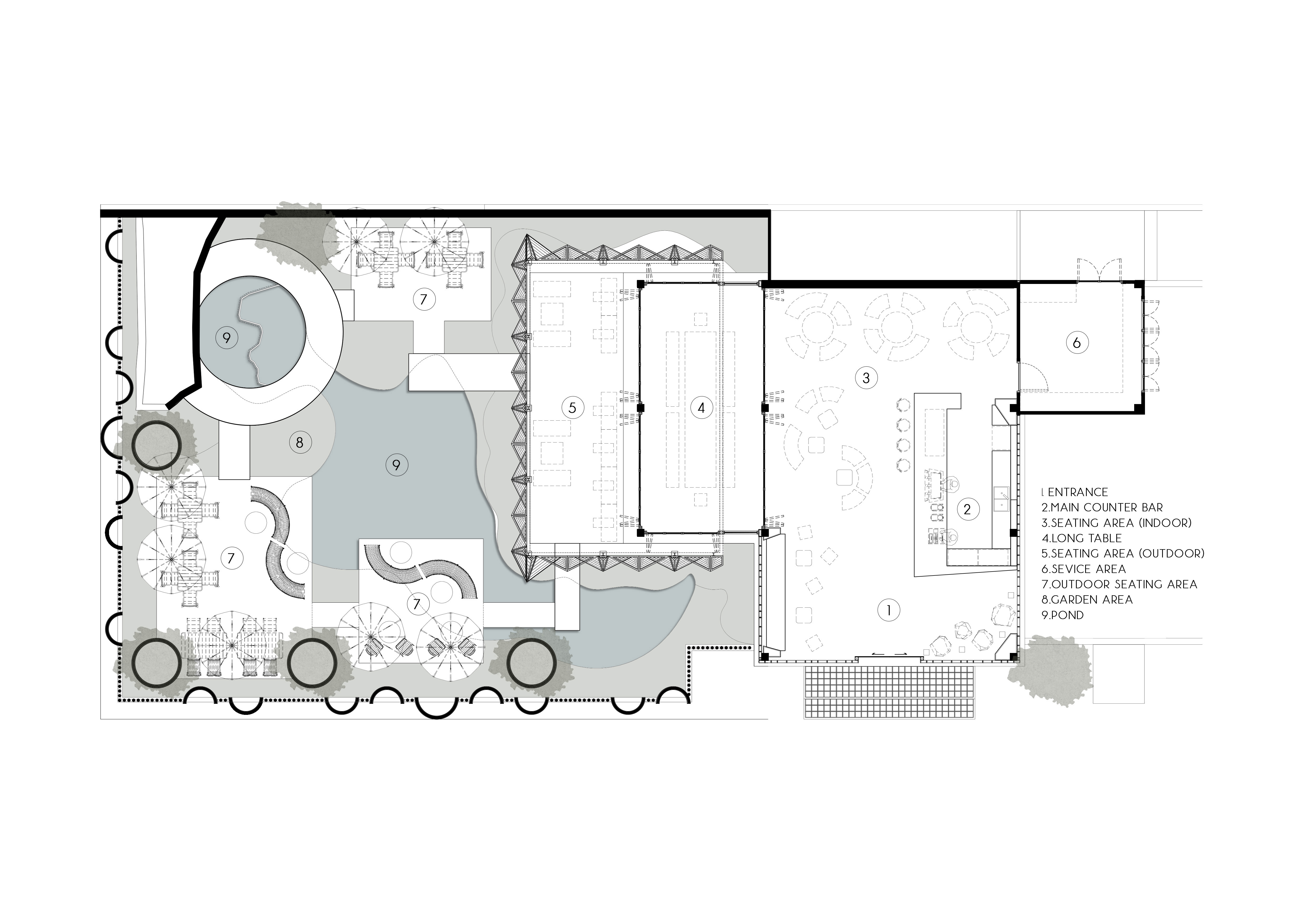 정원은 단순하면서도 고요한 분위기를 의도하였다. 잎이 무성한 초록 식재는 건물의 기하학적 형태와 대비를 이루며, 자유로운 형태의 연못은 야외 좌석을 따라 흐르며 건축을 반사하고 생동감을 더한다.