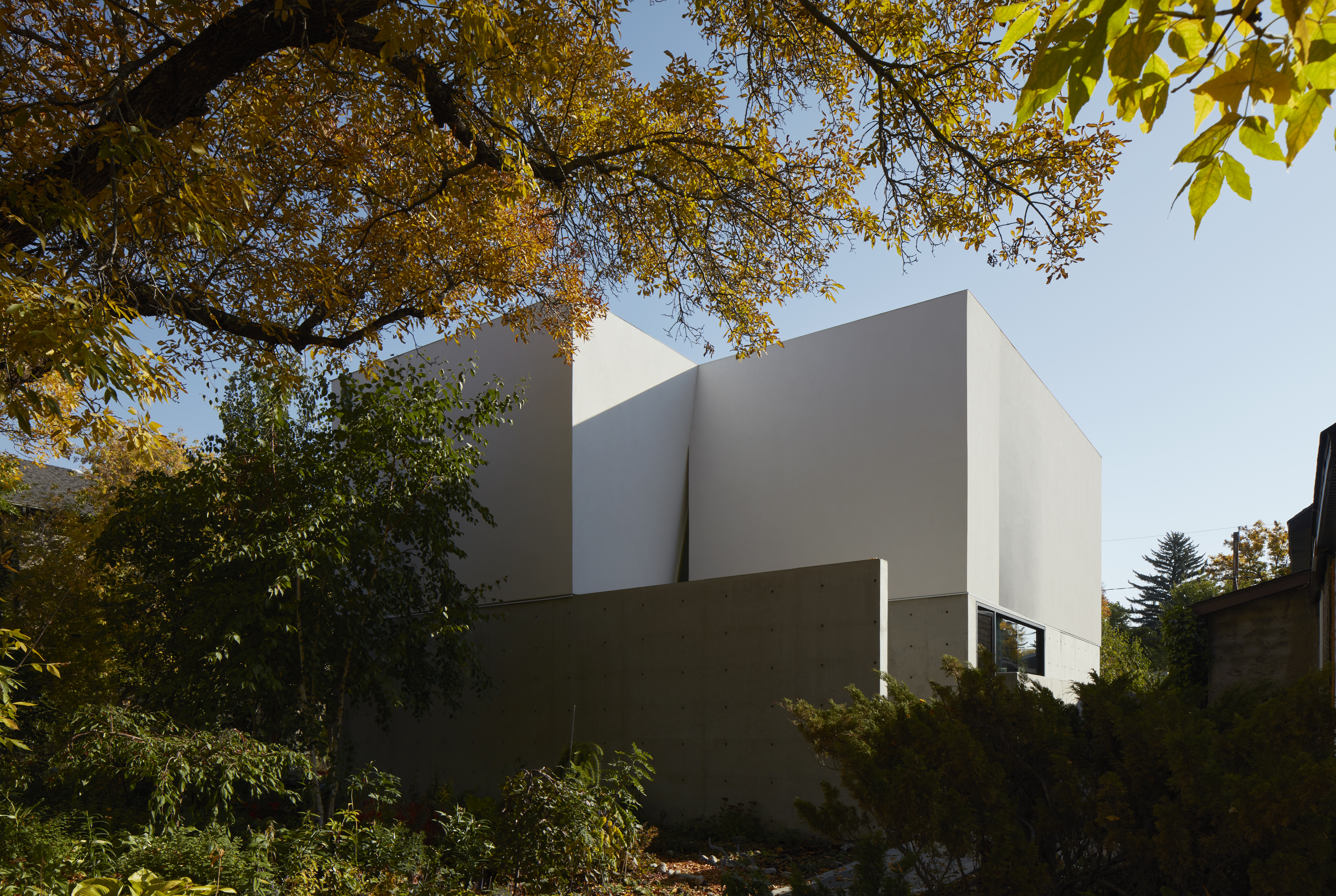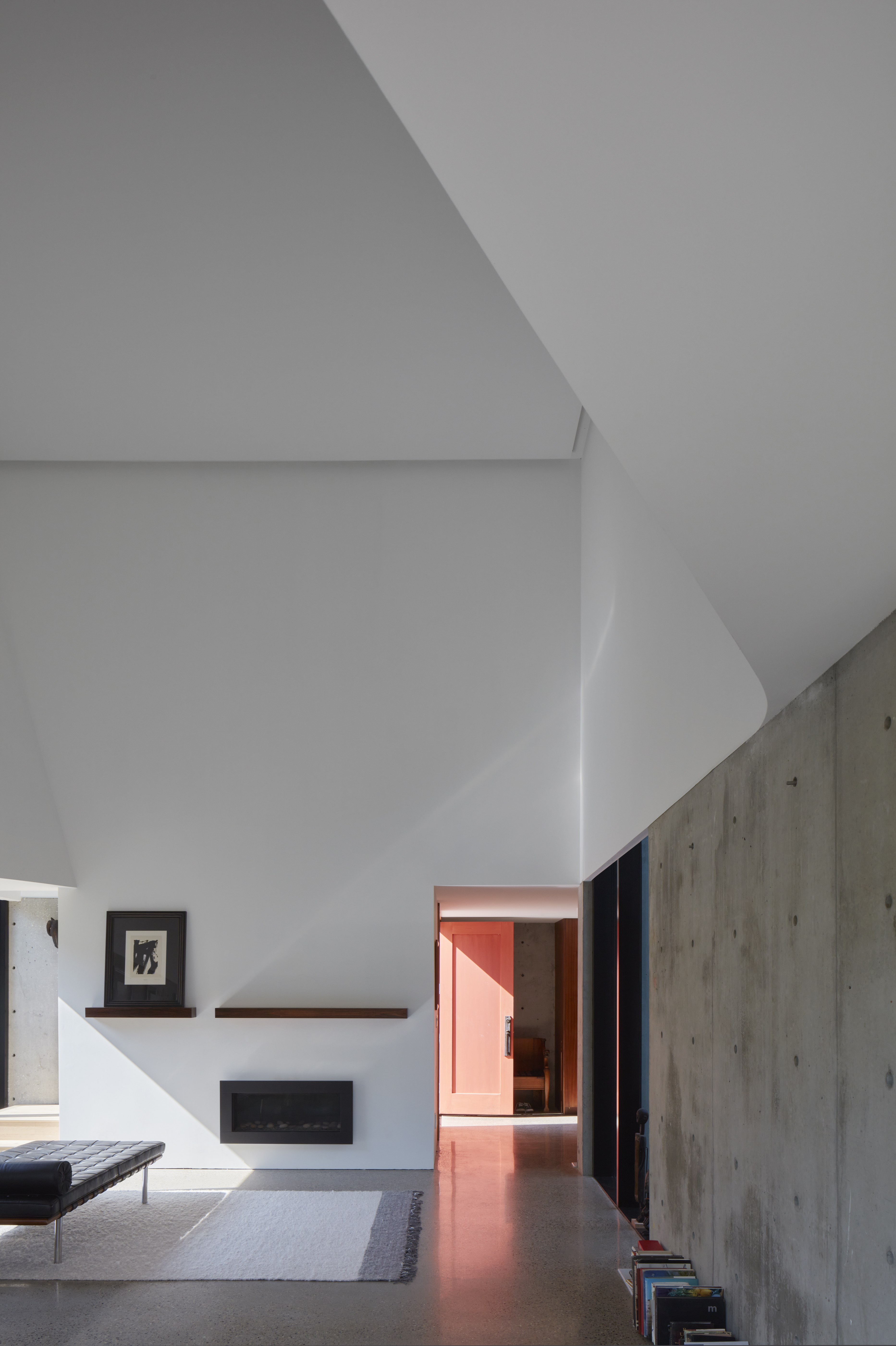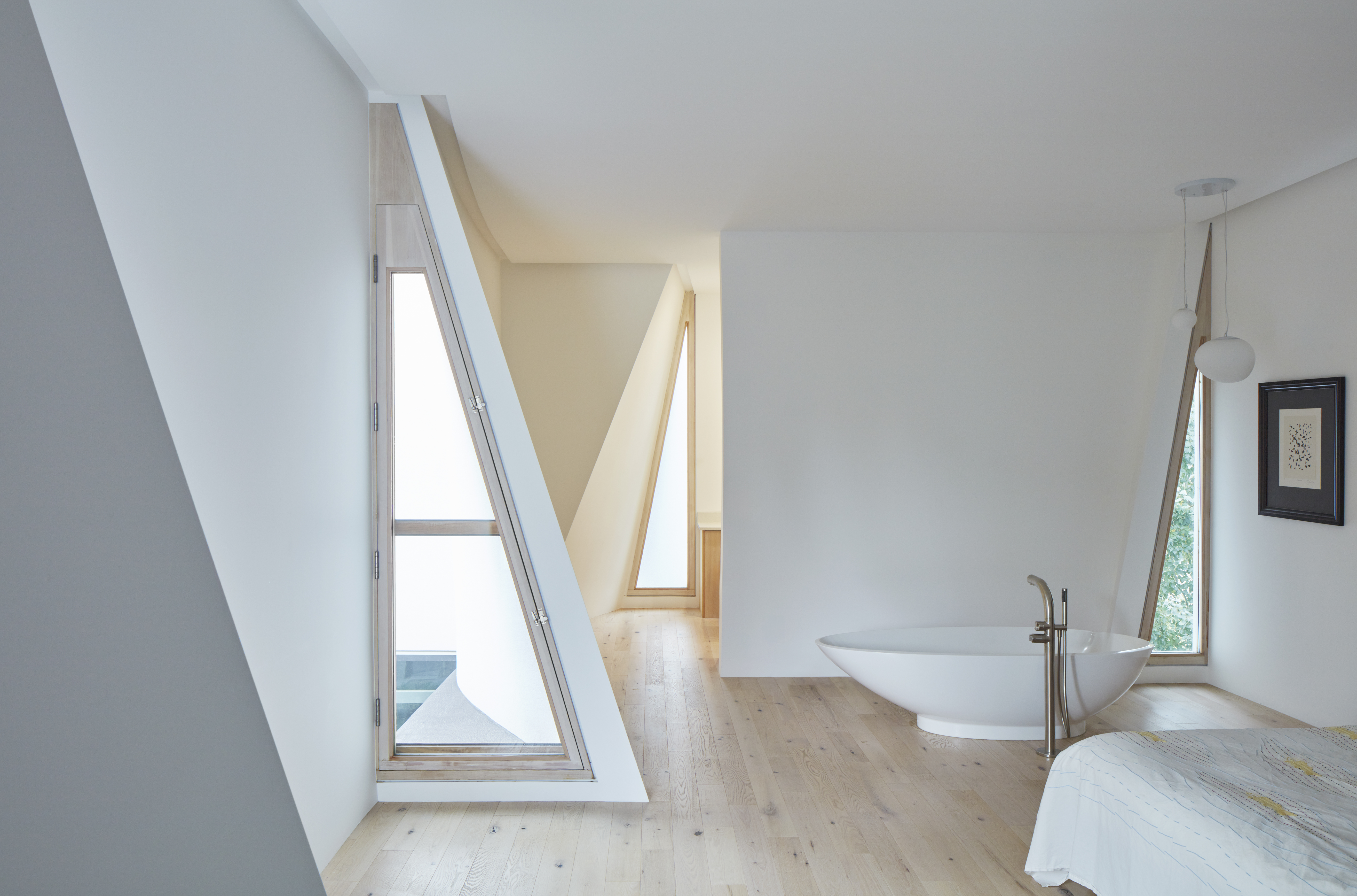 1층은 내부 정원 뷰로 열리면서도 외부로는 보호적인 껍질로 계획되었다. 2층은 주변 마을과 수목 캐노피를 향한 은밀한 조망을 제공하는 가벼운 피난처와 같다. 흰색 회반죽 벽은 커튼처럼 안쪽으로 휘어져 바람을 끌어들이고, 삼각형의 빈 공간을 만들어 부드러운 빛이 실내를 씻어내리듯 흘러들게 한다. 이 비틀린 프레임은 목수가 직접 제작한 목재 프레임 창으로 채워져 있다. 전반적으로 은은한 분위기는 긴장감 넘치는 직업 후에 쉴 수 있는 배경이 된다.