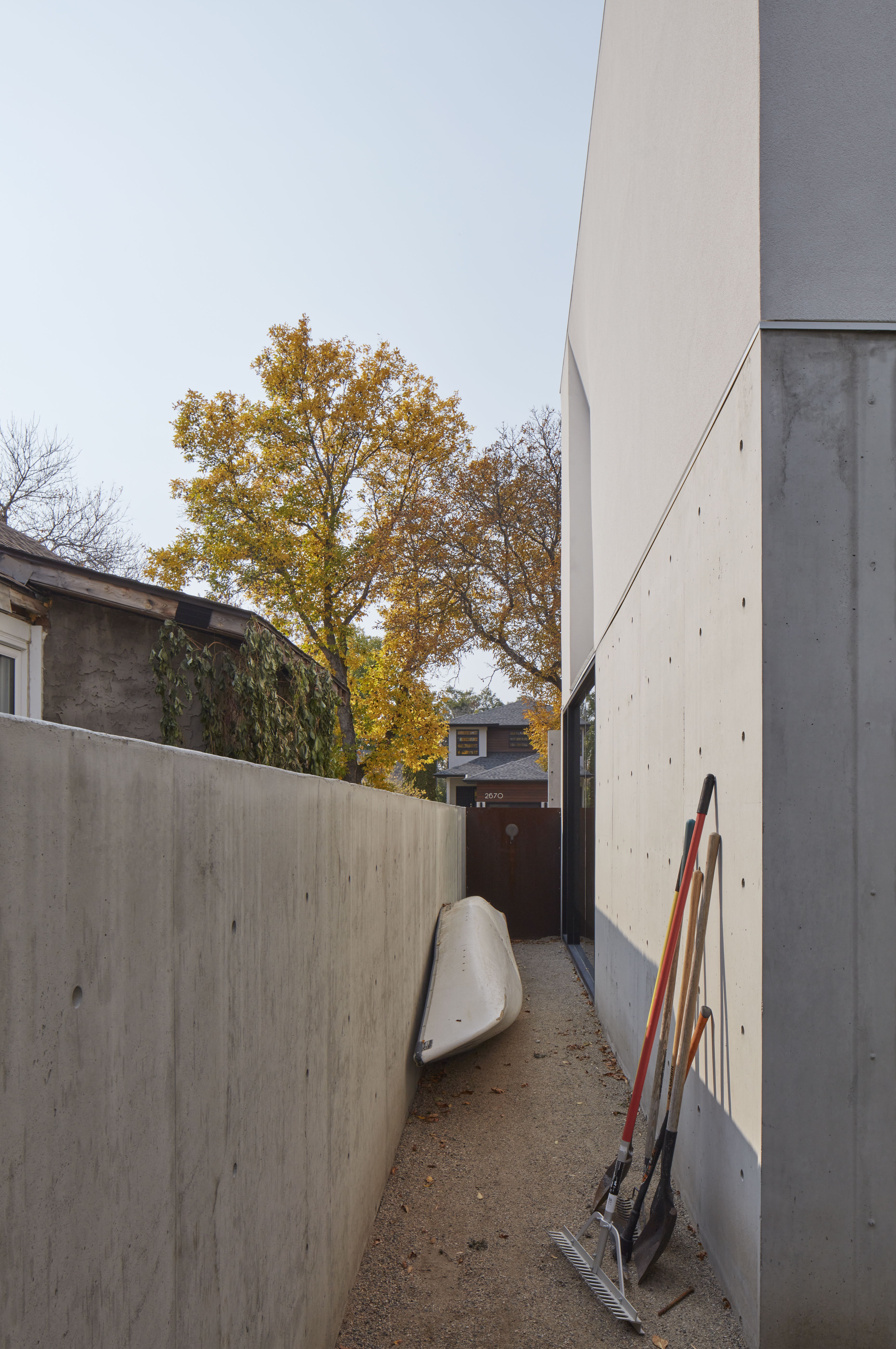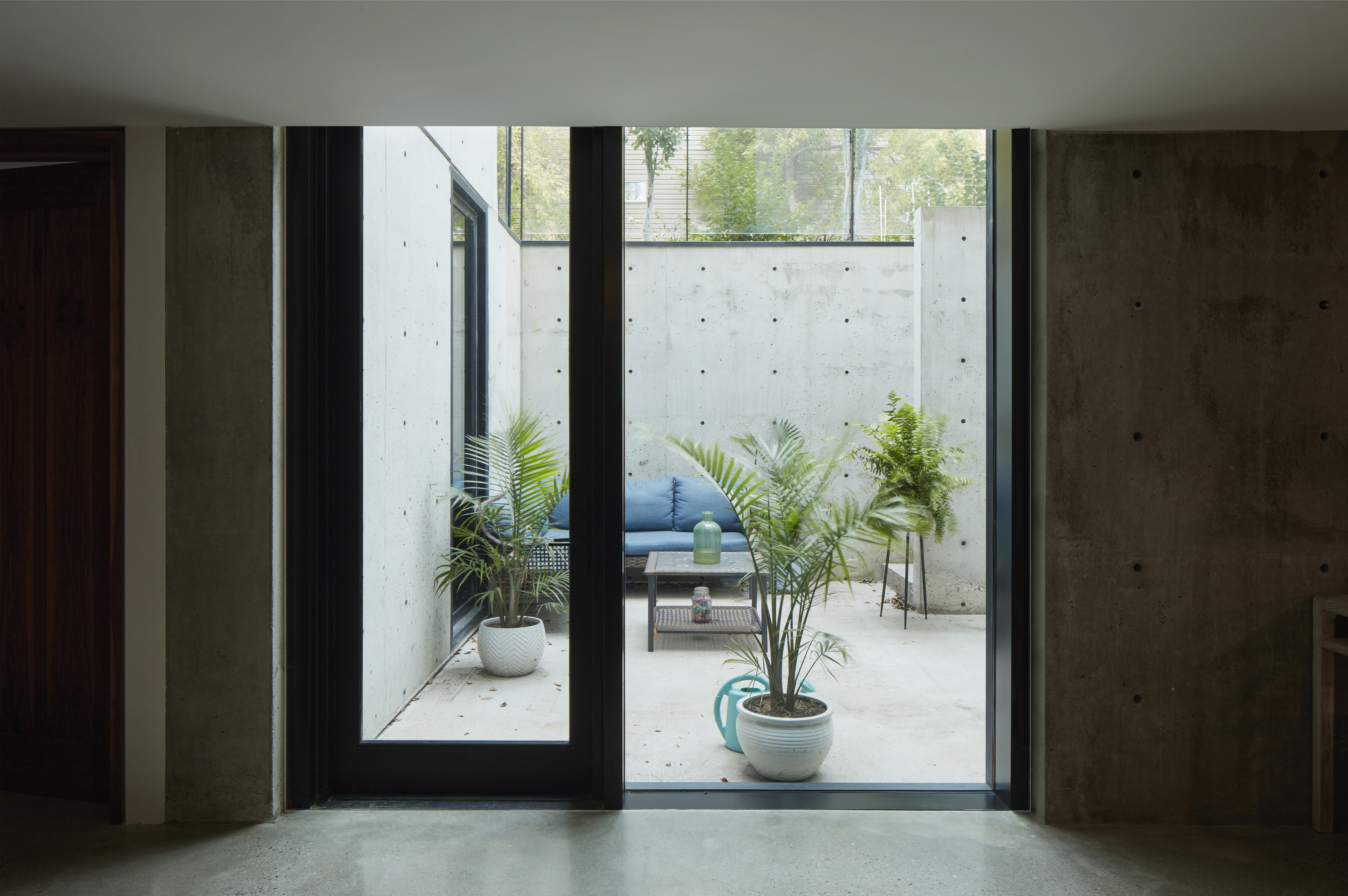 측면의 이격거리는 흔히 고려되지 않은 자투리 공간을 만든다. 그러나 아더 레지던스는 대지의 전 폭을 활용하며 담장과 벽을 결합시켜 길가에서 보기에 하나의 단단한 매스로 보이게 했다. 단 한 곳의 틈으로 이어지는 길은 내부의 세계로 진입하도록 유도한다. 이 집은 대지 위에 정원을 배치하는 대신 대지 자체를 파내어 만든 세 개의 정원, 즉 진입 마당, 주 정원, 그리고 선큰 파티오로 구성된다. 실내에서는 현관, 거실·식당, 주방·유틸리티 동이 사방의 작은 정원들을 향해 시선을 열어준다.
