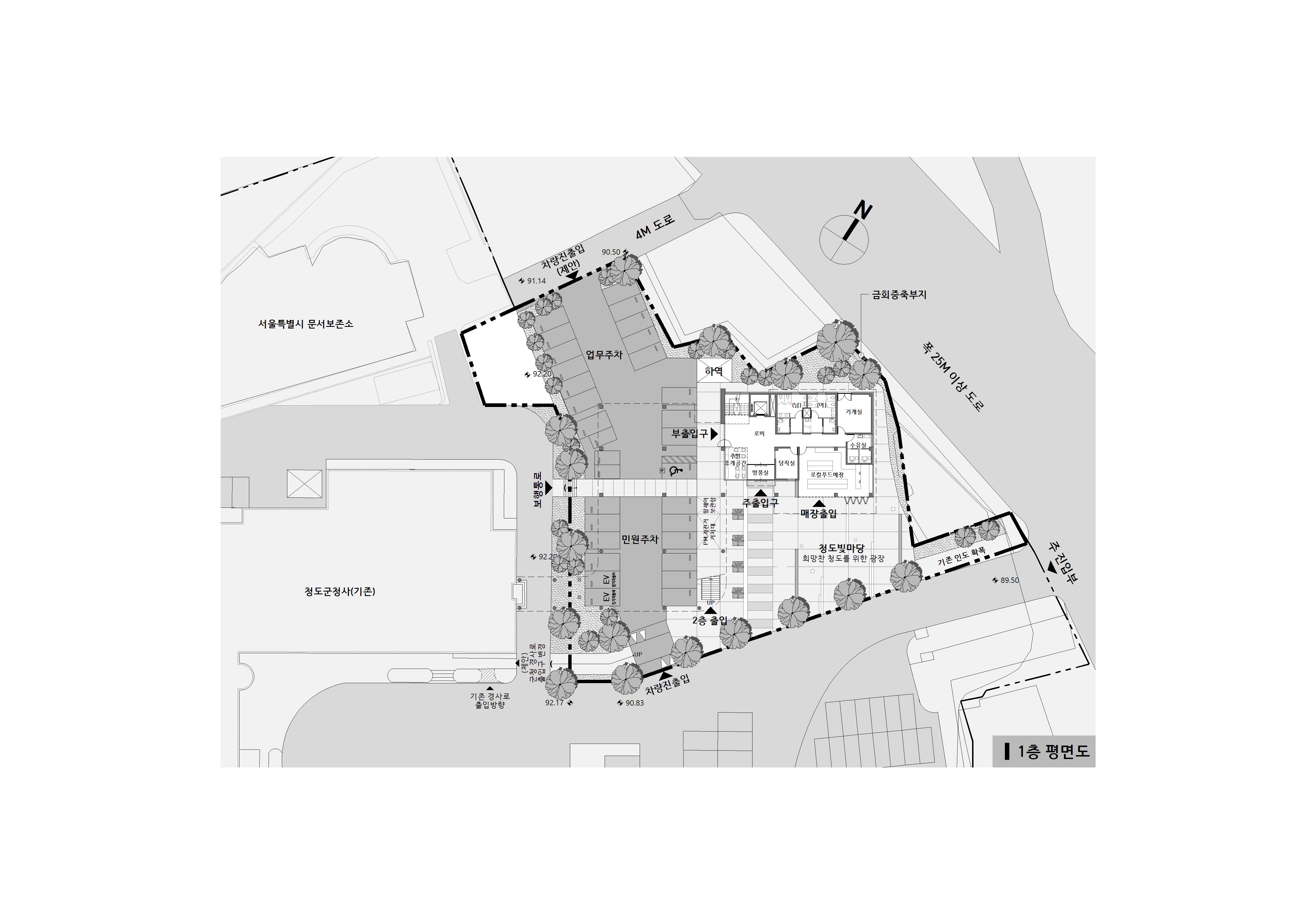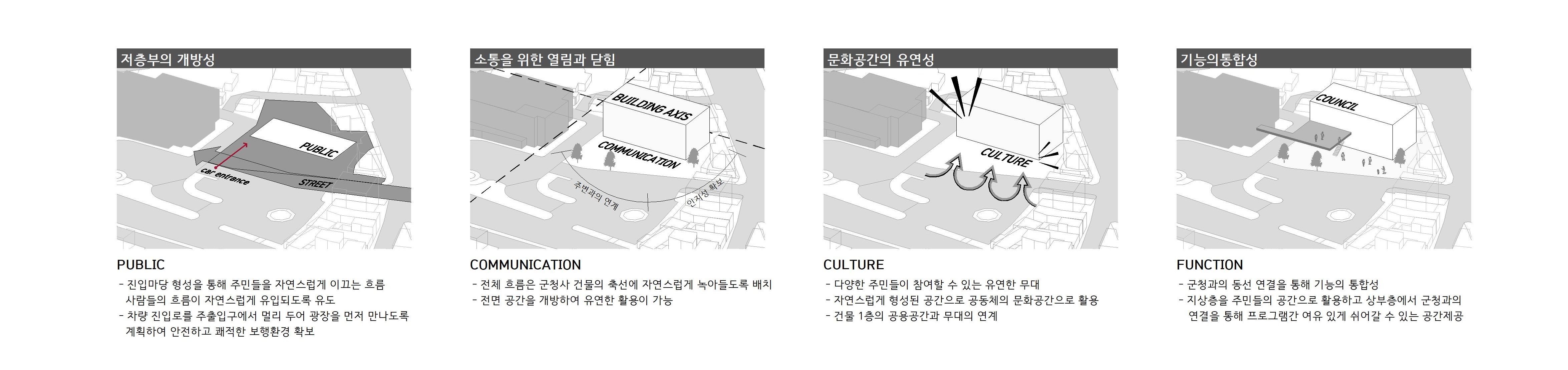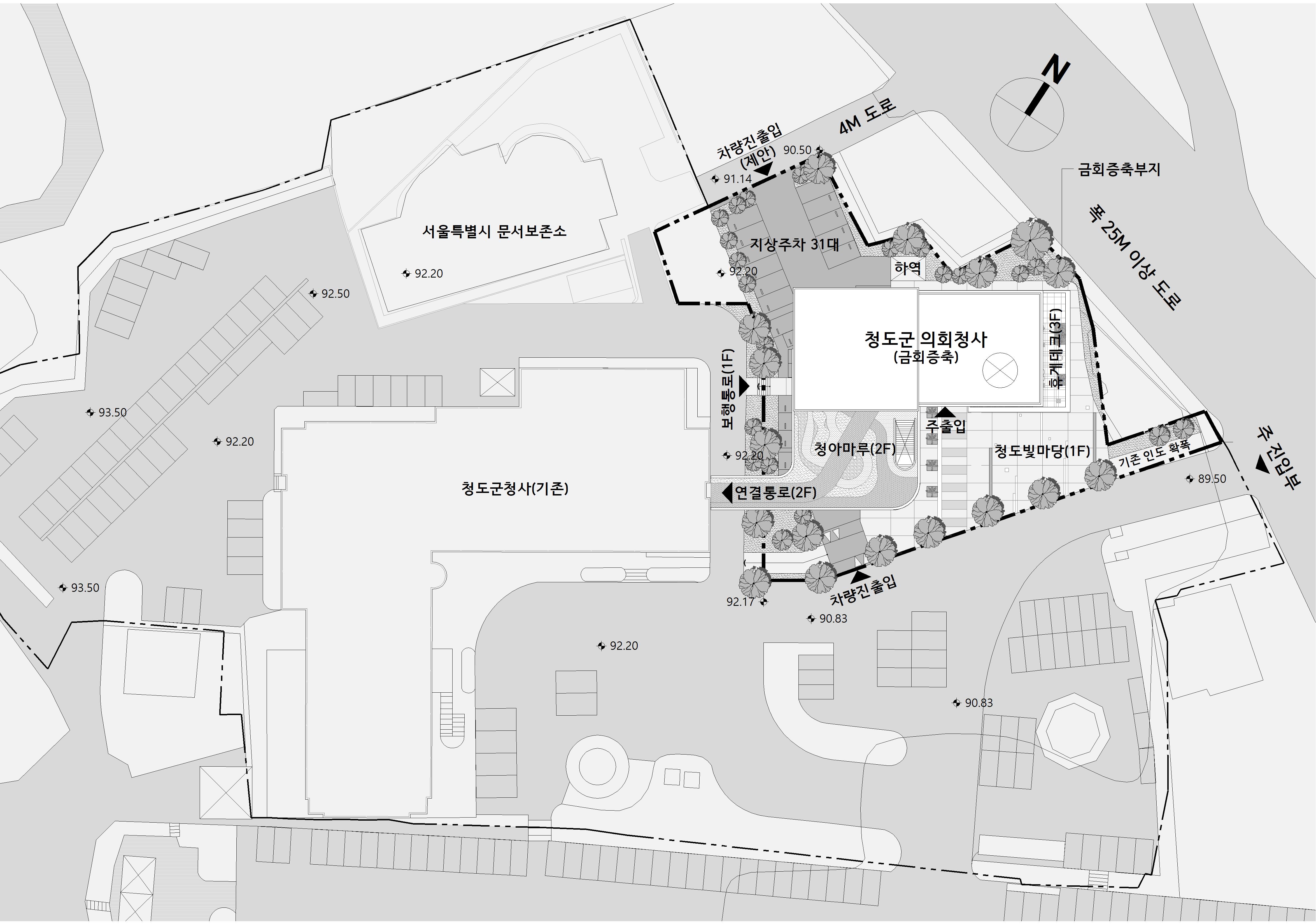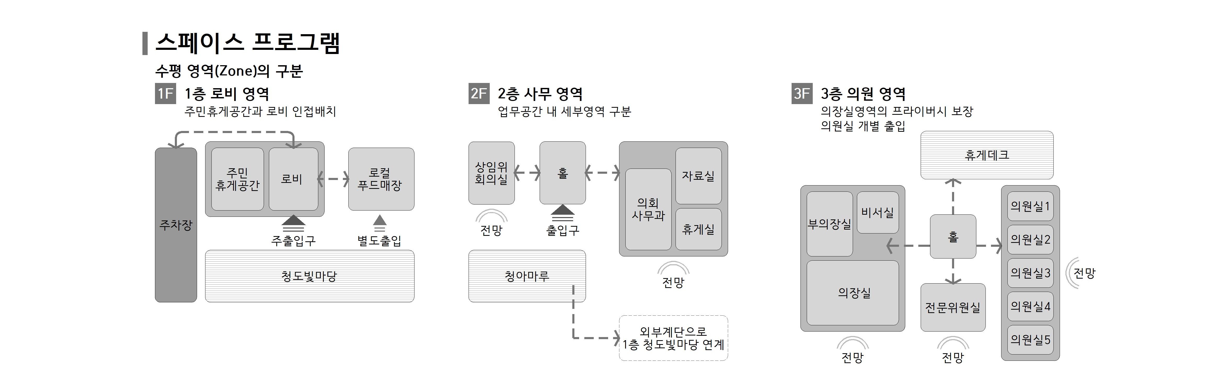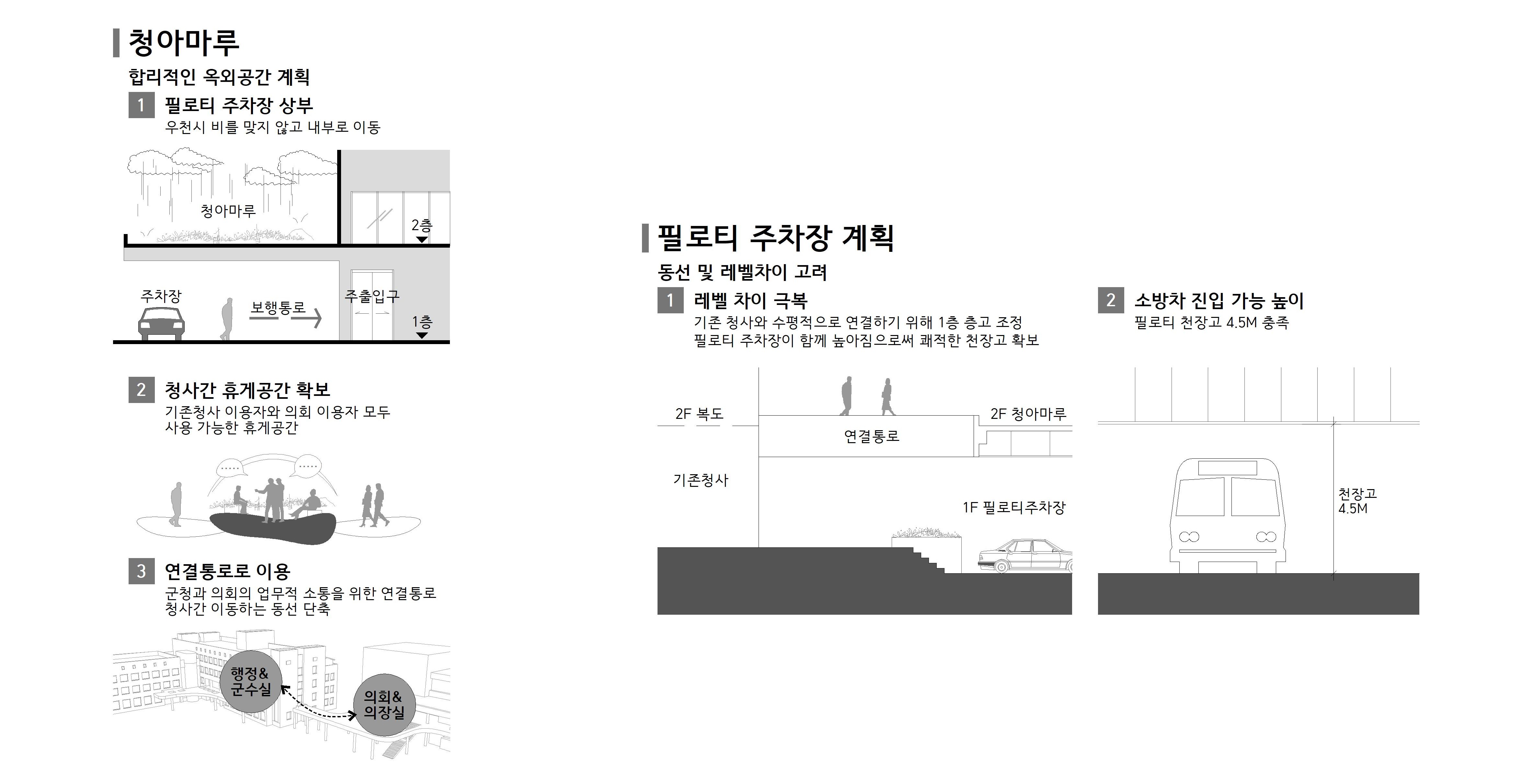 처음 청도군의회 청사 증축공모 설계를 위하여 군청을 방문하였을때 군청이라는 주민의 행정과 복지를 위한 영역에 대부분의 외부공간이 주차장으로 조성되어있어 주출입구에서 군청까지의 보행자 동선은 주차장을 가로질러 가야하며, 휴식을 취할 외부공간이 없는 상황이였다. 따라서 금회 의회청사 증축계획시 우선적으로 군청진입부분에 주민을 위한 마당을 조성하고 보행자동선과 차량동선의 분리를 통하여 주민과 교통약자가 안전하고 편리하게 군청과 의회를 이용하도록 구성하는 것을 계획의 주안점으로 삼았다.
