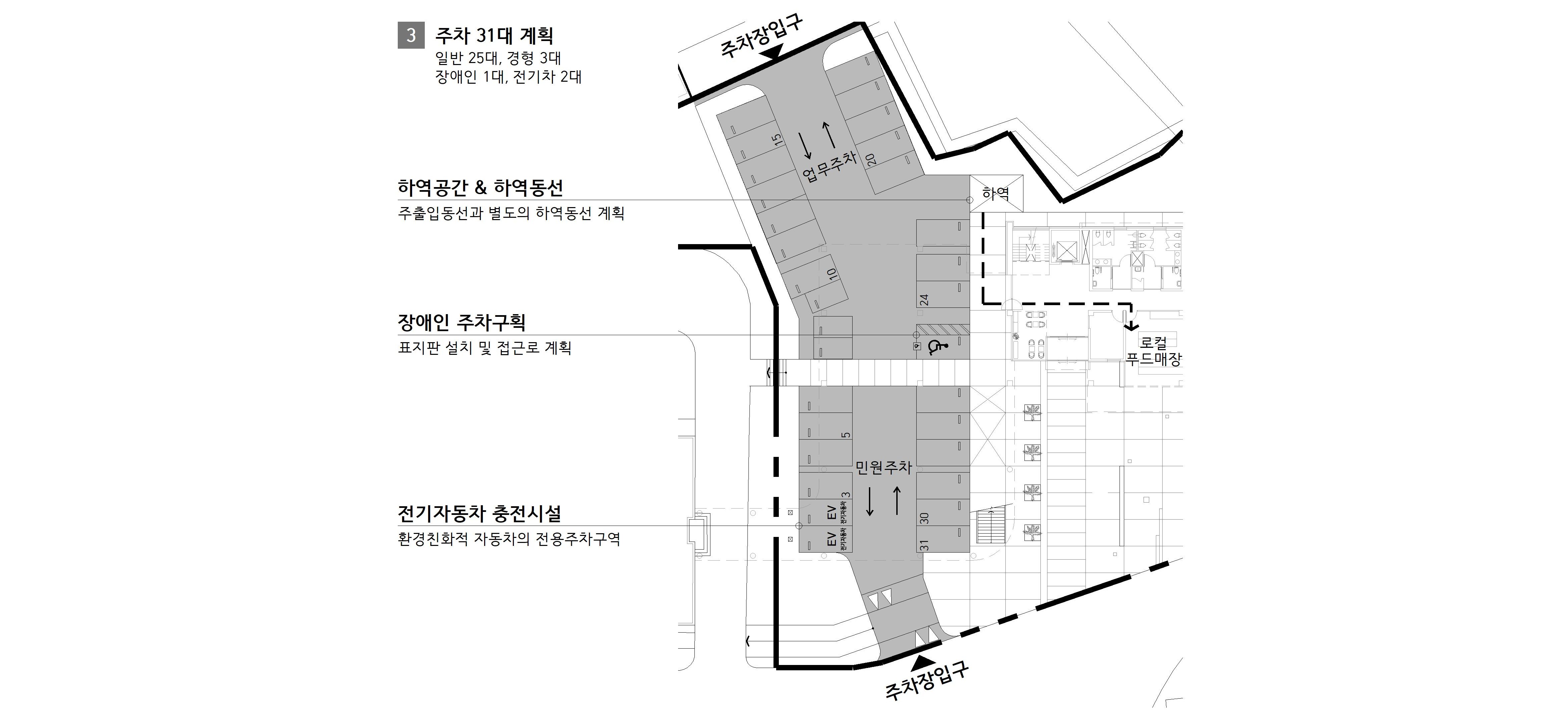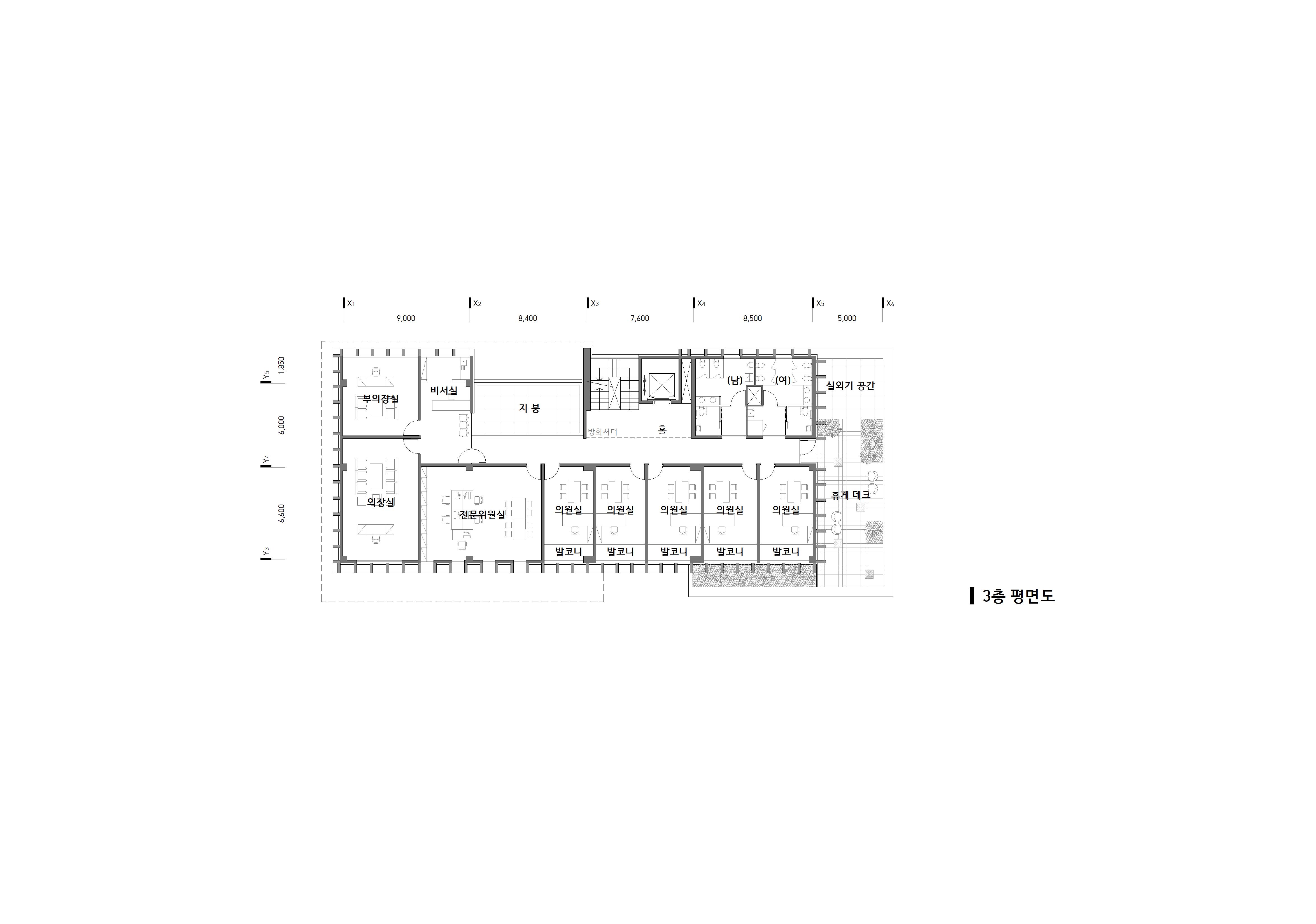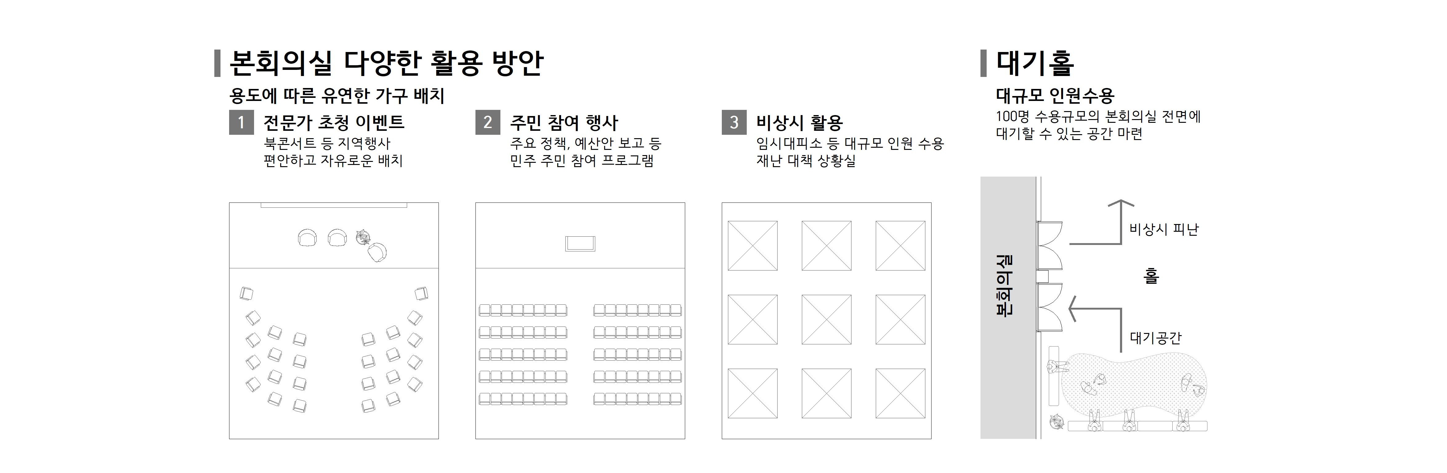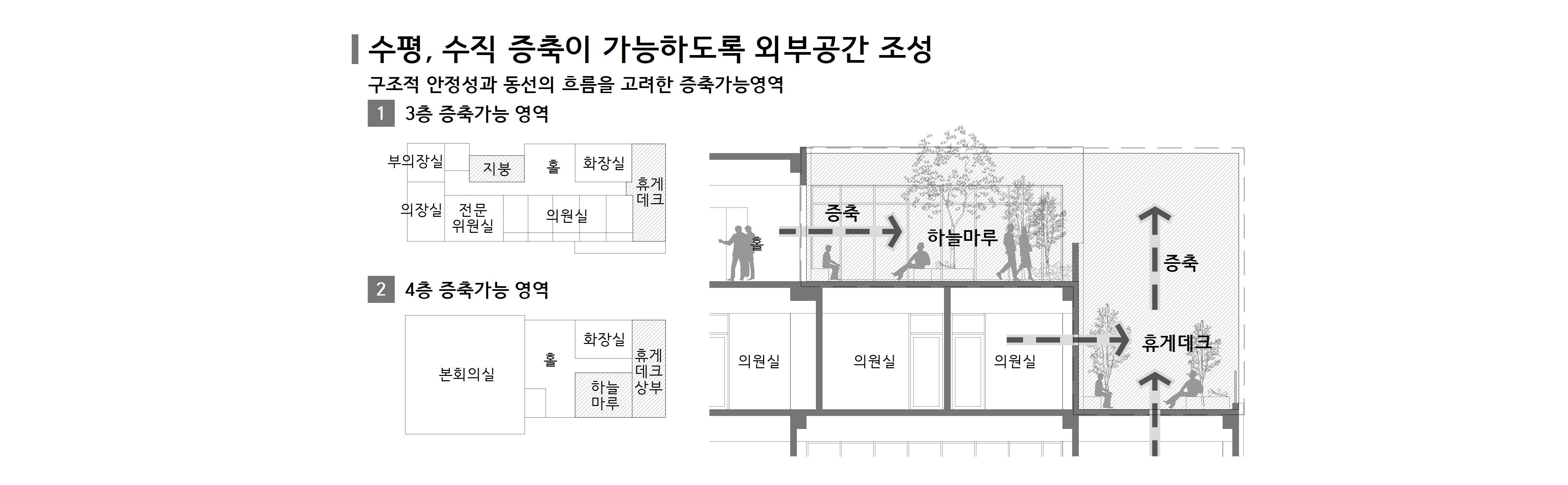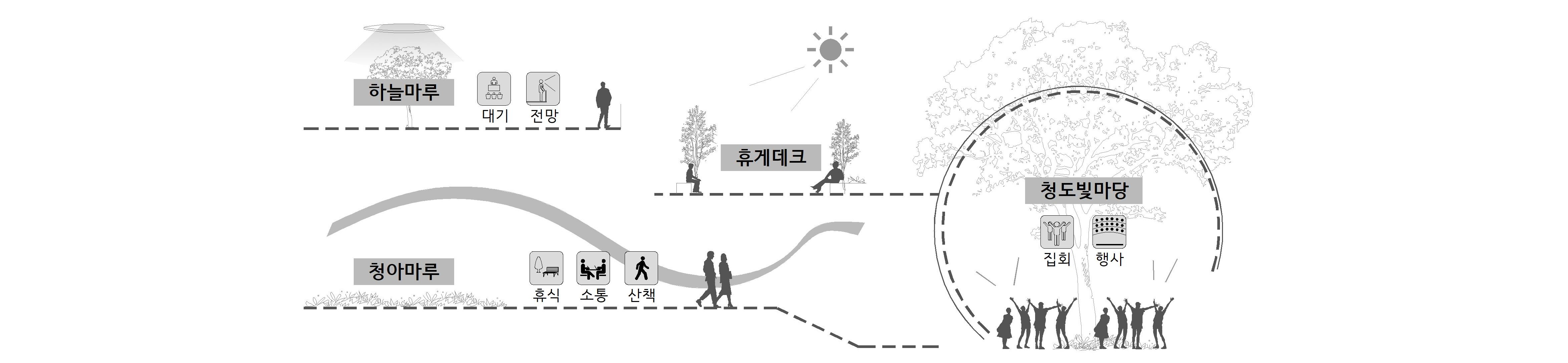 처음 청도군의회 청사 증축공모 설계를 위하여 군청을 방문하였을때 군청이라는 주민의 행정과 복지를 위한 영역에 대부분의 외부공간이 주차장으로 조성되어있어 주출입구에서 군청까지의 보행자 동선은 주차장을 가로질러 가야하며, 휴식을 취할 외부공간이 없는 상황이였다. 따라서 금회 의회청사 증축계획시 우선적으로 군청진입부분에 주민을 위한 마당을 조성하고 보행자동선과 차량동선의 분리를 통하여 주민과 교통약자가 안전하고 편리하게 군청과 의회를 이용하도록 구성하는 것을 계획의 주안점으로 삼았다.
