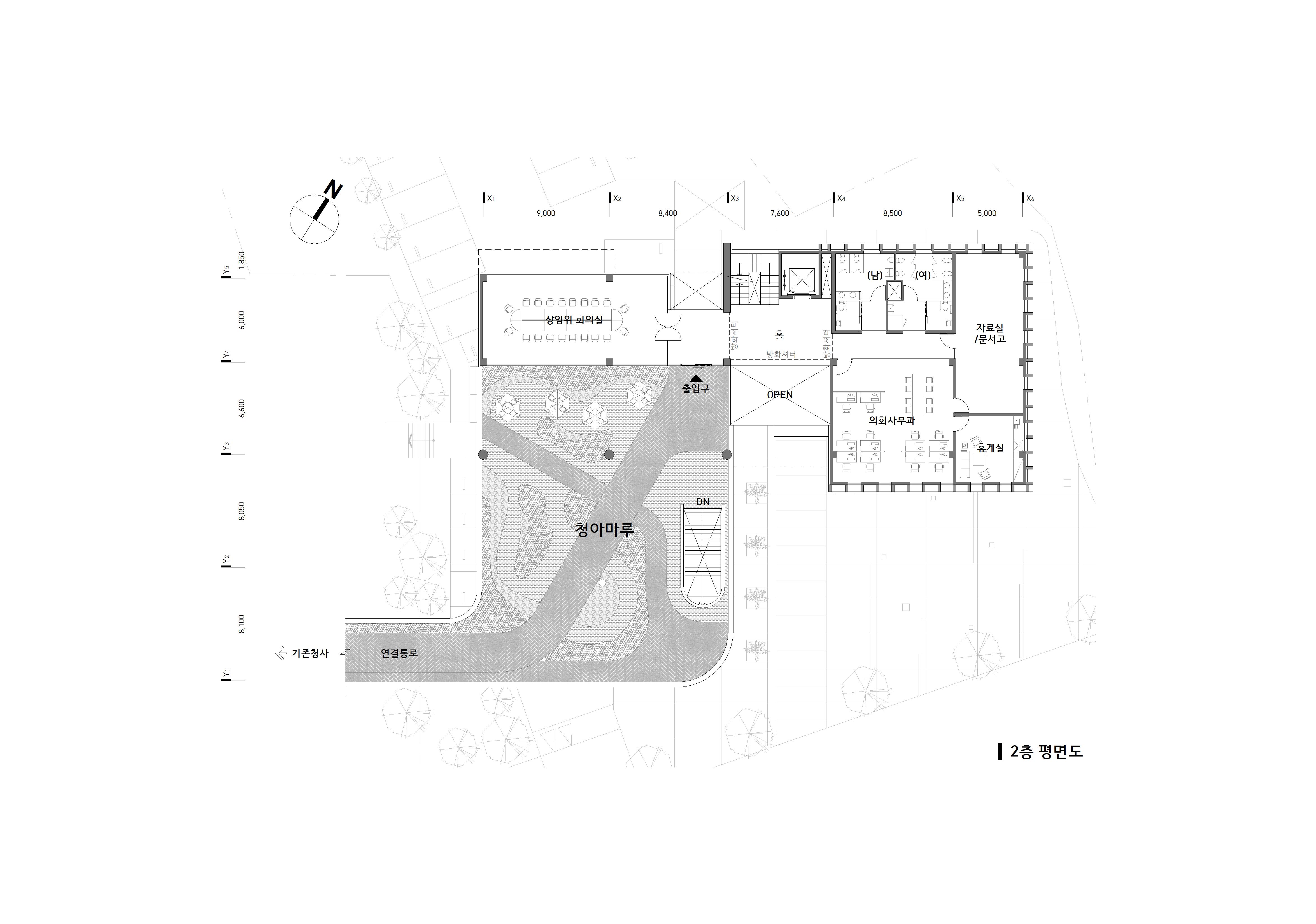 기존군청의 2층과 의회의 2층공간을 데크로 연결하여 상부의 청아마당을 통하여 군청과 의회의 업무적소통과 유기적인 연결을 꾀하였으며, 군청과 의회 근무자와 주민 모두가 이용하고 쉴수 있는 공간을 형성하였다.