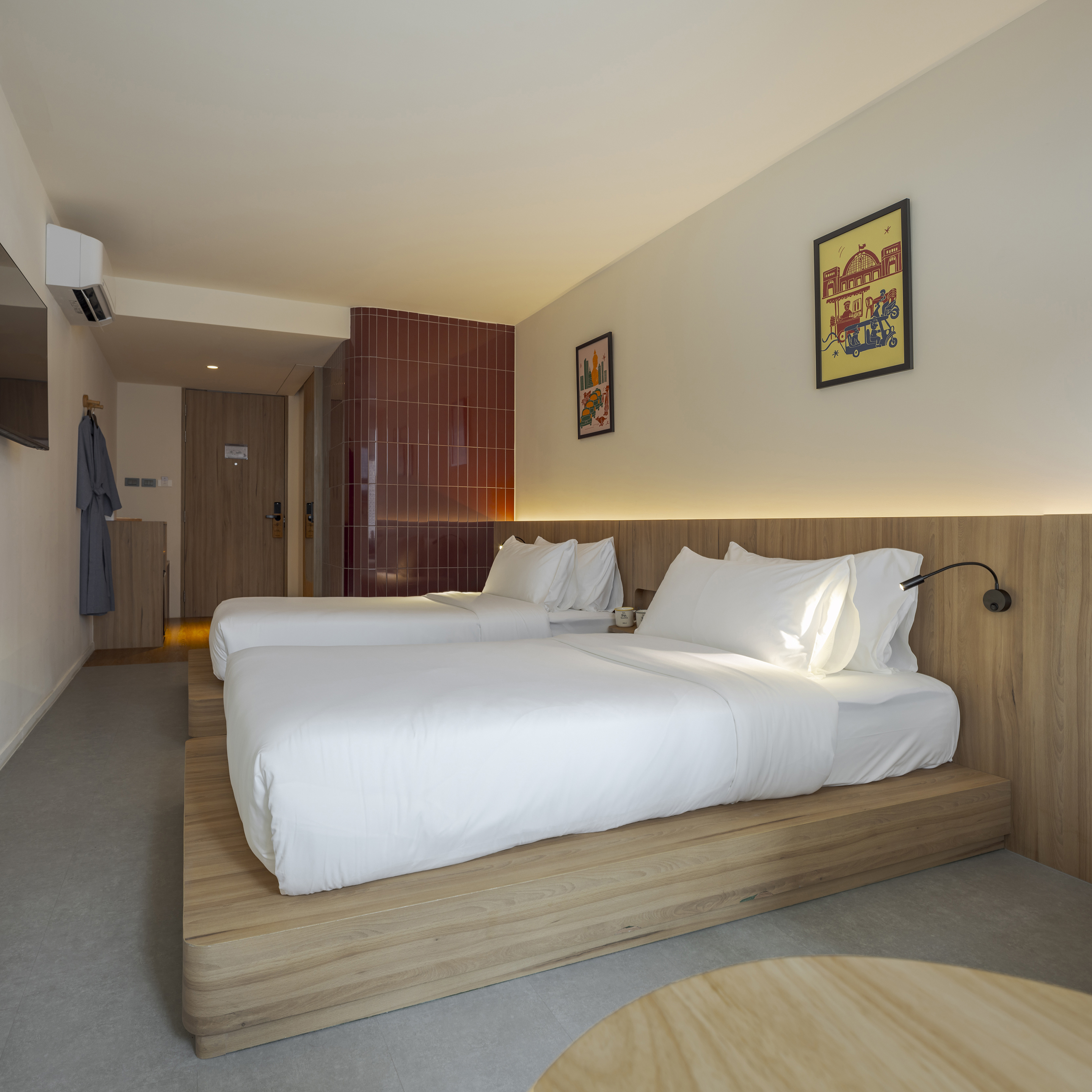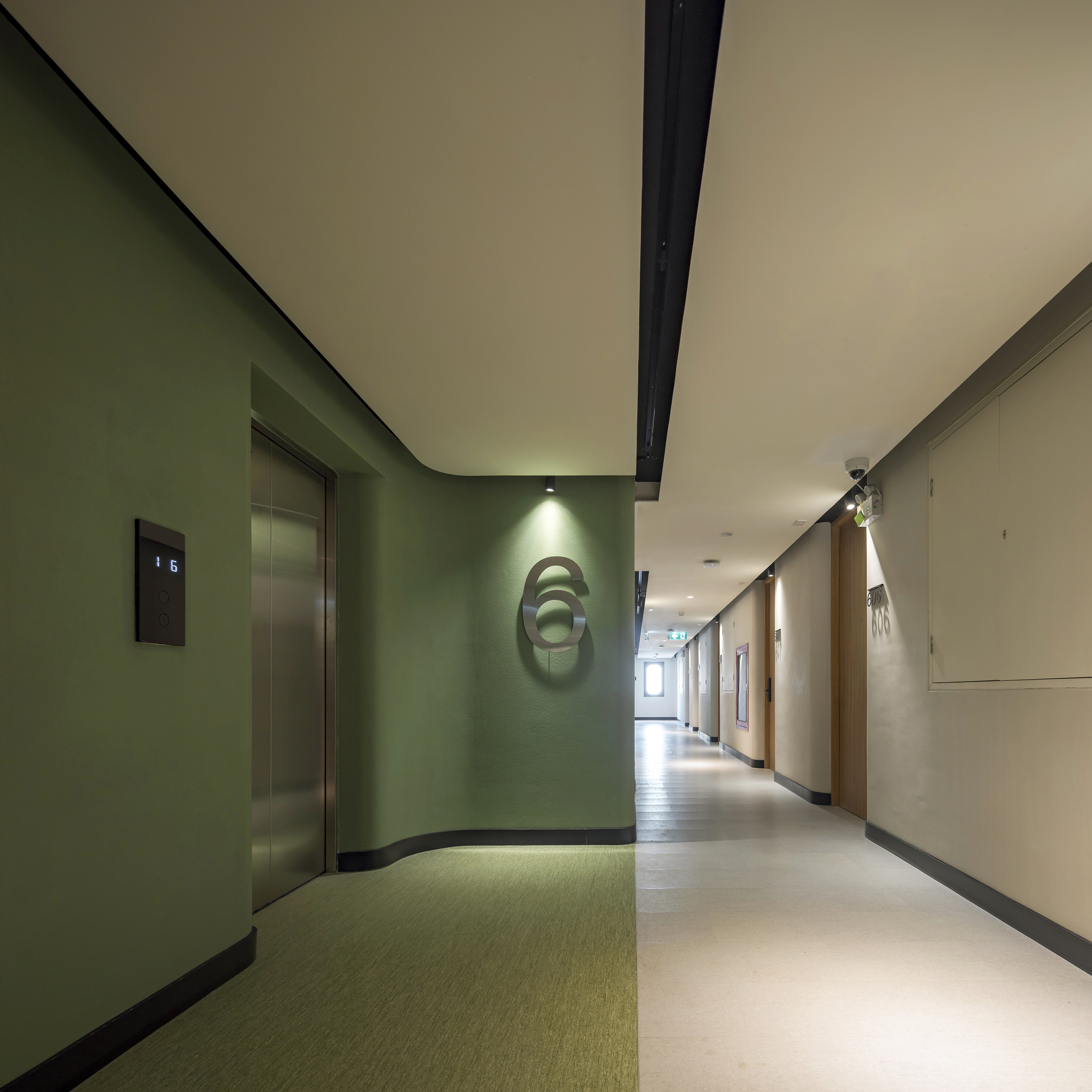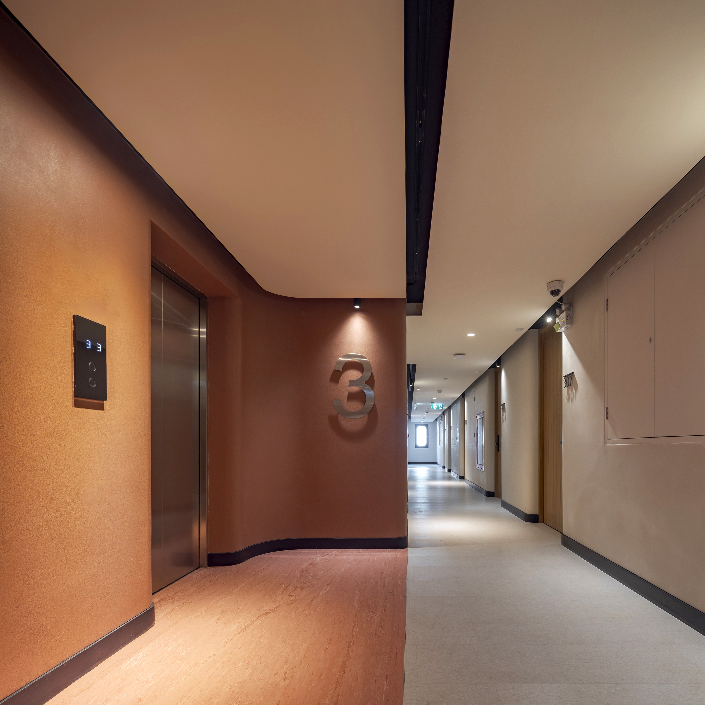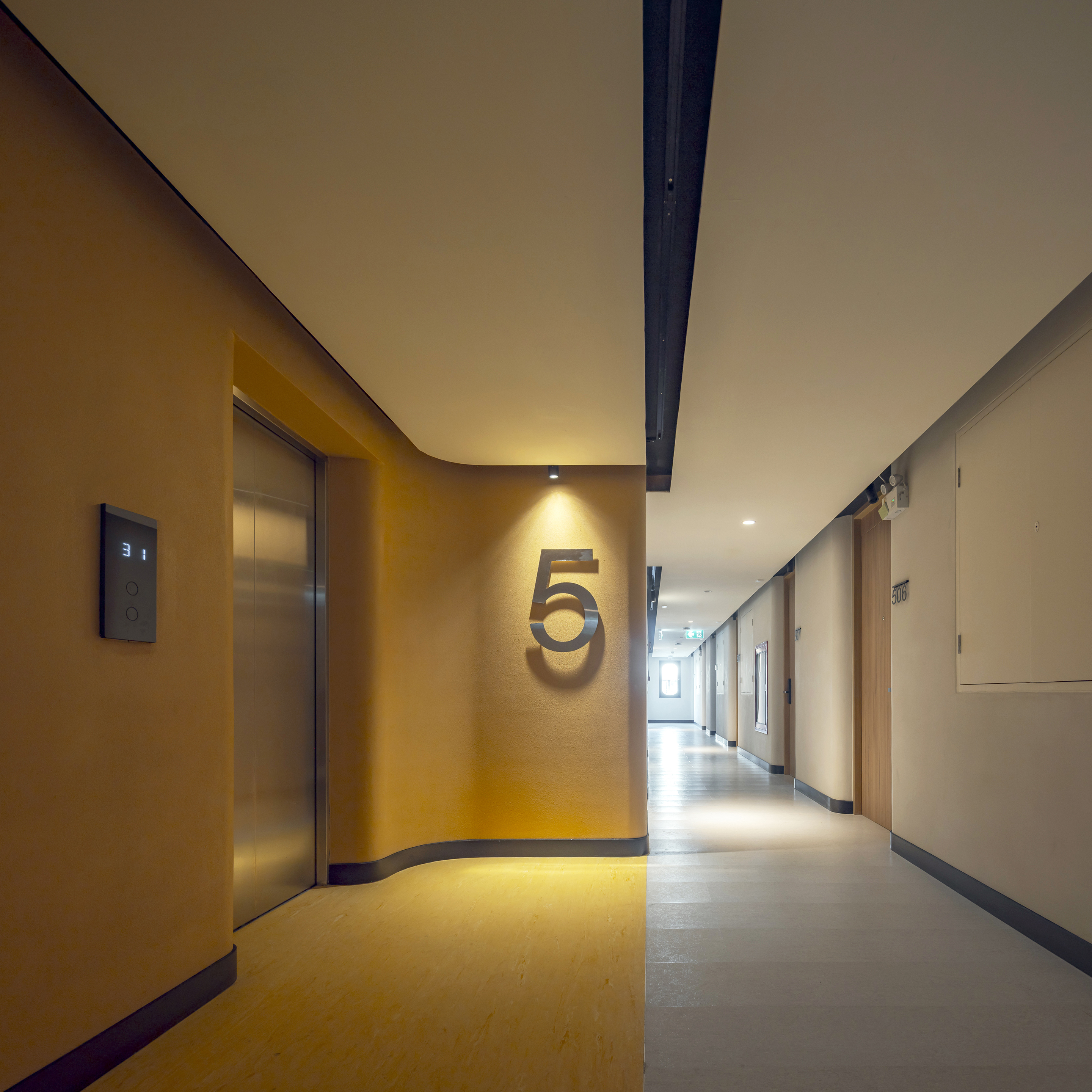 각 층은 층수를 표시하는 고유한 색으로 디자인된 엘리베이터 홀을 통해 개성을 드러낸다. 객실에 가까워질수록 색은 점차 차분하고 은은하게 전환되며, 숙면을 위한 안정적인 분위기를 조성한다. 그러나 차분함 속에서도 장난스러운 요소는 이어진다. 욕실 외벽은 다채로운 타일 패턴으로 마감되어 즐거운 리듬감을 공간에 불어넣는다.