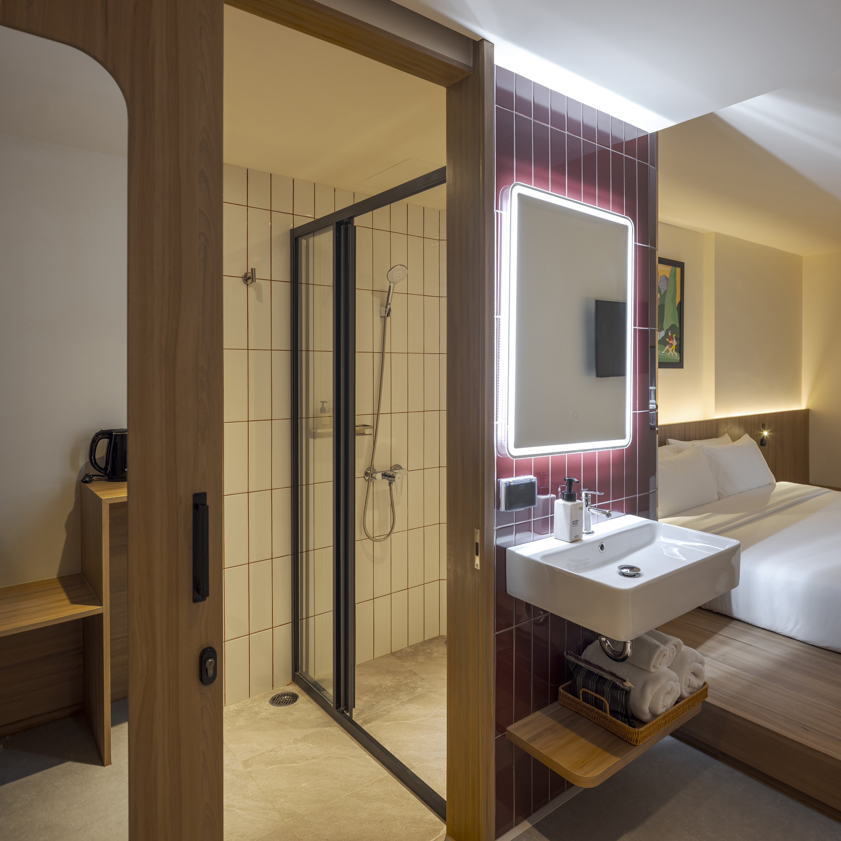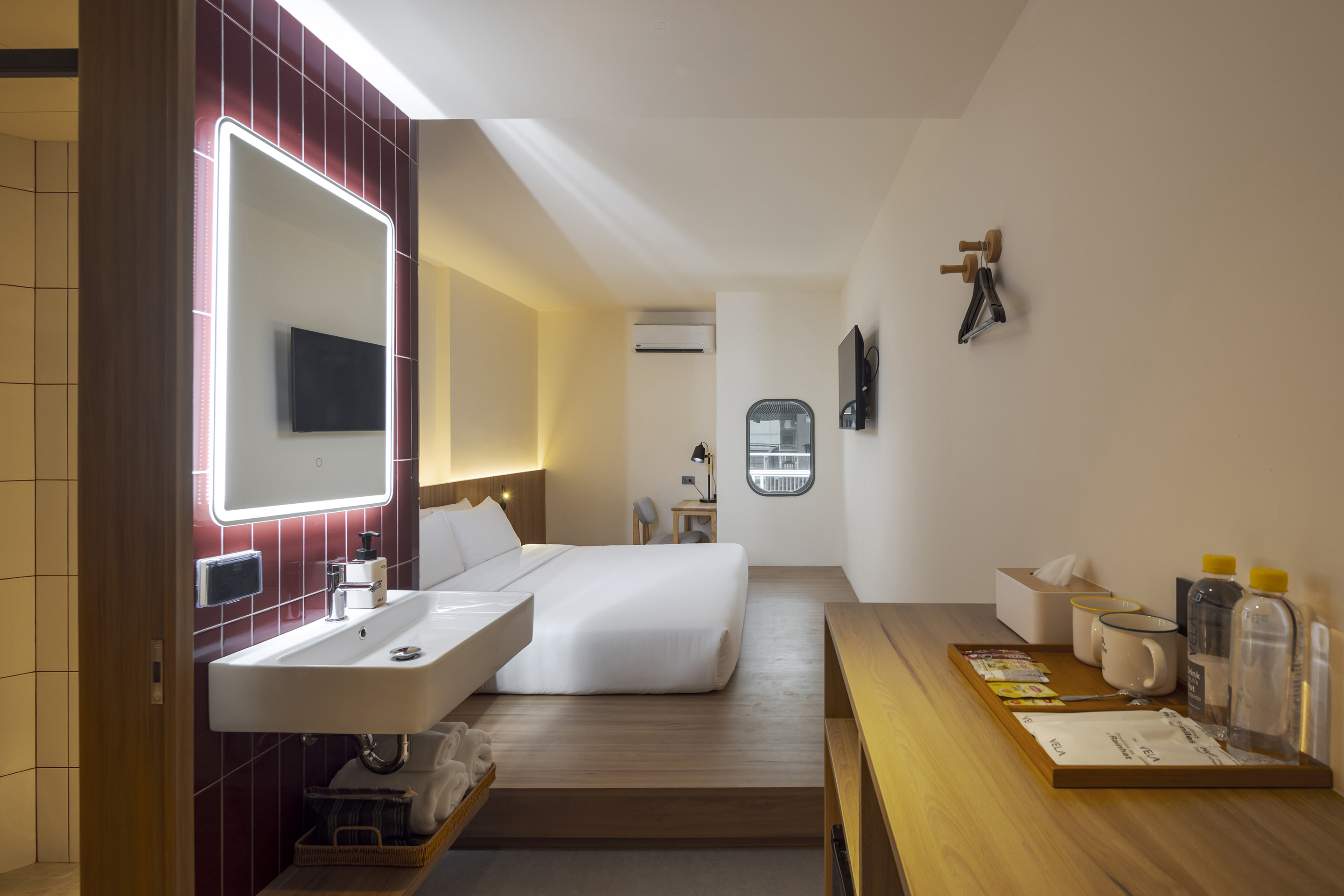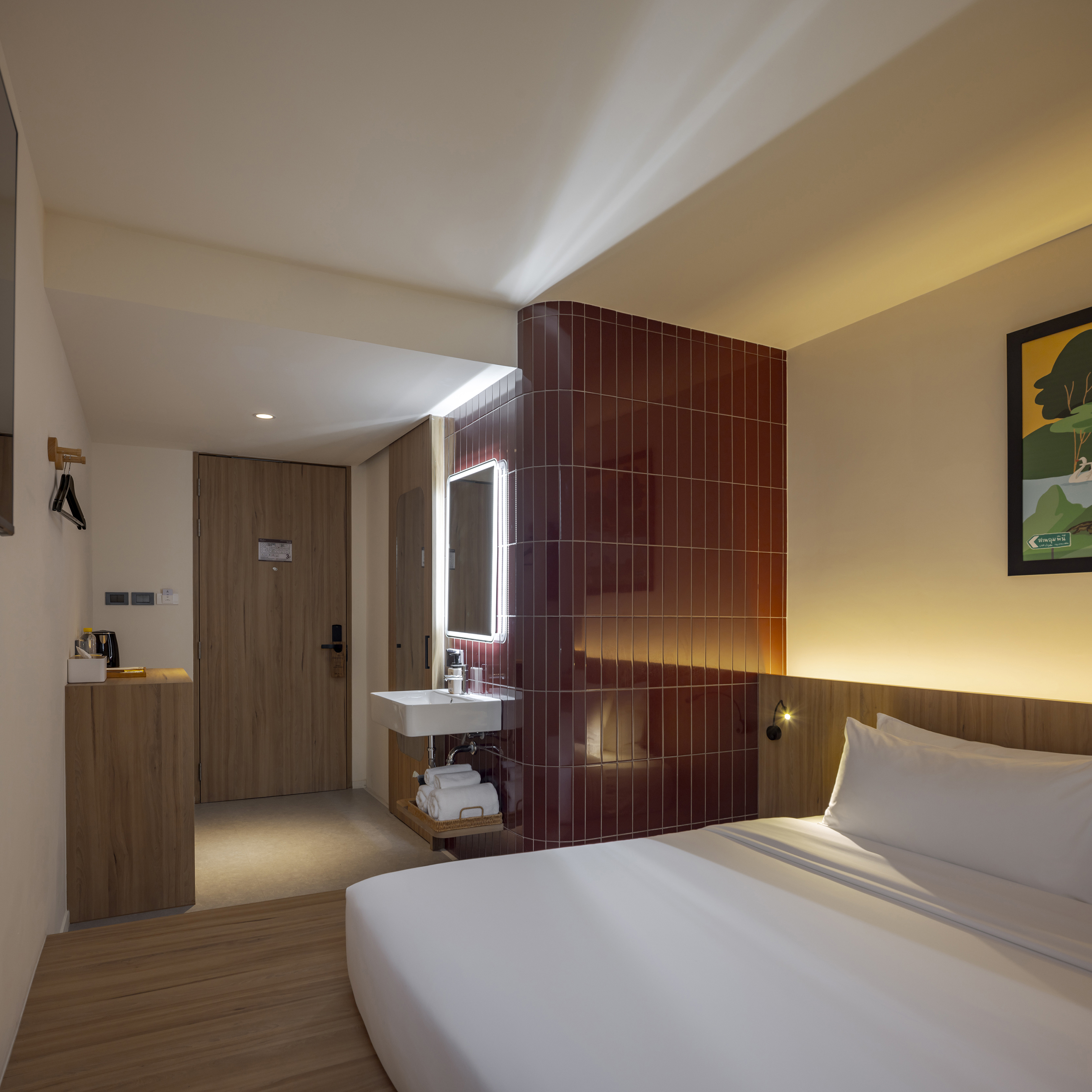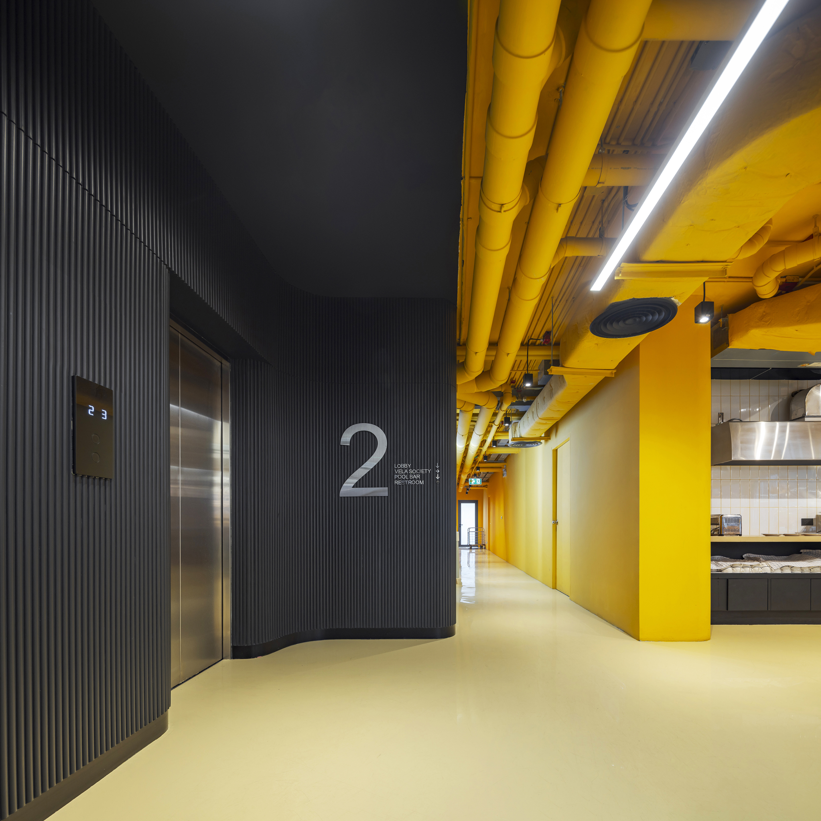 각 층은 층수를 표시하는 고유한 색으로 디자인된 엘리베이터 홀을 통해 개성을 드러낸다. 객실에 가까워질수록 색은 점차 차분하고 은은하게 전환되며, 숙면을 위한 안정적인 분위기를 조성한다. 그러나 차분함 속에서도 장난스러운 요소는 이어진다. 욕실 외벽은 다채로운 타일 패턴으로 마감되어 즐거운 리듬감을 공간에 불어넣는다.