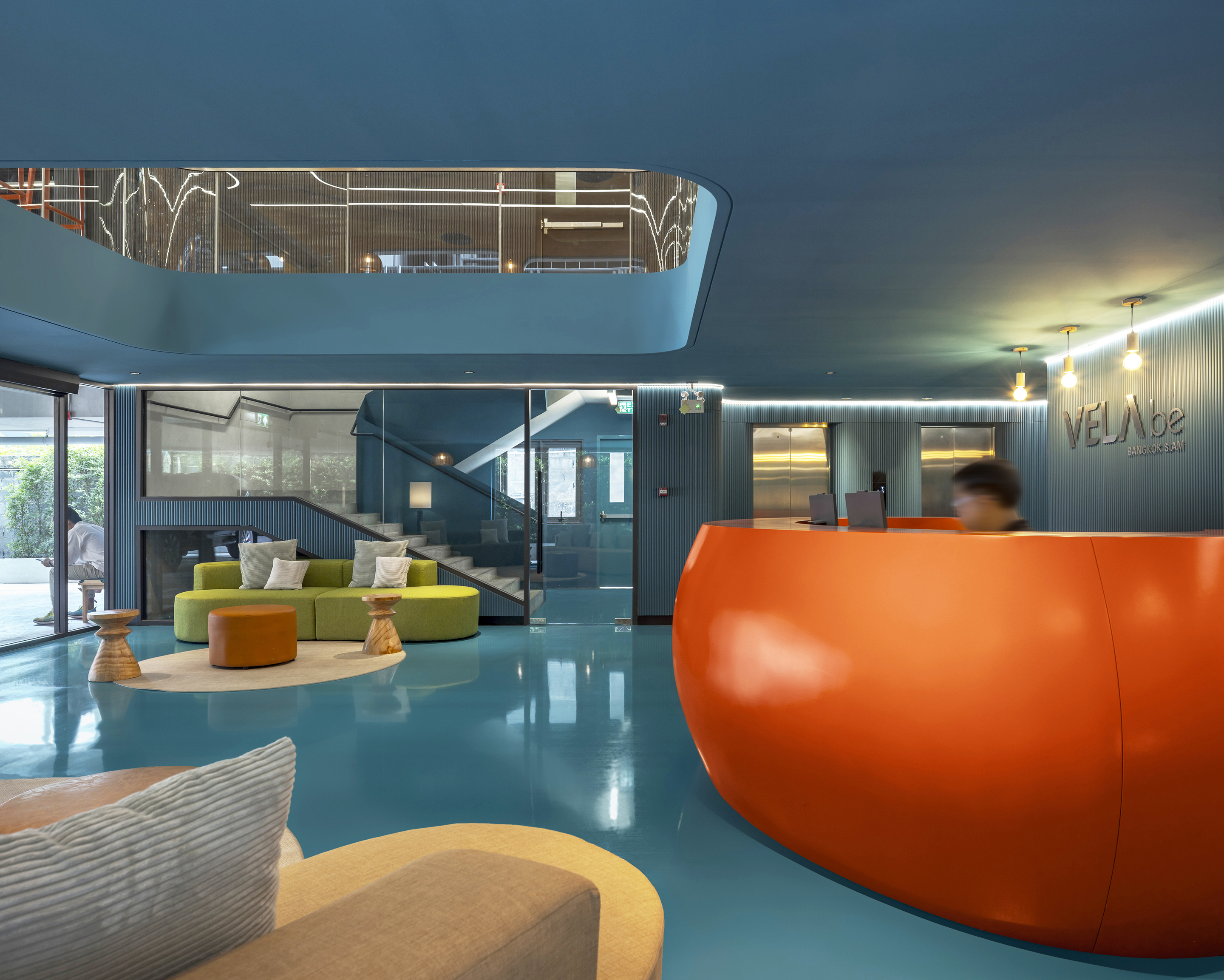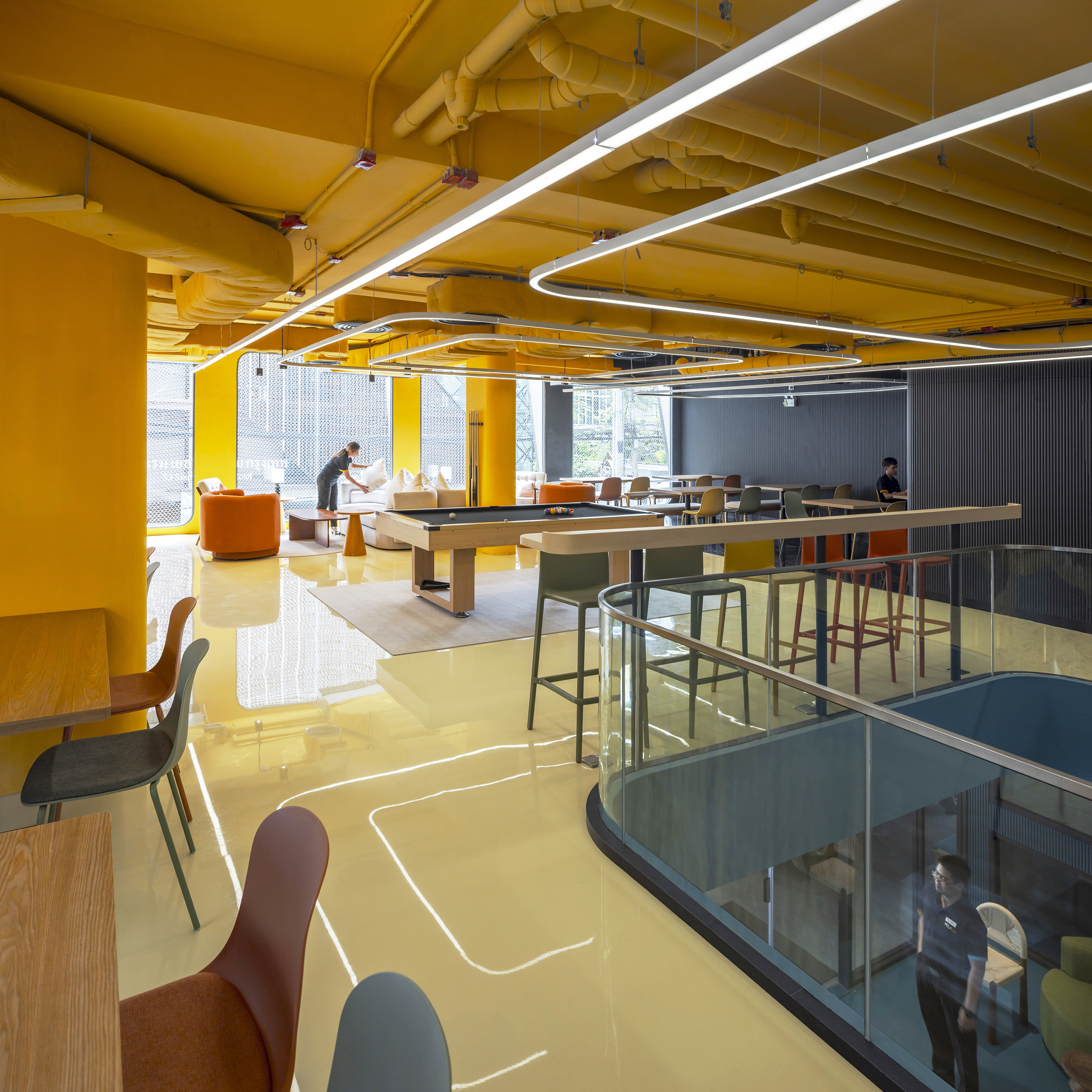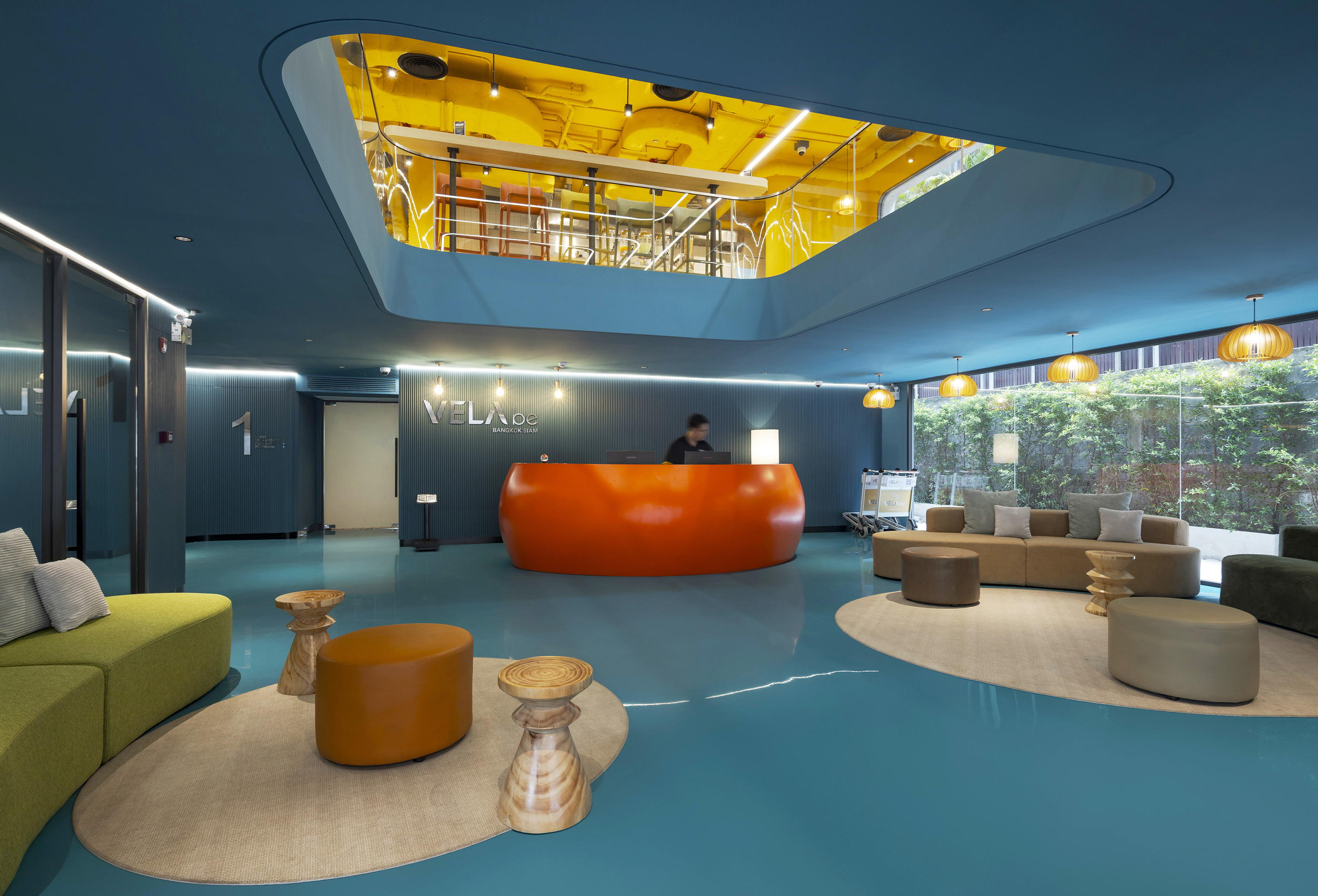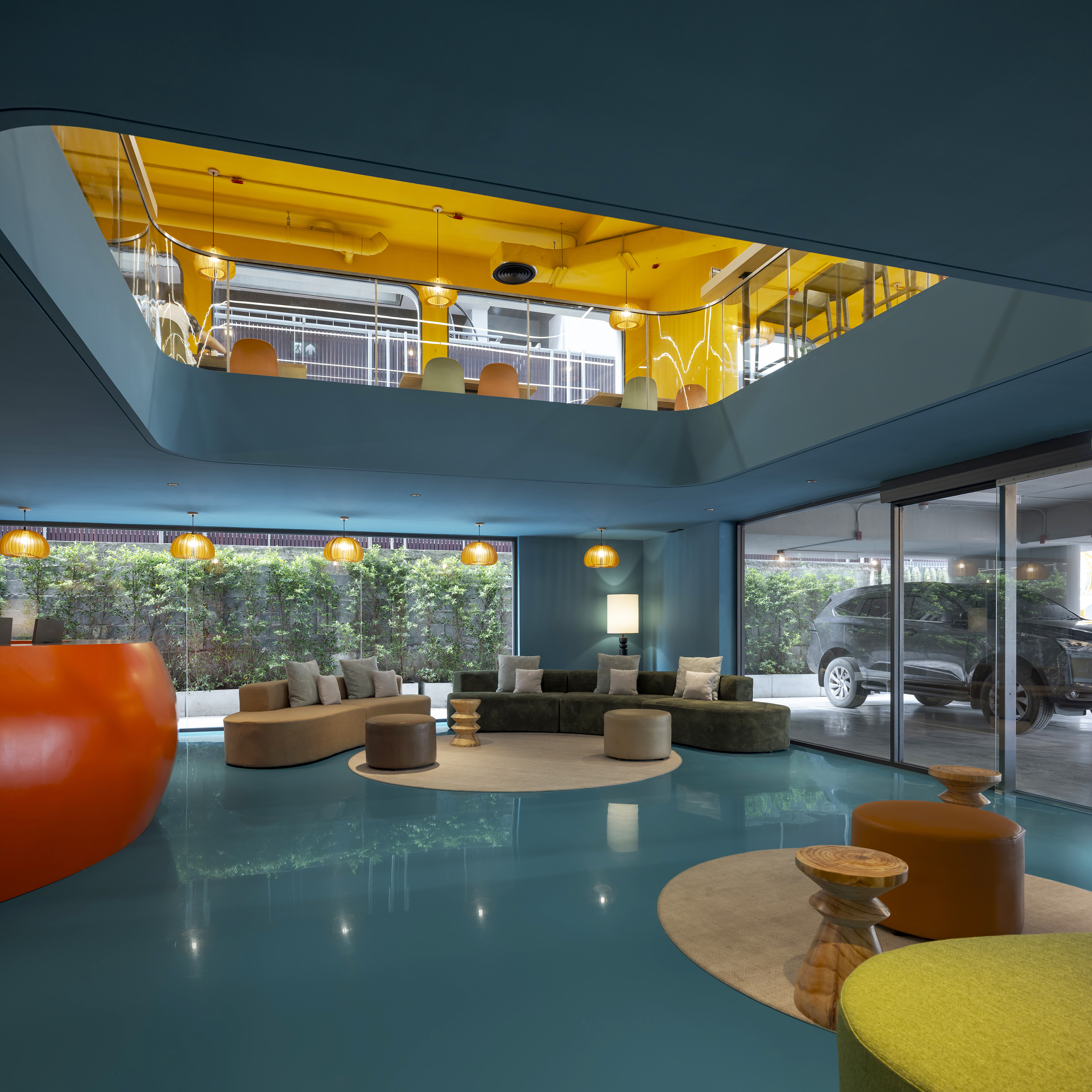 실내에 들어서면 태국의 본질을 담은 생동감 넘치는 색채 팔레트가 펼쳐진다. 공용 공간은 특히 화려한 색과 무늬로 꾸며져, 활기를 불어넣고 사람들 간의 교류를 촉진하는 장으로 작동한다. 로비는 초록색 배경 앞에 주황색 자갈 모양의 리셉션 데스크가 놓여 시각적 긴장감을 자아내며, 이중 높이의 천장은 공간을 시원하게 열어 위층의 노랑과 검정 톤의 커먼 에리어를 자연스럽게 드러낸다. 2층의 다목적 공간은 업무, 식사, 휴식이 모두 가능한 구성으로 호텔의 공동체적 성격을 강화한다.