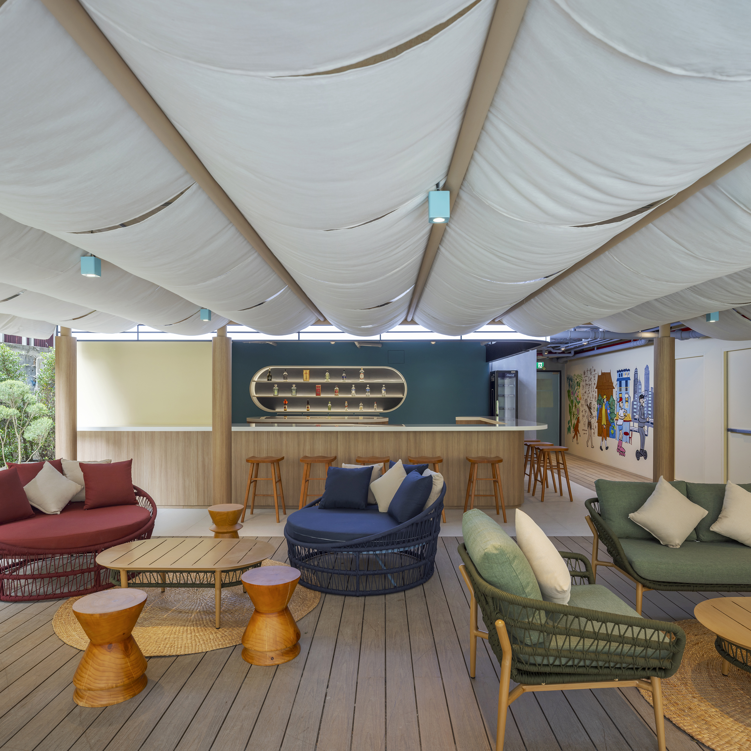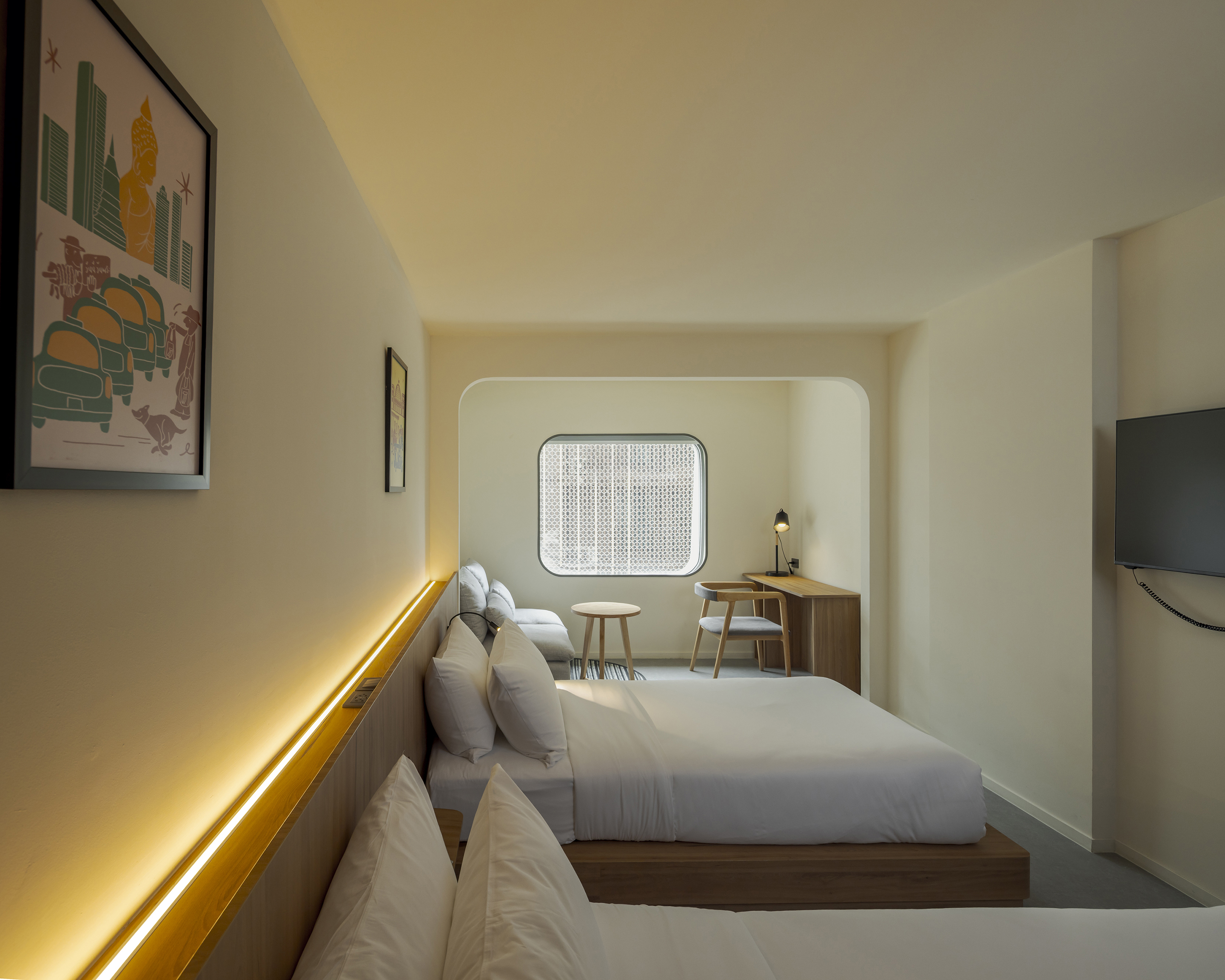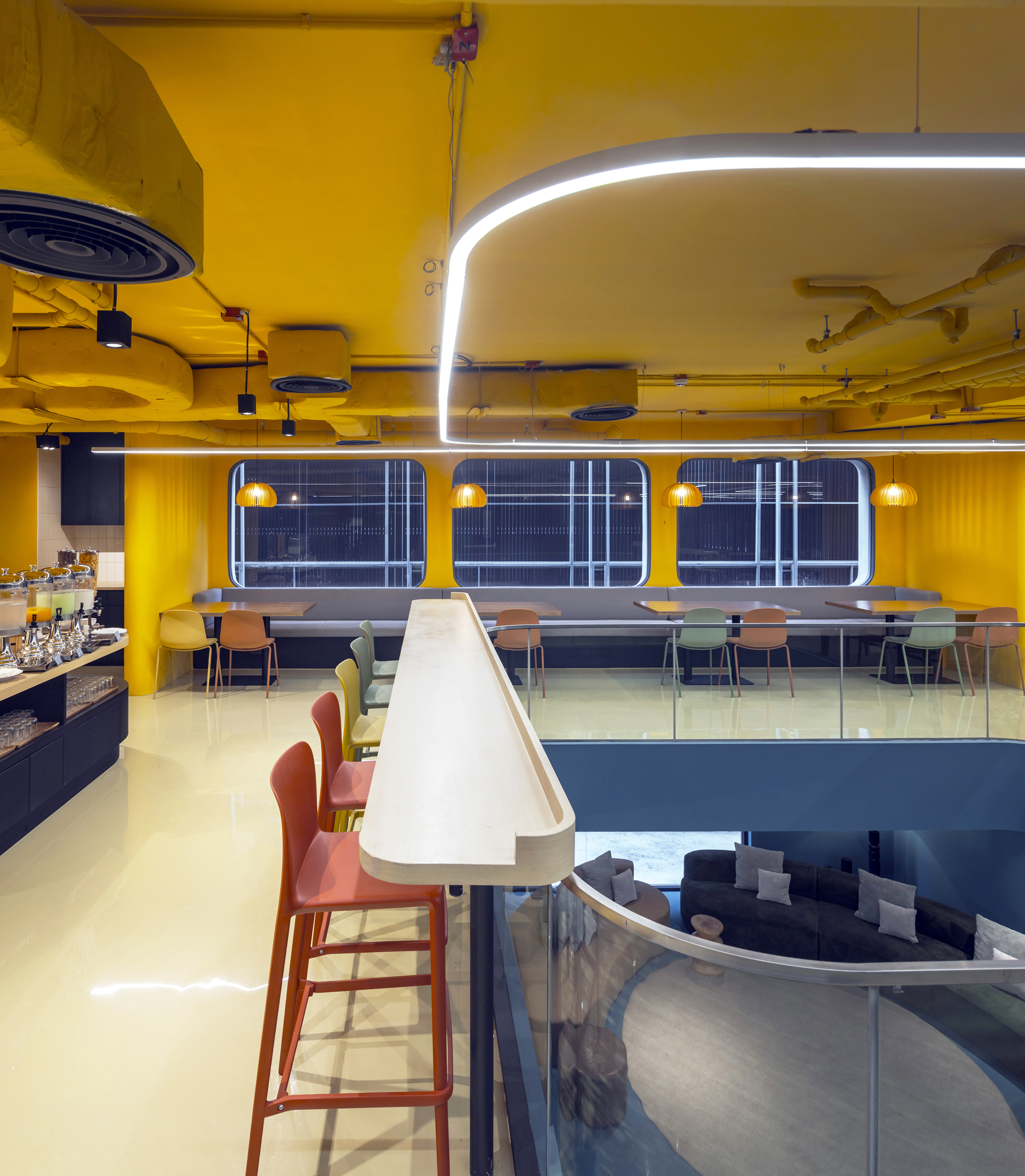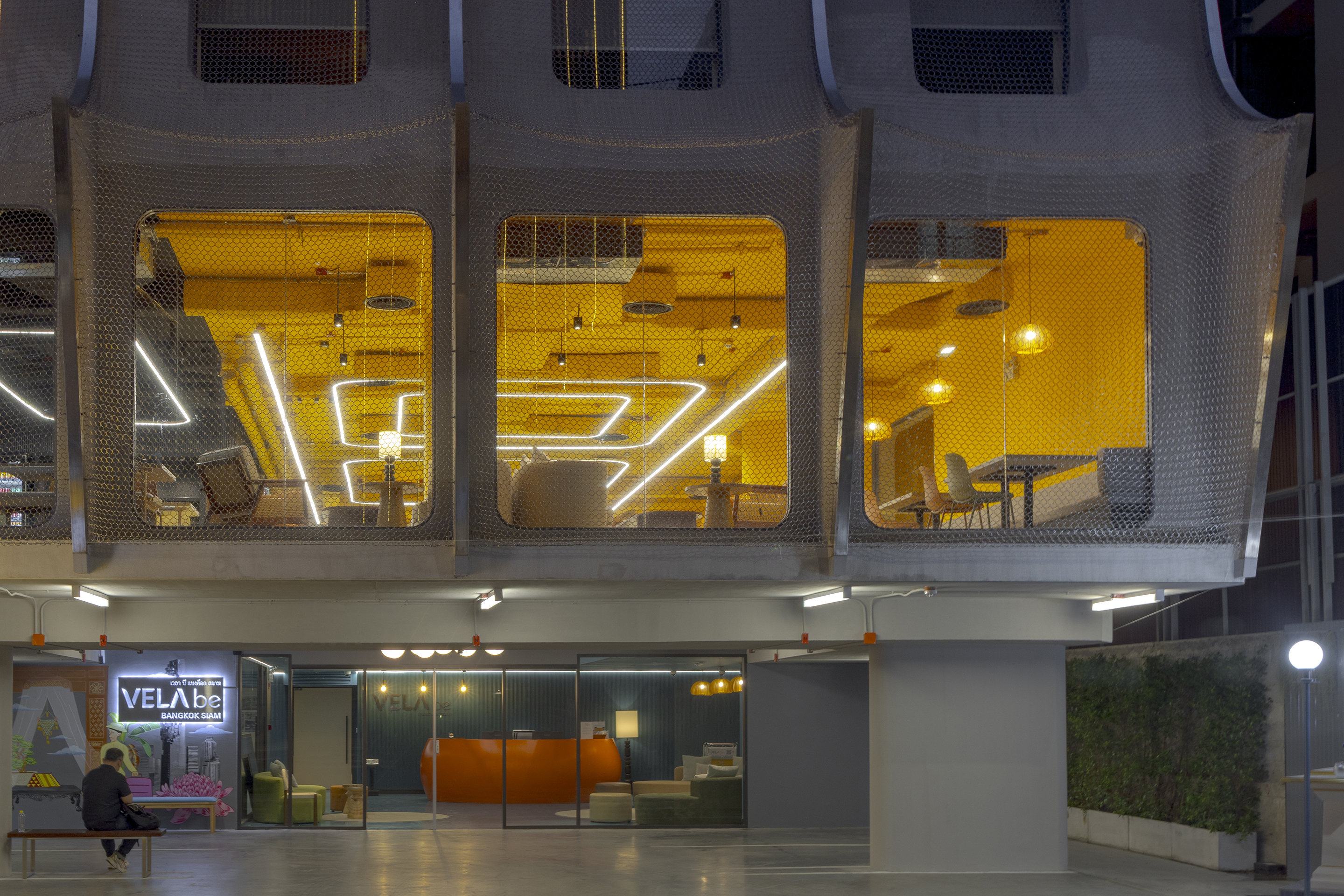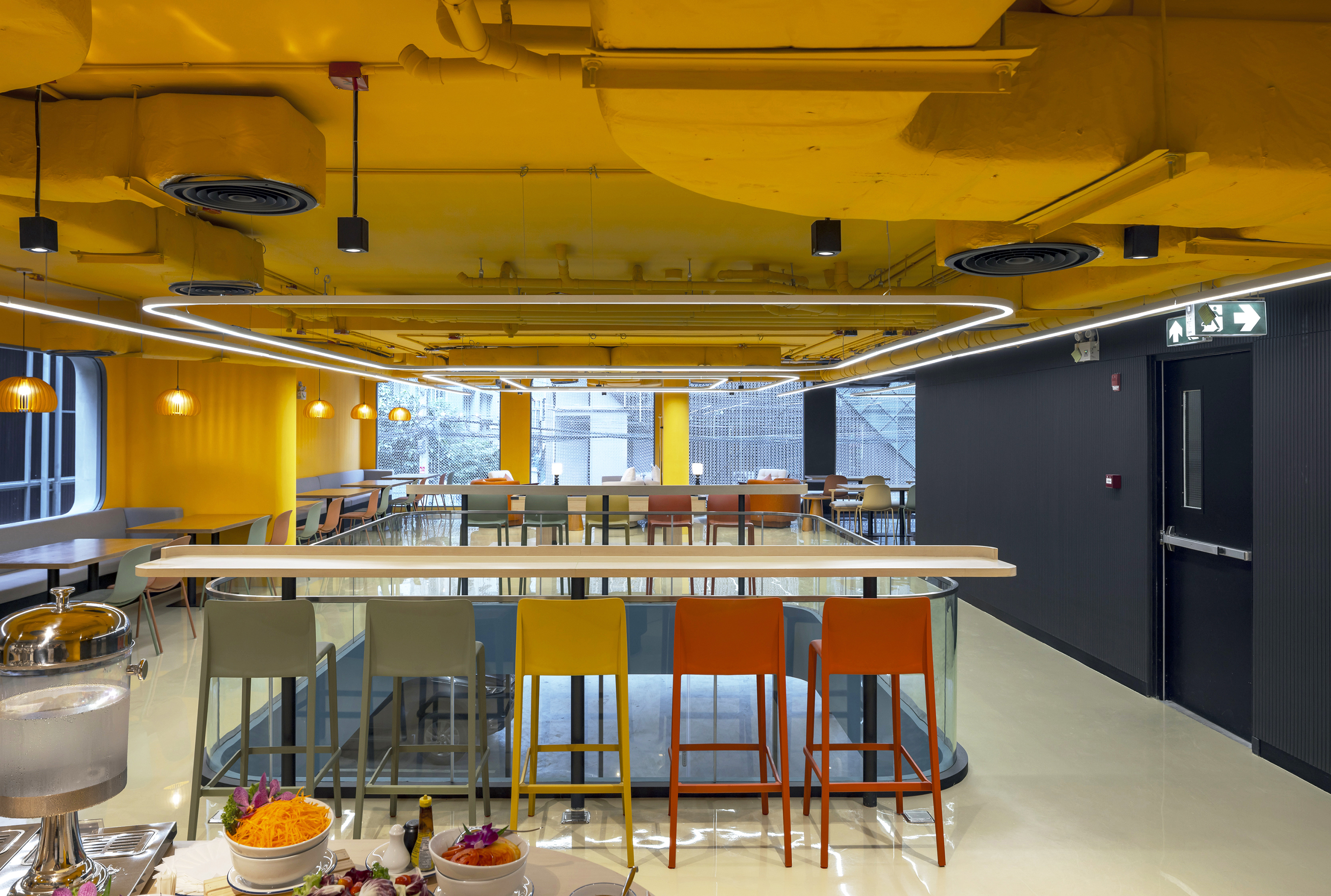 실내에 들어서면 태국의 본질을 담은 생동감 넘치는 색채 팔레트가 펼쳐진다. 공용 공간은 특히 화려한 색과 무늬로 꾸며져, 활기를 불어넣고 사람들 간의 교류를 촉진하는 장으로 작동한다. 로비는 초록색 배경 앞에 주황색 자갈 모양의 리셉션 데스크가 놓여 시각적 긴장감을 자아내며, 이중 높이의 천장은 공간을 시원하게 열어 위층의 노랑과 검정 톤의 커먼 에리어를 자연스럽게 드러낸다. 2층의 다목적 공간은 업무, 식사, 휴식이 모두 가능한 구성으로 호텔의 공동체적 성격을 강화한다.