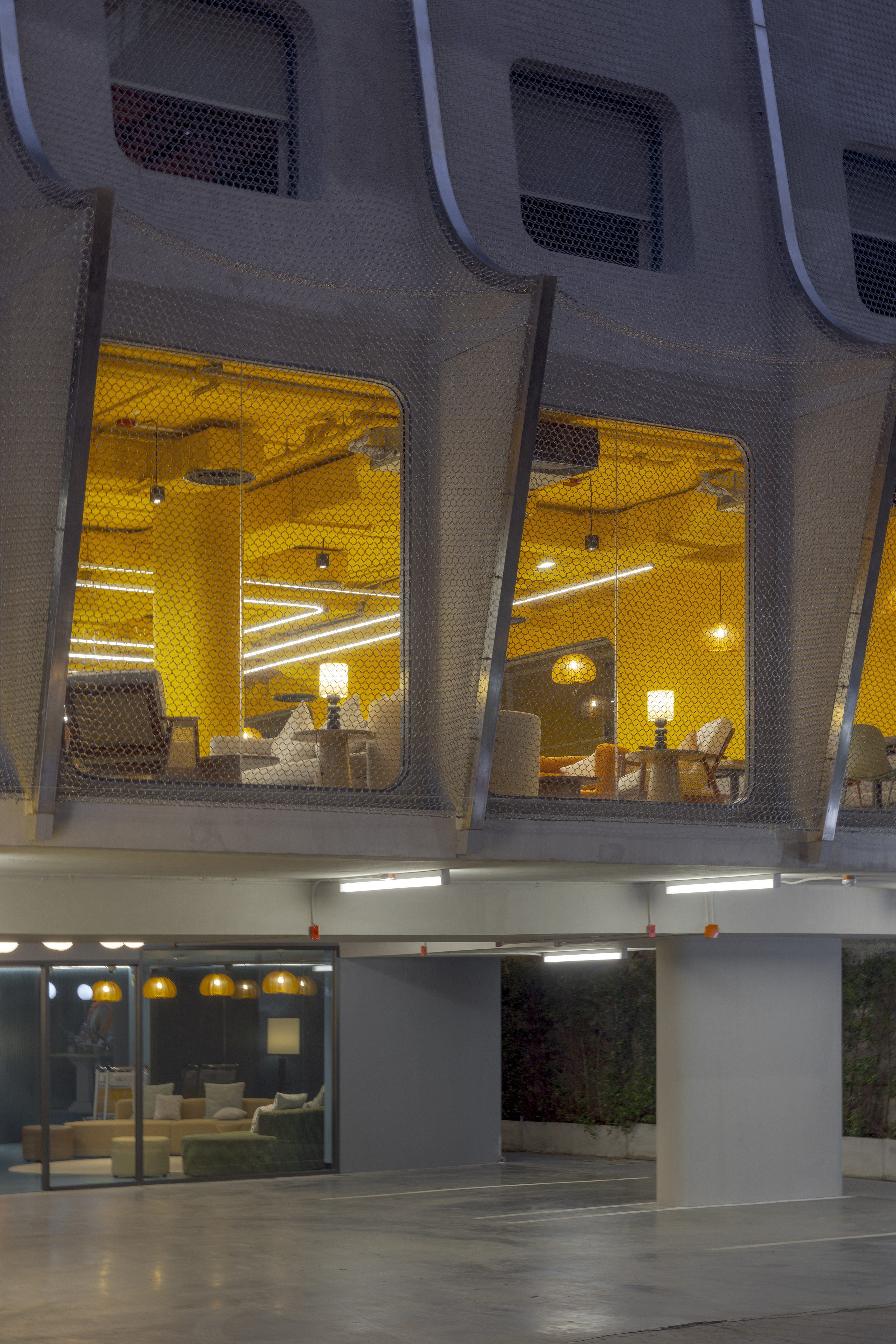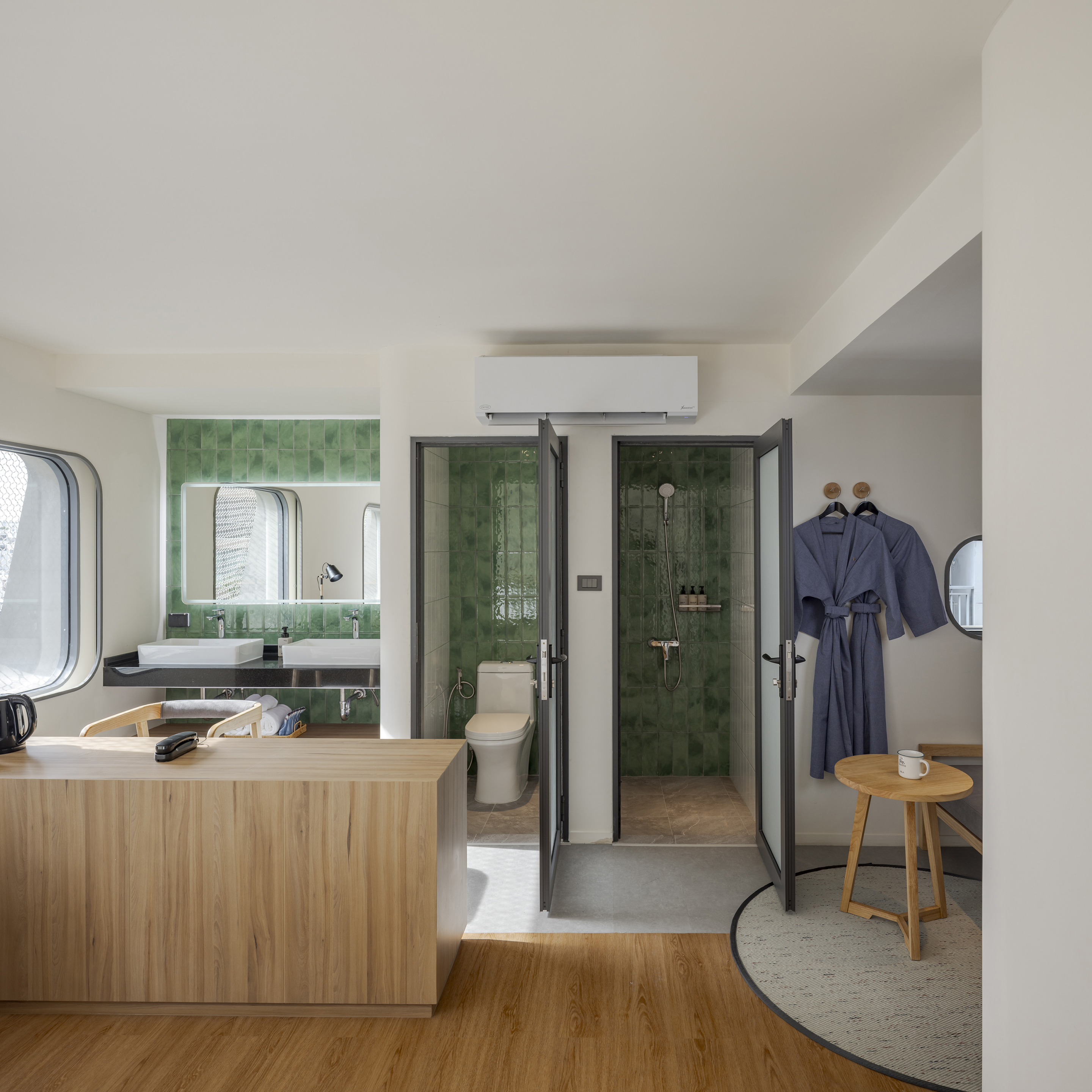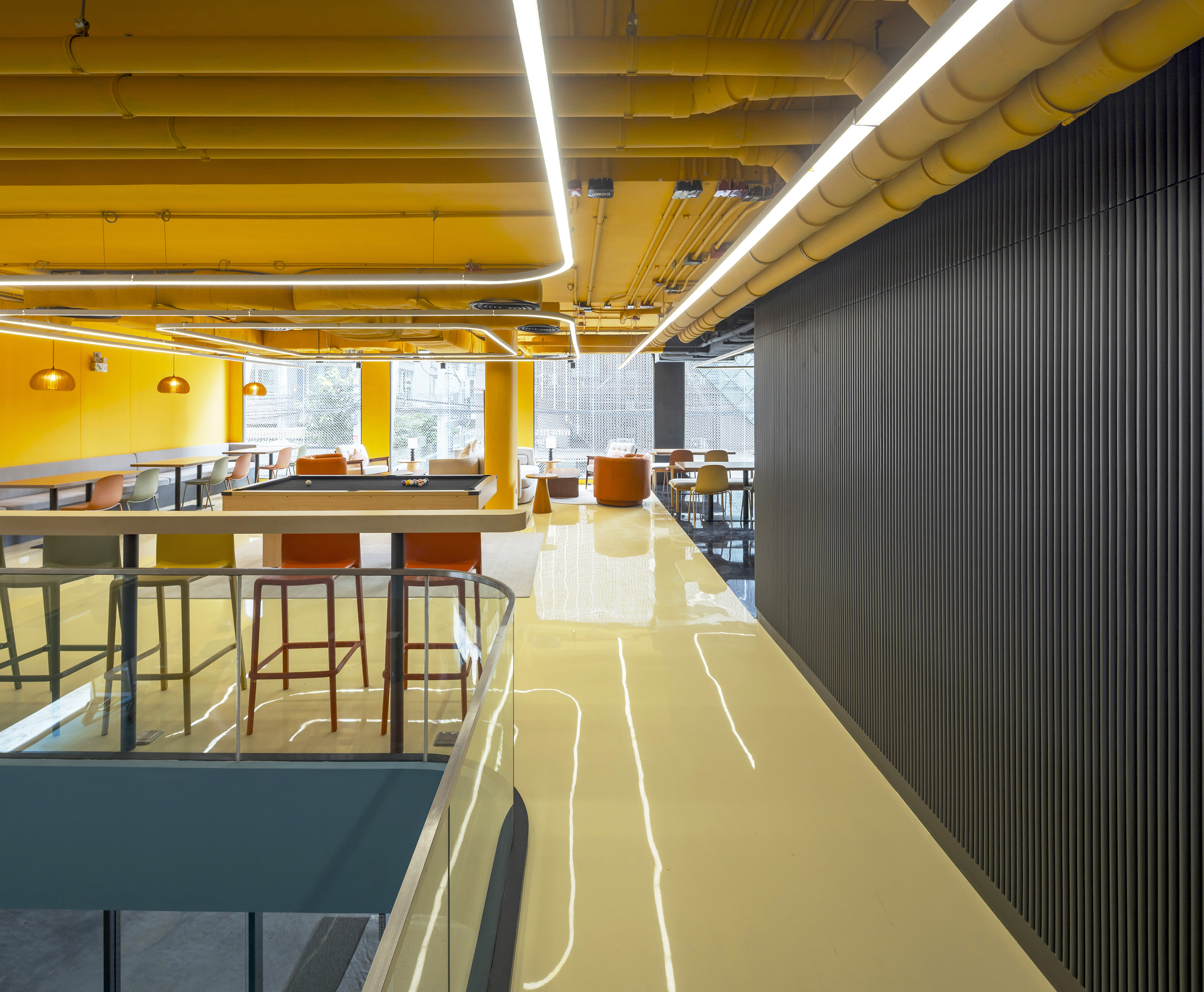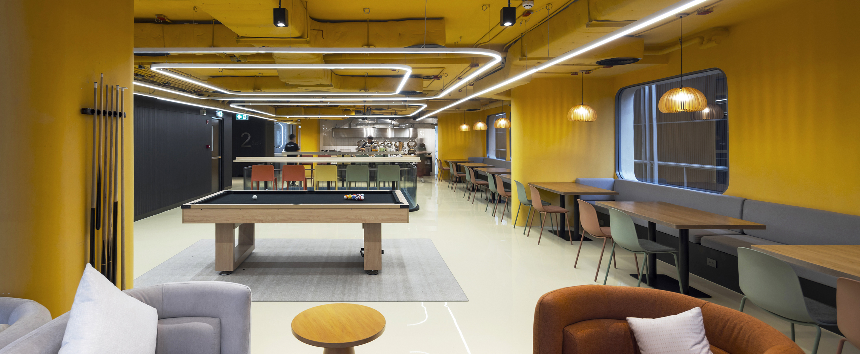 실내에 들어서면 태국의 본질을 담은 생동감 넘치는 색채 팔레트가 펼쳐진다. 공용 공간은 특히 화려한 색과 무늬로 꾸며져, 활기를 불어넣고 사람들 간의 교류를 촉진하는 장으로 작동한다. 로비는 초록색 배경 앞에 주황색 자갈 모양의 리셉션 데스크가 놓여 시각적 긴장감을 자아내며, 이중 높이의 천장은 공간을 시원하게 열어 위층의 노랑과 검정 톤의 커먼 에리어를 자연스럽게 드러낸다. 2층의 다목적 공간은 업무, 식사, 휴식이 모두 가능한 구성으로 호텔의 공동체적 성격을 강화한다.