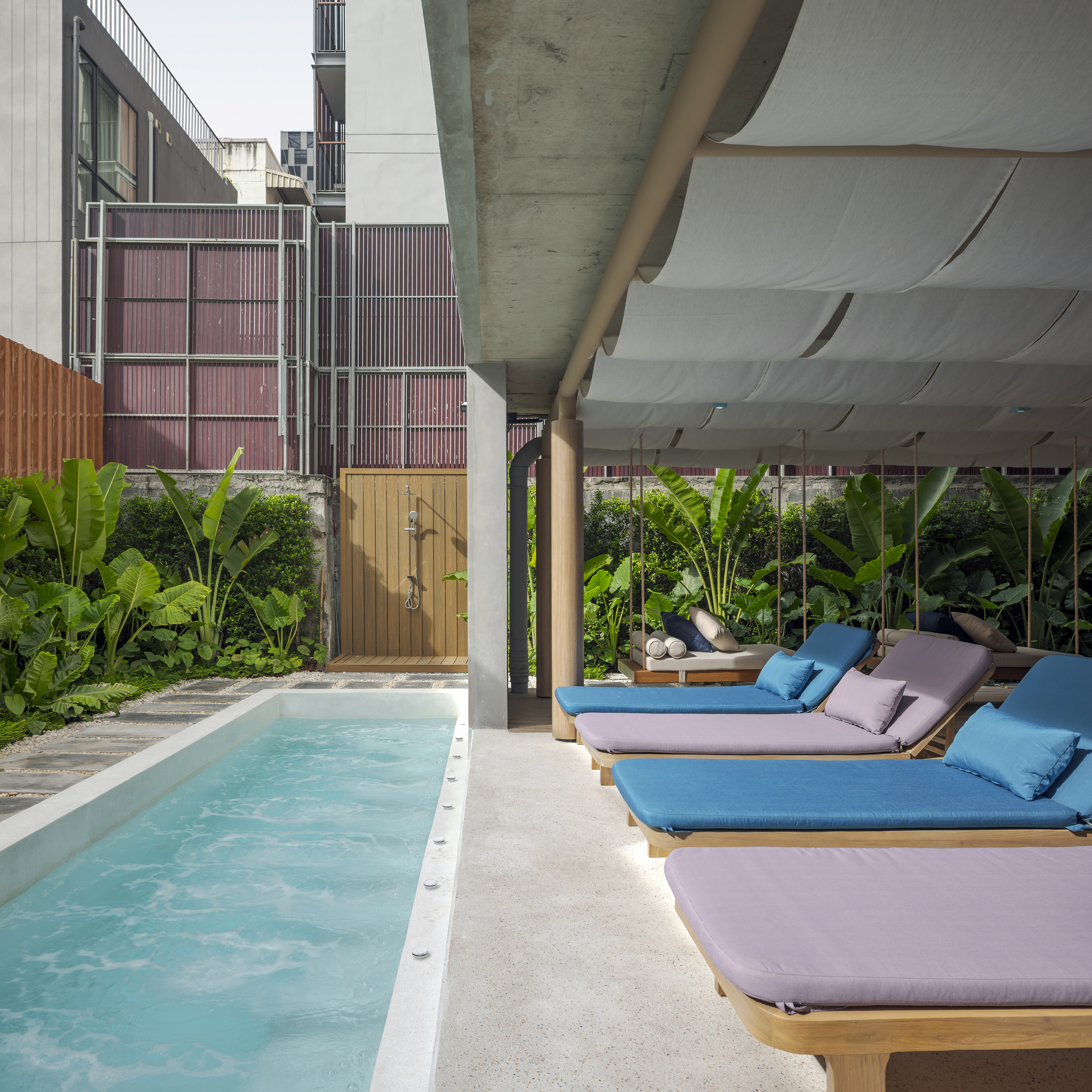 로비 뒤편에는 수영장 바가 위치해 있다. 울창한 녹지와 물의 요소가 어우러진 이곳은 도심 속 오아시스 같은 고요함을 제공하며, 활기찬 호텔 내부 분위기와 극적인 대조를 이룬다.