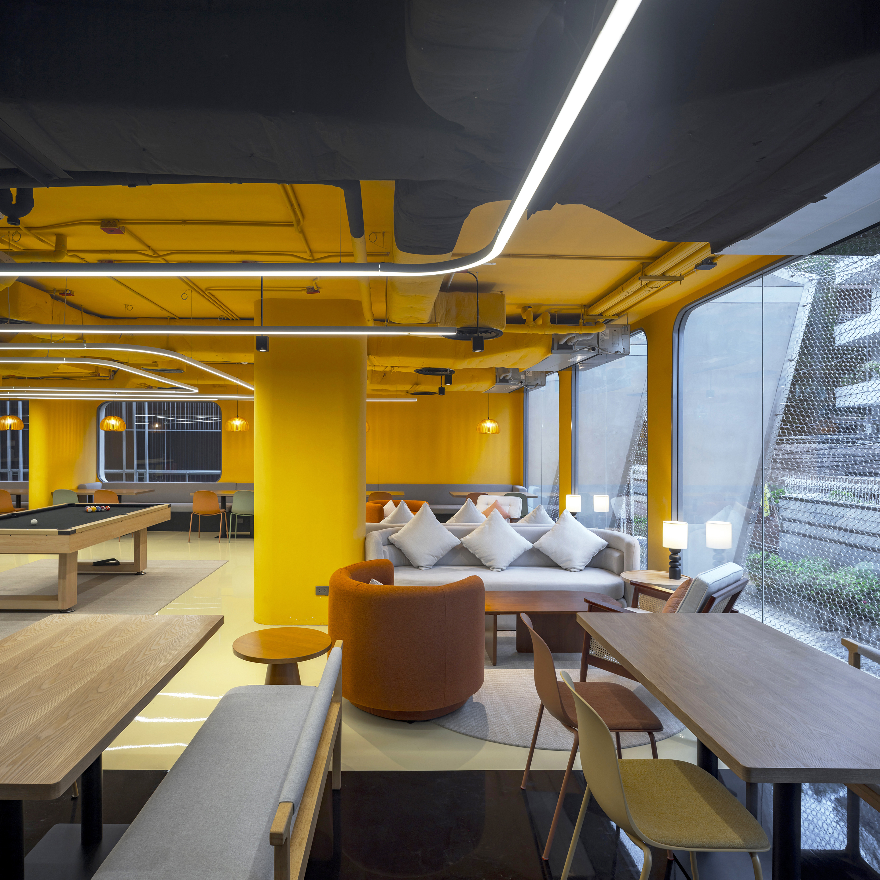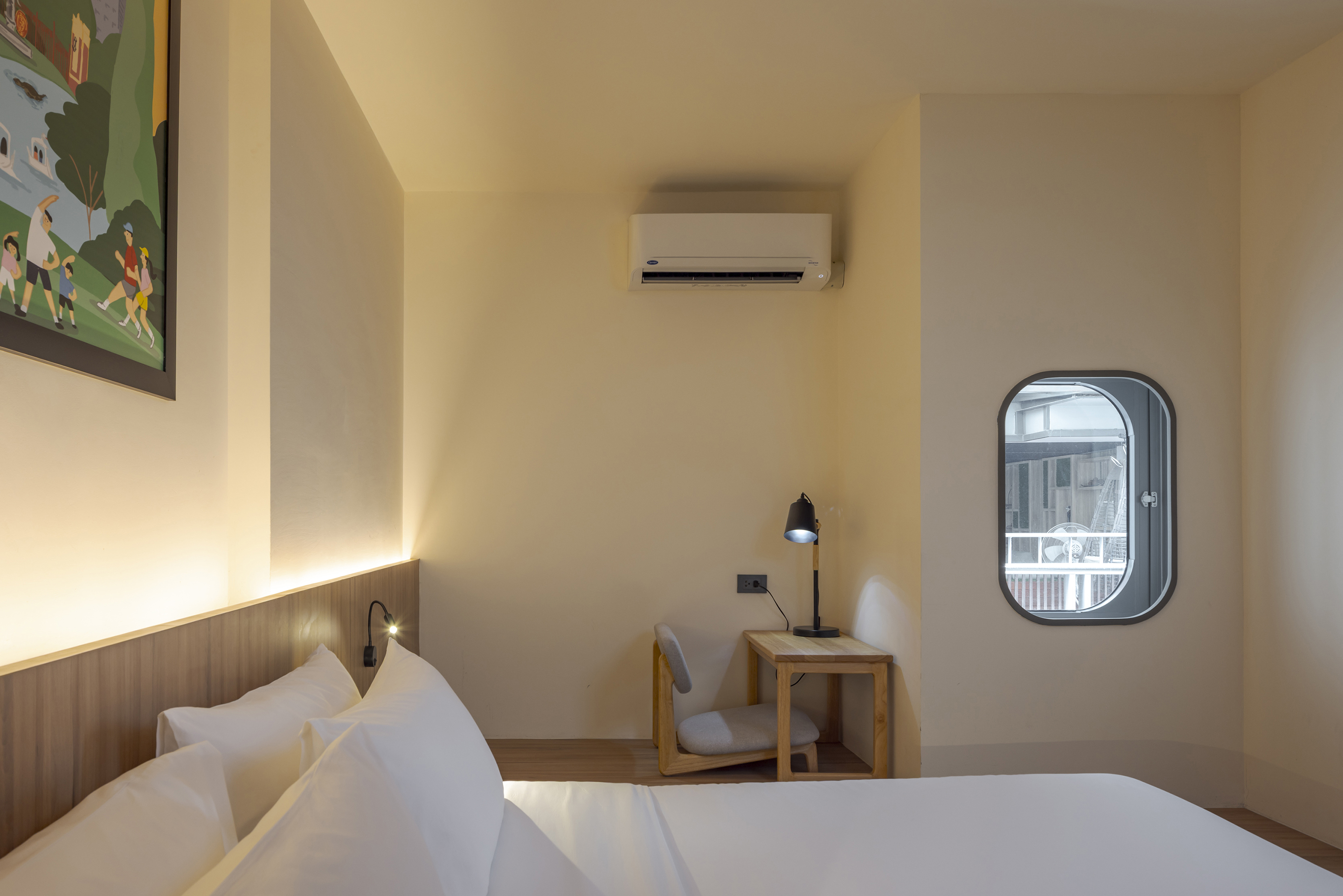 실내에 들어서면 태국의 본질을 담은 생동감 넘치는 색채 팔레트가 펼쳐진다. 공용 공간은 특히 화려한 색과 무늬로 꾸며져, 활기를 불어넣고 사람들 간의 교류를 촉진하는 장으로 작동한다. 로비는 초록색 배경 앞에 주황색 자갈 모양의 리셉션 데스크가 놓여 시각적 긴장감을 자아내며, 이중 높이의 천장은 공간을 시원하게 열어 위층의 노랑과 검정 톤의 커먼 에리어를 자연스럽게 드러낸다. 2층의 다목적 공간은 업무, 식사, 휴식이 모두 가능한 구성으로 호텔의 공동체적 성격을 강화한다.