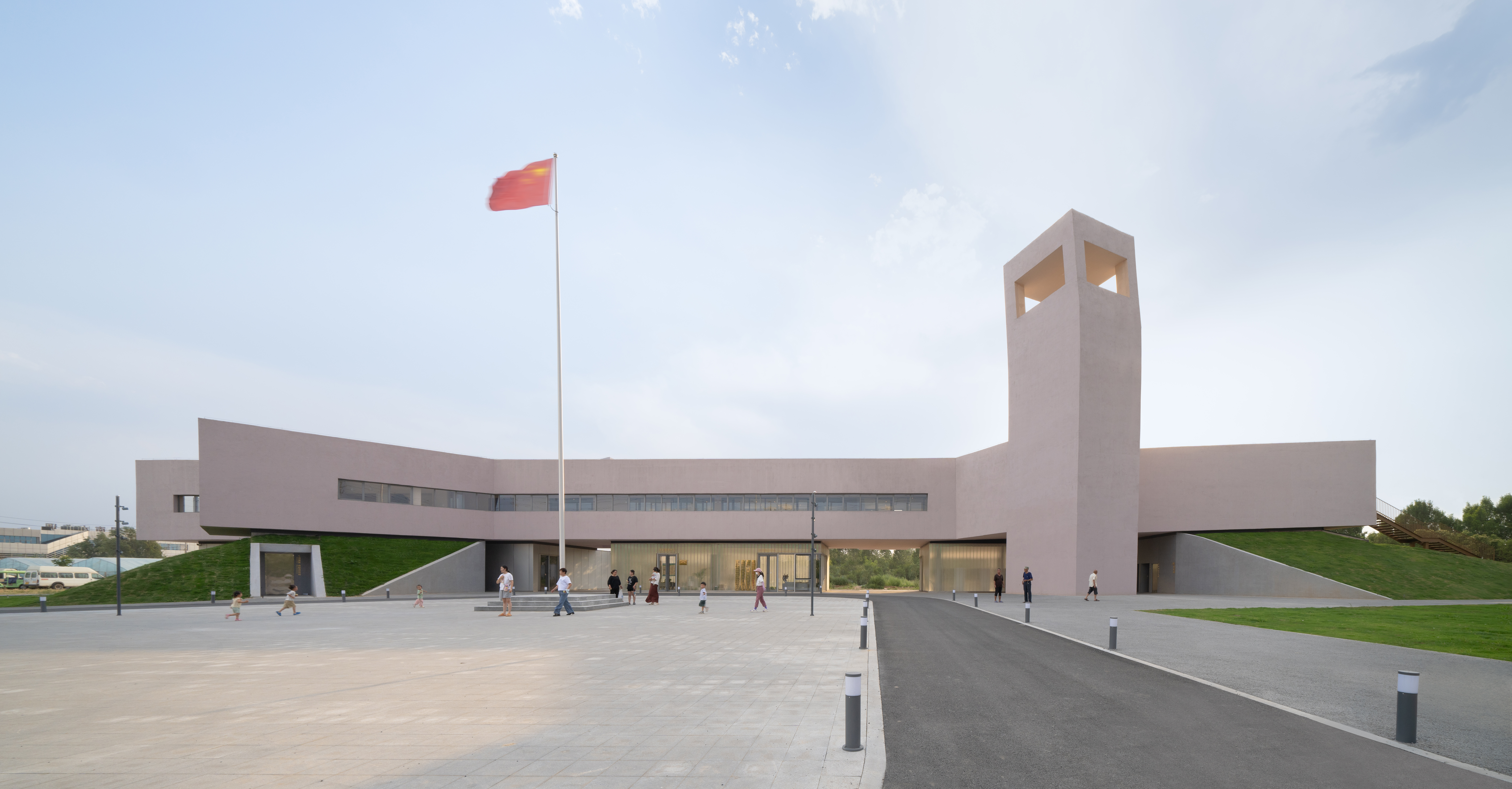 대지는 남북으로 길게 뻗은 협소한 공간으로, 주민들이 장터를 열던 장소이다. 서쪽은 남수북조 수로변 녹지대, 동쪽은 개방된 농경지로 둘러싸여 있다. 설계는 부지의 공공성을 유지하고 수변의 자연스러운 기복 지형을 보존하는 것을 우선시했다. 긴 부지가 주는 단조롭고 폐쇄적인 인상을 깨기 위해, 공공 서비스 홀, 도서관 겸 카페, 화장실, 노인 돌봄 시설 등 대중 친화적 프로그램을 반투명·반사 재질의 박스형 매스와 조경 언덕 속에 흩어 배치했다. 이를 통해 녹지와 흐름이 가득한 가볍고 열린 공간을 형성하고, 주민과 관광객 모두의 활동을 지원한다.