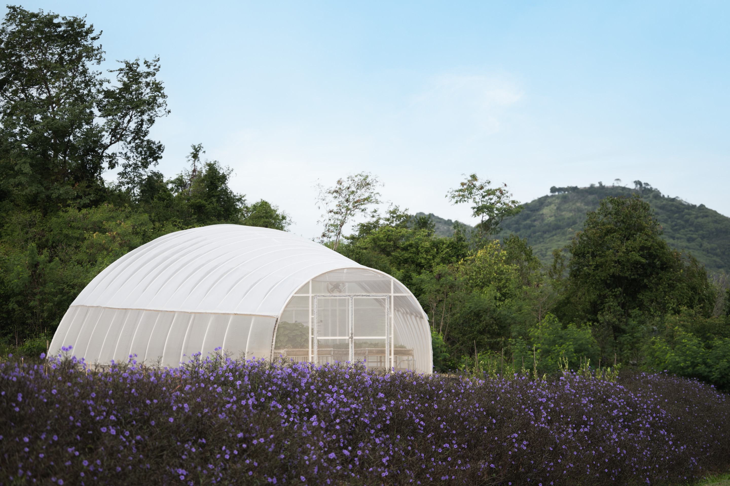 내부로 더 들어가면 농업 온실 구역이 유틸리티존 옆에 자리한다. 온실은 바람과 햇빛의 방향에 맞춰 배치되었으며, 지붕 높이 차이를 두어 식물의 생육 특성에 대응했다. 첫 번째 온실은 2.75~5.00m 높이로 허브와 채소류(깻잎, 로즈마리, 샐러리, 고수, 고추, 바질 등)를, 두 번째 온실은 3.00~7.50m 높이로 멜론, 토마토, 무화과, 샐러드 채소를 재배한다. 이곳은 숙박객 식당뿐 아니라 방콕 레스토랑에도 농산물을 공급한다.