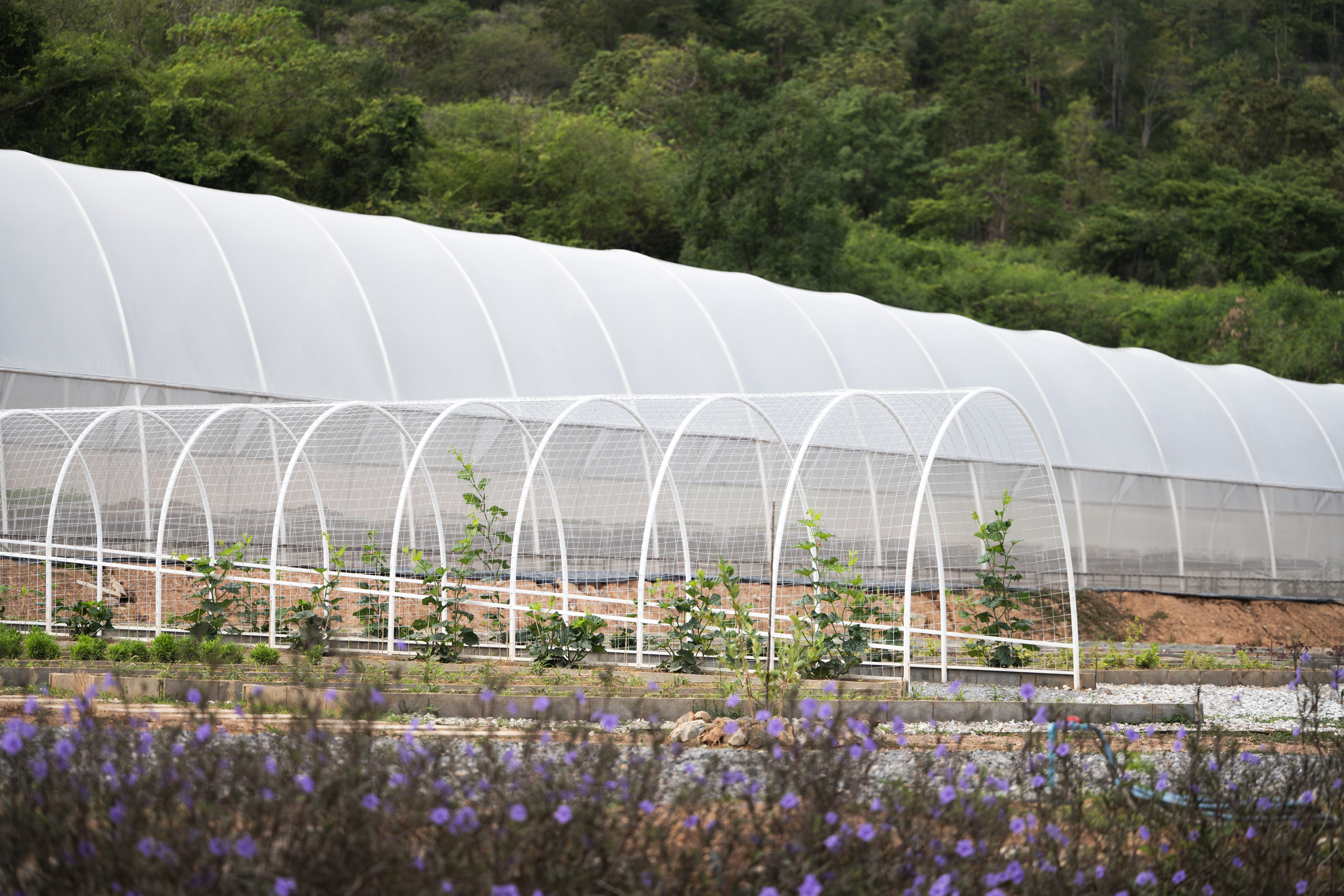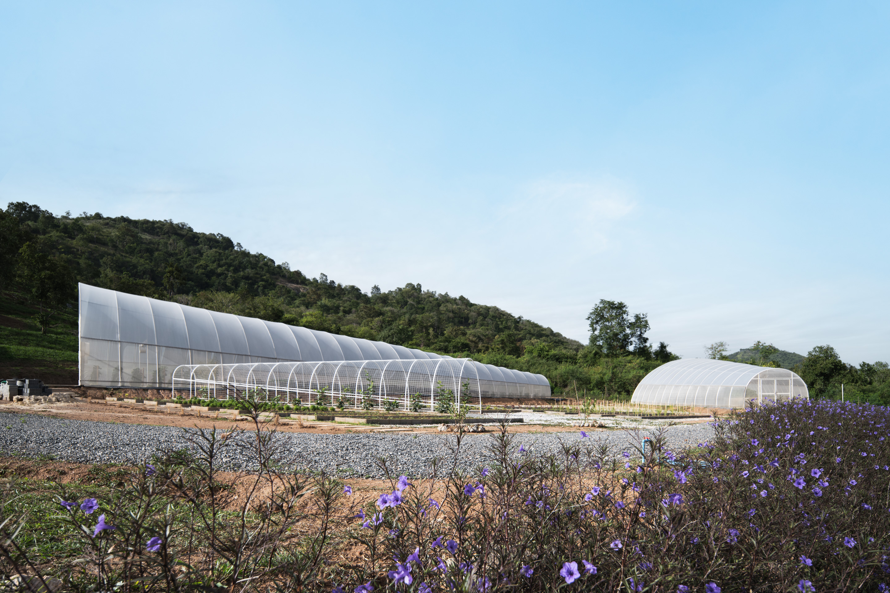 내부로 더 들어가면 농업 온실 구역이 유틸리티존 옆에 자리한다. 온실은 바람과 햇빛의 방향에 맞춰 배치되었으며, 지붕 높이 차이를 두어 식물의 생육 특성에 대응했다. 첫 번째 온실은 2.75~5.00m 높이로 허브와 채소류(깻잎, 로즈마리, 샐러리, 고수, 고추, 바질 등)를, 두 번째 온실은 3.00~7.50m 높이로 멜론, 토마토, 무화과, 샐러드 채소를 재배한다. 이곳은 숙박객 식당뿐 아니라 방콕 레스토랑에도 농산물을 공급한다.